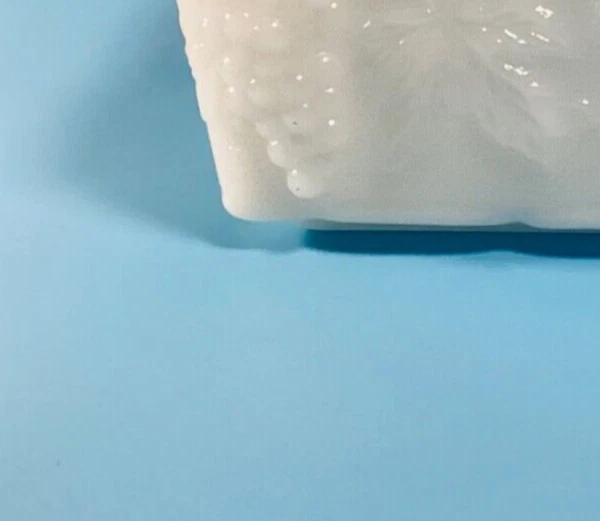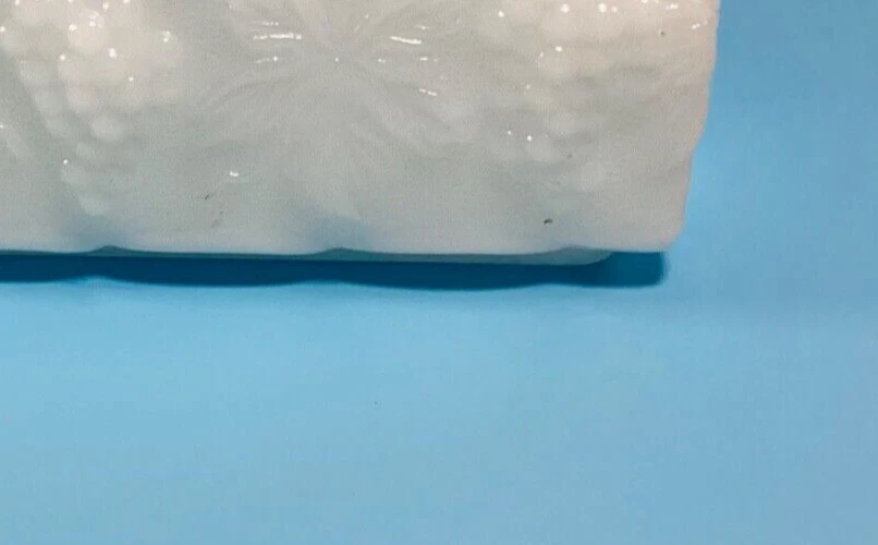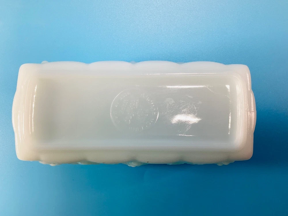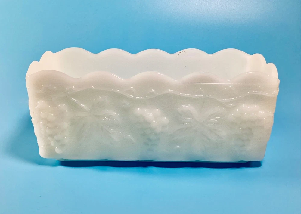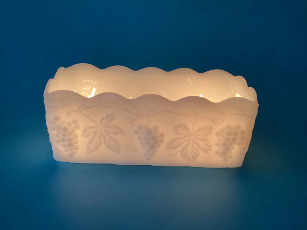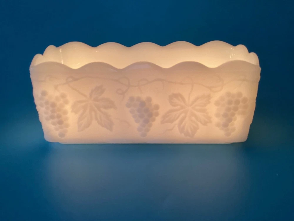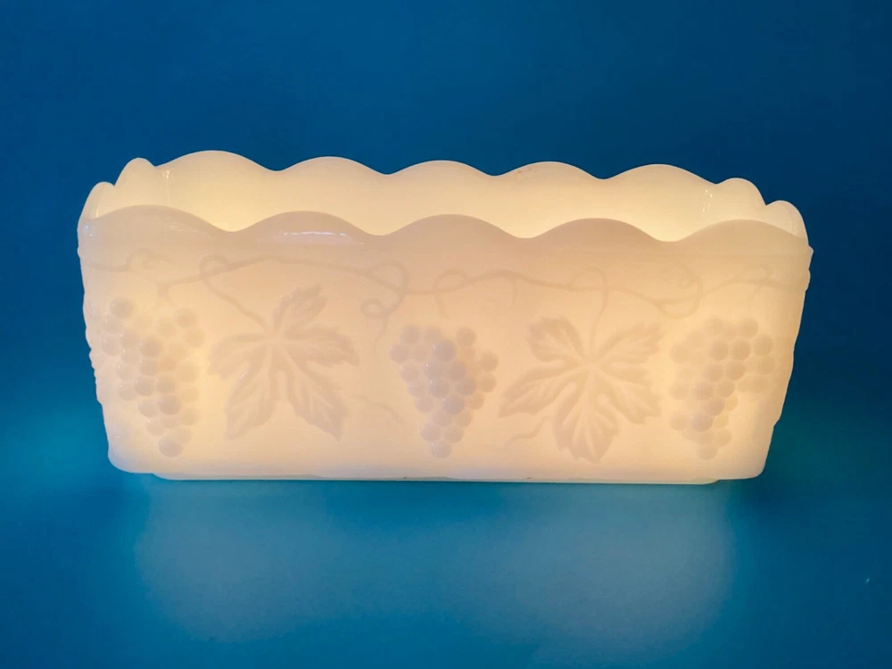 Country/Region of Manufacture: United States Pattern: Grapes & Leaves Item Length: 7.25in Features: Decorative Color: White Antique: No Item Height: 3.25in Product Line: Fire-King Handmade: No Original/Licensed Reproduction: Original Material: Glass Style: Mid-Century Modern Era: Mid 20th Century (1941-1969) Subject: Planter Box Suitable For: Flameless/LED Candle, Floating Candle, Tea Light, Votive Candle Backstamp: Impressed Time Period Manufactured: 1940-1949 Type: Candle Holder Vintage: Yes Theme: Grapes Year Manufactured: 1950 Signed By: Fire King Production Style: Milk Glass Brand: Anchor Hocking Finish: Glossy Model: Anchor Hocking Fire King Origin: North American Room: Any Room Signed: Yes Item Weight: 1lb 10oz