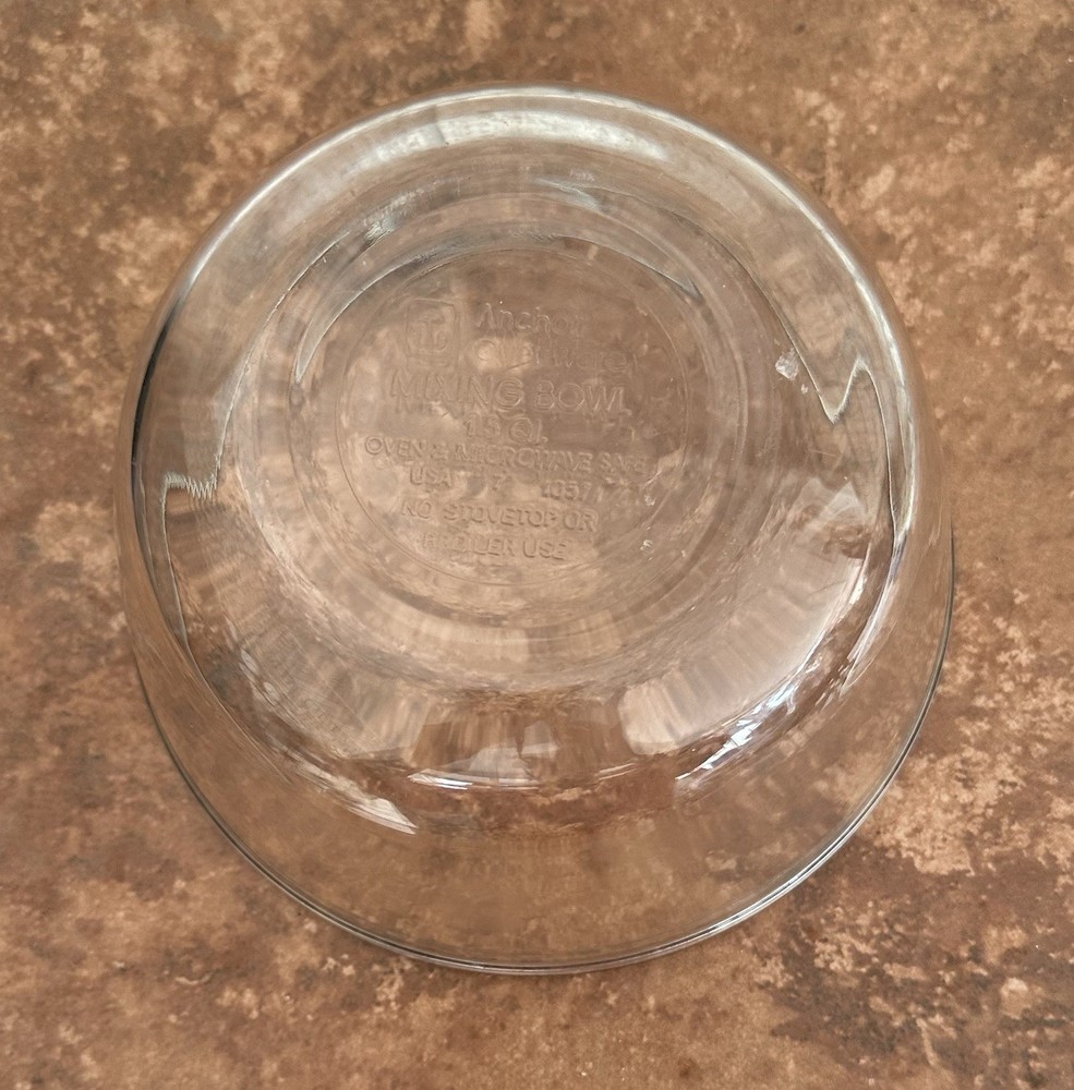Experience the durability and convenience of the Anchor Hocking Glass Mixing Bowl, a must-have for any kitchen. With a 1.5qt capacity, this clear, solid-patterned bowl is perfect for a variety of mixing tasks, whether you're whisking up a batch of cookies or marinating meats. The round shape and 7.25-inch diameter make it an ideal size for most kitchen needs. Crafted from high-quality glass, this mixing bowl is both oven and microwave safe, ensuring it's as versatile as it is practical. The printed finish adds a touch of elegance to the piece, while the sturdy construction reflects the quality associated with the Anchor Hocking brand. Designed and manufactured in the United States, this bowl is a genuine original that promises to be a long-lasting addition to your kitchen. Thank you for support my small business!