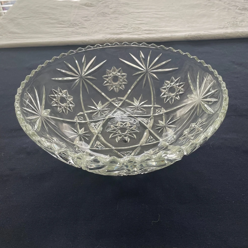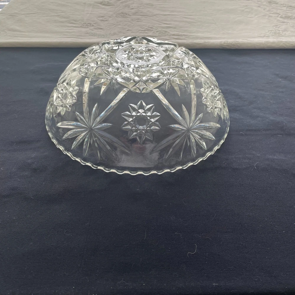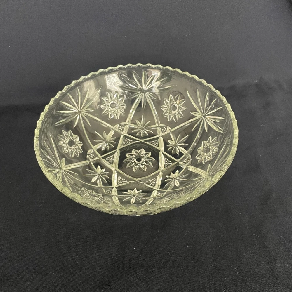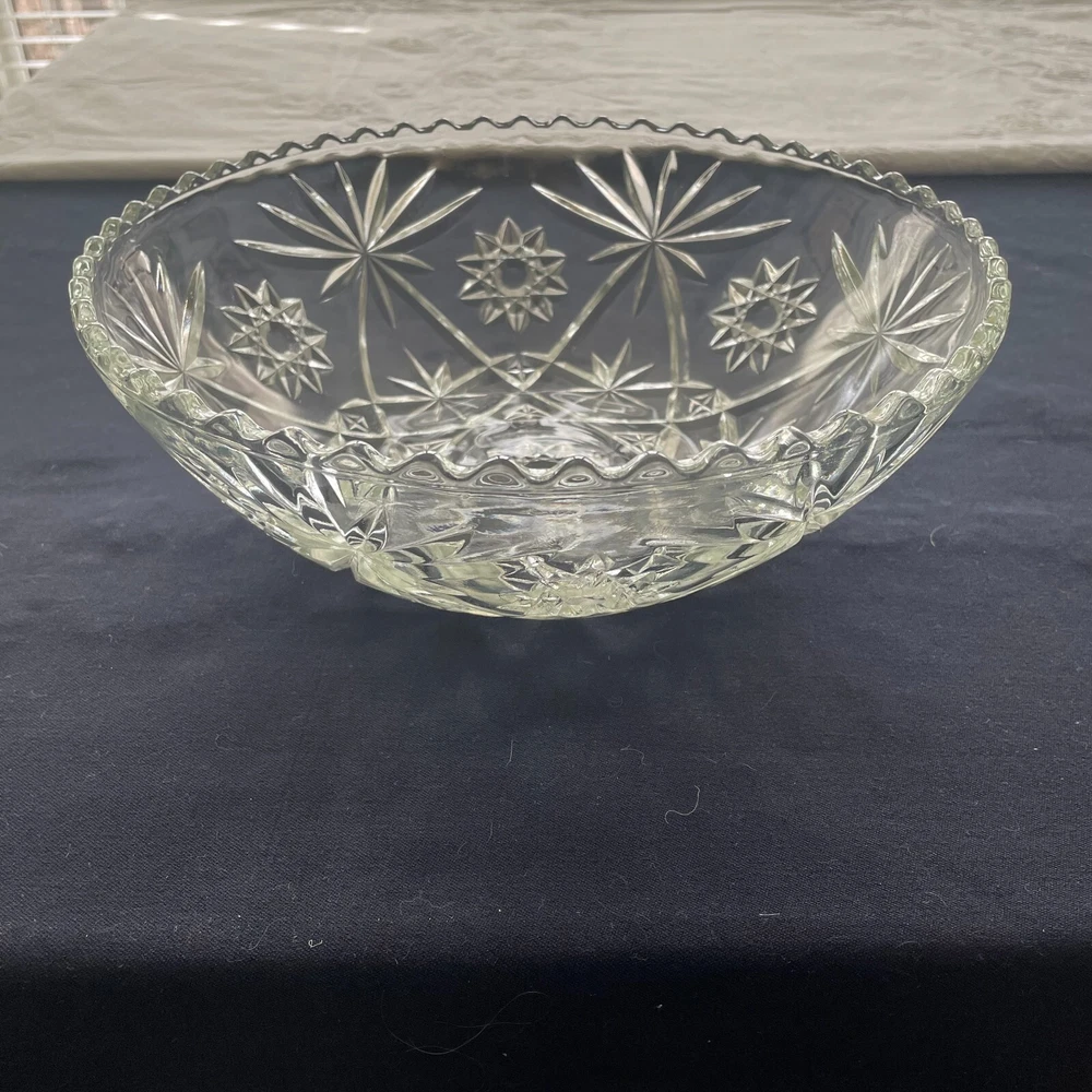 Anchor Hocking Large Round Clear Glass Bowl Sunburst and Star of David Pattern Deep Cut Early American Pressed Glass Gently Scalloped Sawtooth Edge Excellent Vintage. Here is a lovely vintage Anchor Hocking clear deep cut EAPG bowl with the Sunburst and Star of David pattern and stunning refraction. This is a very popular pattern in brilliant deep cut glass with hobstars and fan motifs and gently scalloped sawtooth edge. Approximate date of production is 1940-1989. Weight 3.6 lbs. Diameter 11 inches. Height 3 1/2 inches. This beautiful bowl is in excellent vintage condition, no cracks or chips or flaws. It would make a wonderful serving bowl or fruit bowl, possibly a great gift idea. (Note there is a matching vintage Anchor Hocking smaller gondola shape bowl, same clear EAPG deep cut glass with same pattern and design, also in excellent condition. 1960-1989 Both are sold separately or make an offer on both together.) (see pics in my listings). Vintage Note: Please remember that vintage and antique items have already had a previous life. Therefore, there may be an occasional imperfection. I take great care to describe any flaws and provide correct information about the age and details of the items. It's helpful if you study the pictures carefully to feel secure in your purchase. Shipping: I ship Monday through Friday, and Saturday before noon, via USPS Priority insured with a tracking number. All my items are double boxed and carefully packaged so your purchase arrives safely.