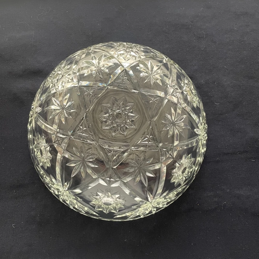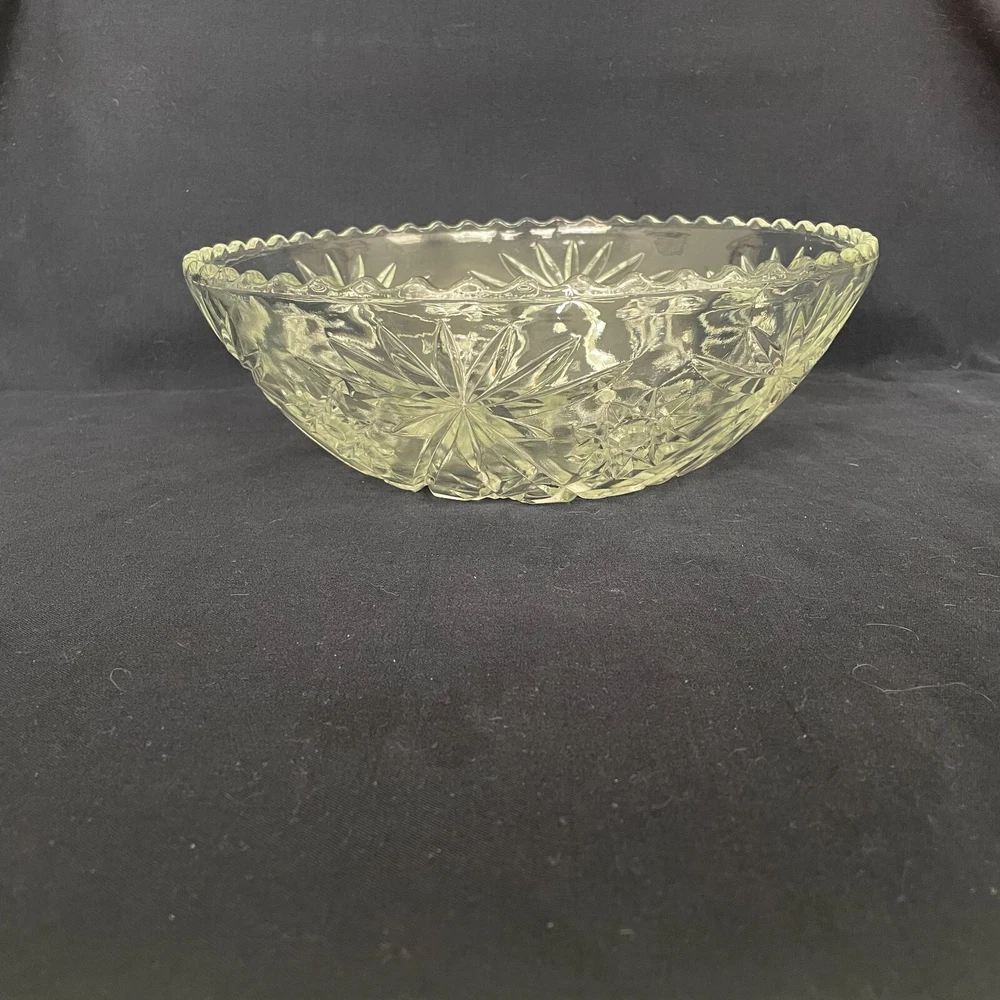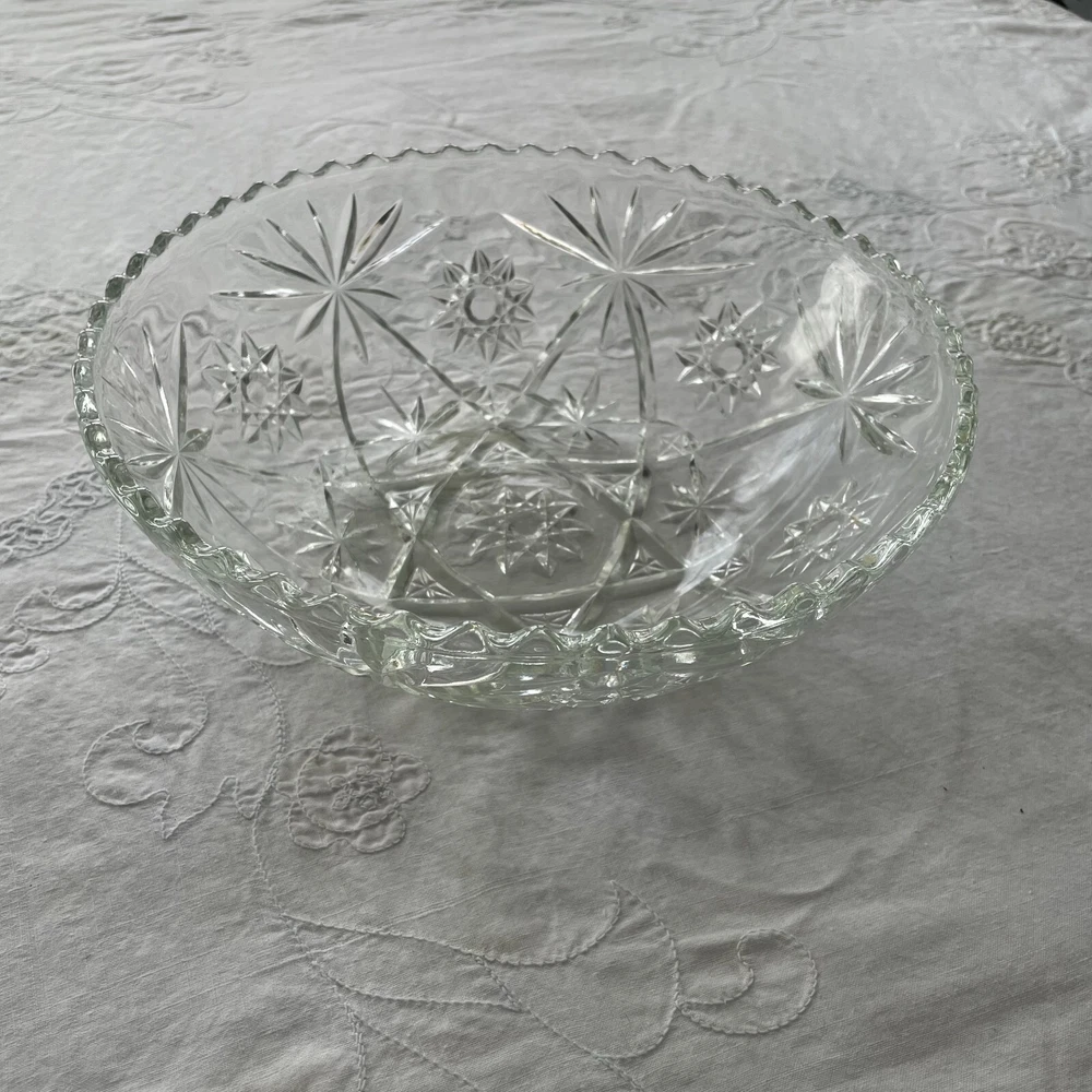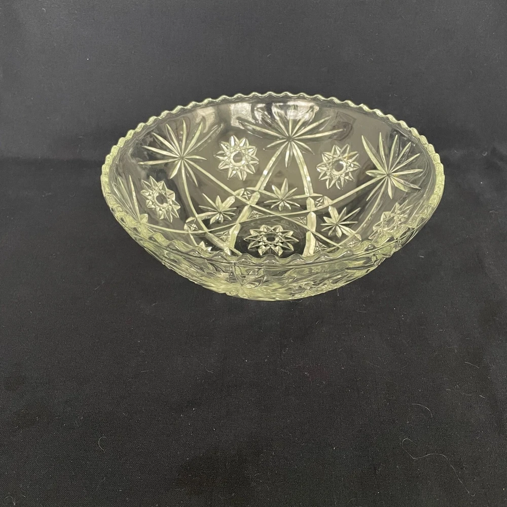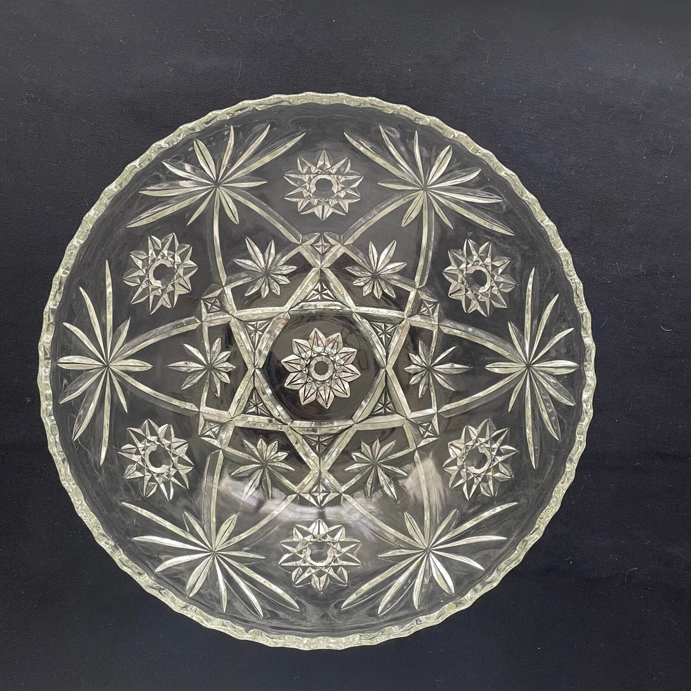 Anchor Hocking Large Round Clear Glass Bowl Sunburst and Star of David Pattern Deep Cut Early American Pressed Glass Gently Scalloped Sawtooth Edge Excellent Vintage. Here is a lovely vintage Anchor Hocking clear deep cut EAPG bowl with the Sunburst and Star of David pattern and stunning refraction. This is a very popular pattern in brilliant deep cut glass with hobstars and fan motifs and gently scalloped sawtooth edge. Approximate date of production is 1940-1989. Weight 3.6 lbs. Diameter 11 inches. Height 3 1/2 inches. This beautiful bowl is in excellent vintage condition, no cracks or chips or flaws. It would make a wonderful serving bowl or fruit bowl, possibly a great gift idea. (Note there is a matching vintage Anchor Hocking smaller gondola shape bowl, same clear EAPG deep cut glass with same pattern and design, also in excellent condition. 1960-1989 Both are sold separately or make an offer on both together.) (see pics in my listings). Vintage Note: Please remember that vintage and antique items have already had a previous life. Therefore, there may be an occasional imperfection. I take great care to describe any flaws and provide correct information about the age and details of the items. It's helpful if you study the pictures carefully to feel secure in your purchase. Shipping: I ship Monday through Friday, and Saturday before noon, via USPS Priority insured with a tracking number. All my items are double boxed and carefully packaged so your purchase arrives safely.