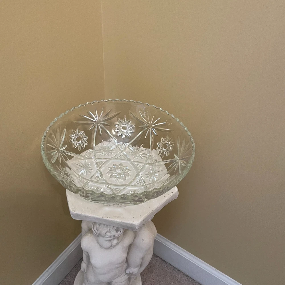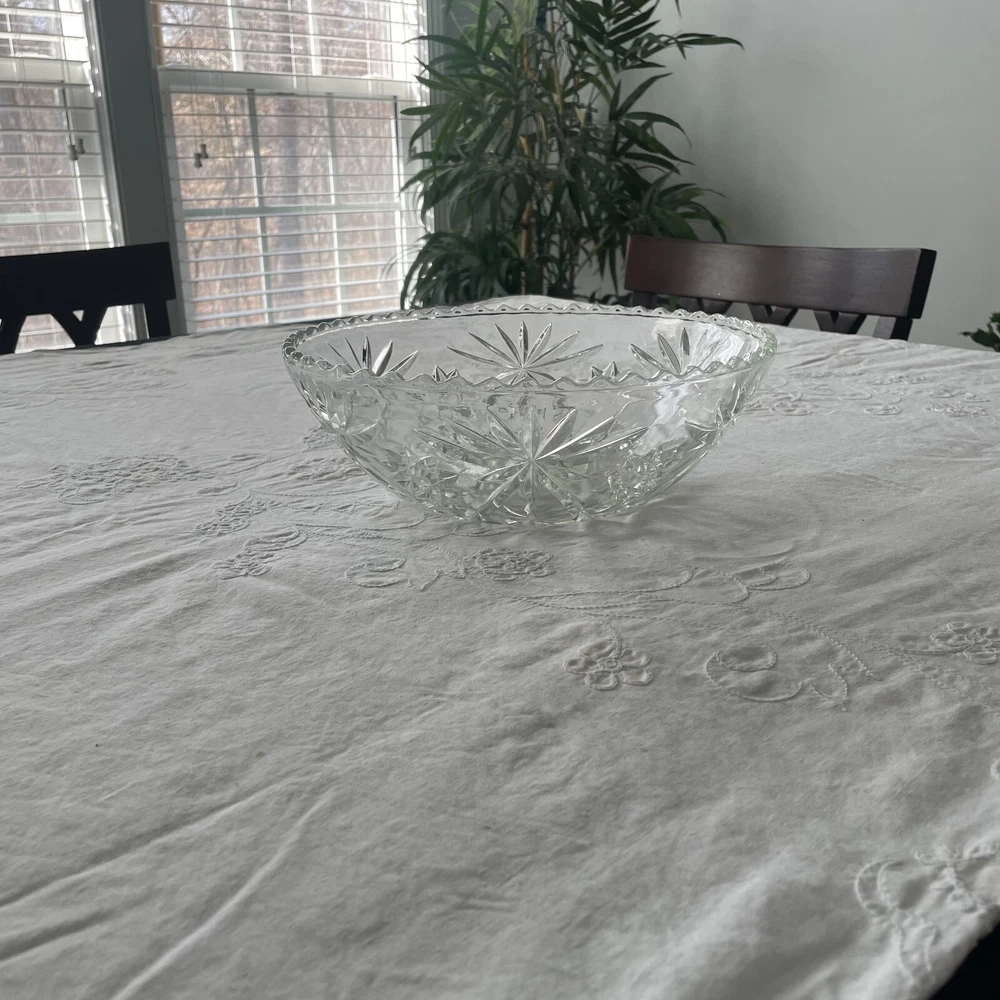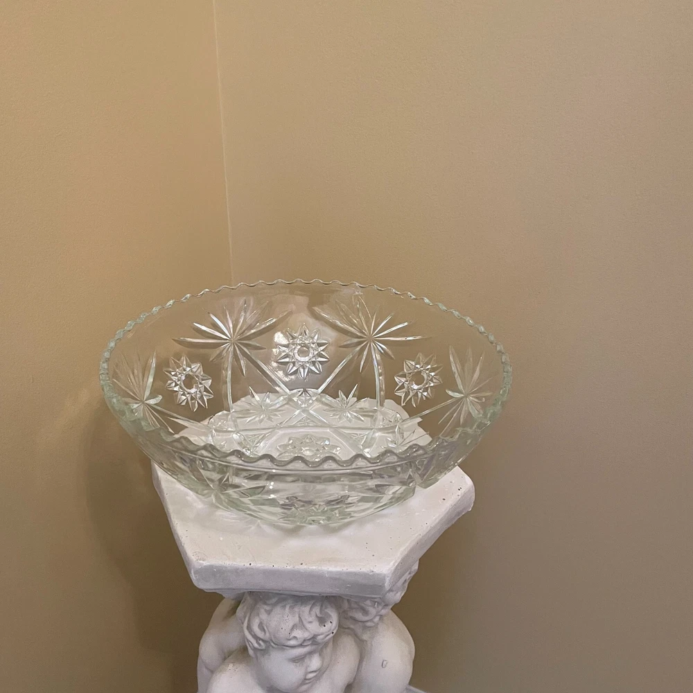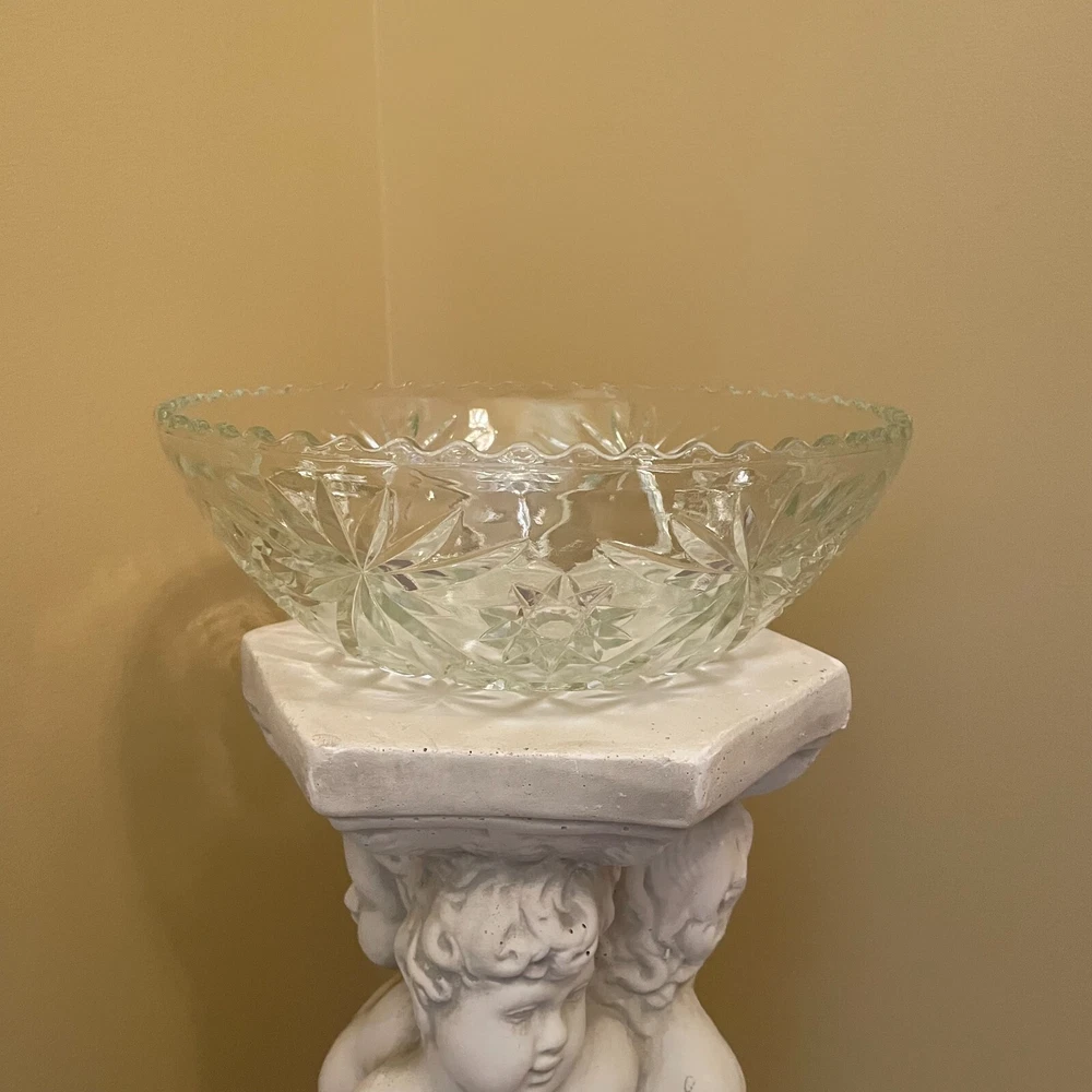Anchor Hocking Large Round Clear Glass Bowl Sunburst and Star of David Pattern Deep Cut Early American Pressed Glass Gently Scalloped Sawtooth Edge Excellent Vintage. Here is a lovely vintage Anchor Hocking clear deep cut EAPG bowl with the Sunburst and Star of David pattern and stunning refraction. This is a very popular pattern in brilliant deep cut glass with hobstars and fan motifs and gently scalloped sawtooth edge. Approximate date of production is 1940-1989. Weight 3.6 lbs. Diameter 11 inches. Height 3 1/2 inches. This beautiful bowl is in excellent vintage condition, no cracks or chips or flaws. It would make a wonderful serving bowl or fruit bowl, possibly a great gift idea. (Note there is a matching vintage Anchor Hocking smaller gondola shape bowl, same clear EAPG deep cut glass with same pattern and design, also in excellent condition. 1960-1989 Both are sold separately or make an offer on both together.) (see pics in my listings). Vintage Note: Please remember that vintage and antique items have already had a previous life. Therefore, there may be an occasional imperfection. I take great care to describe any flaws and provide correct information about the age and details of the items. It's helpful if you study the pictures carefully to feel secure in your purchase. Shipping: I ship Monday through Friday, and Saturday before noon, via USPS Priority insured with a tracking number. All my items are double boxed and carefully packaged so your purchase arrives safely.
