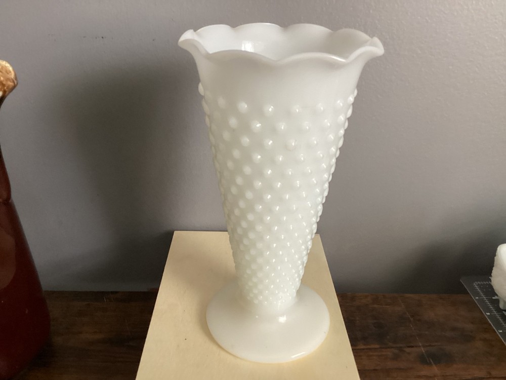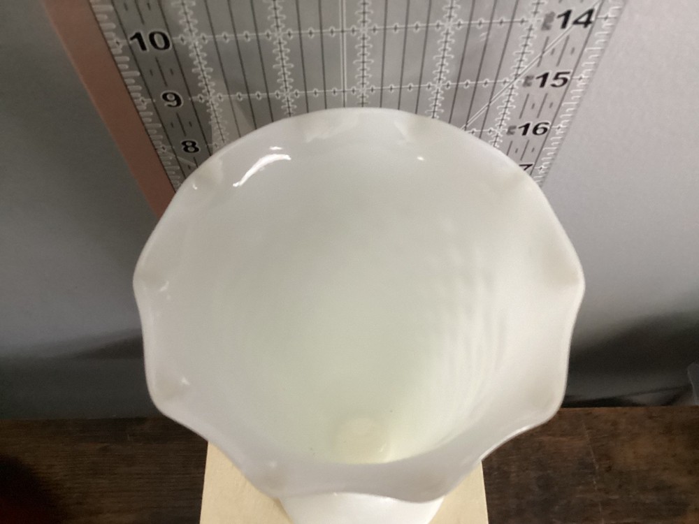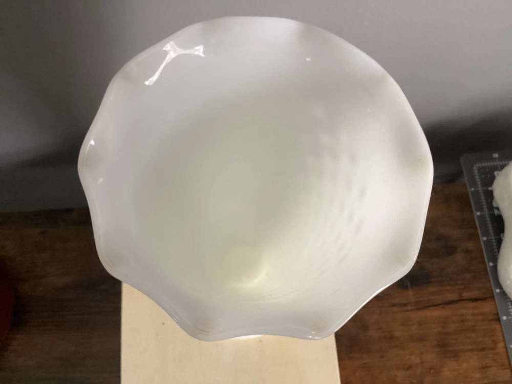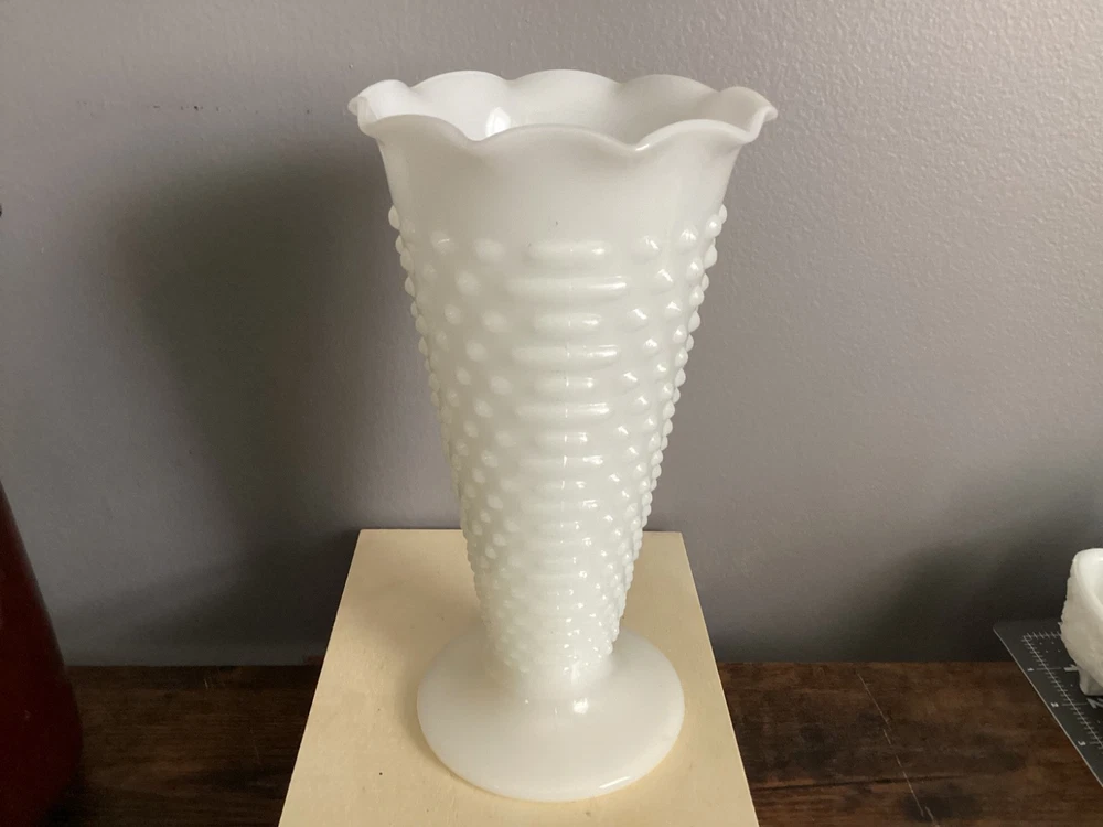 The Anchor Hocking Milk Glass Trumpet Vase is a charming piece with a scalloped rim and dot dash design, perfect for all occasions. Made of white glass and measuring 9 inches in height, this mid 20th-century collectible exudes a 1960s style. Crafted in the United States by Anchor Hocking, this original piece is a beautiful addition to any collection of decorative items. NO CHIPS OR CRACKERS