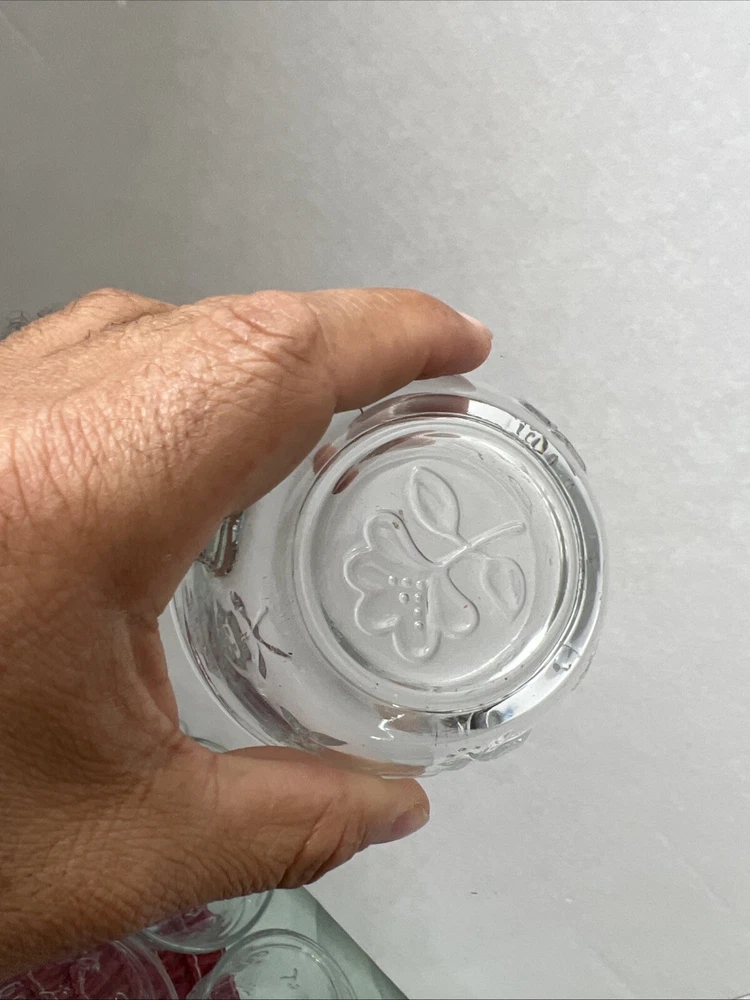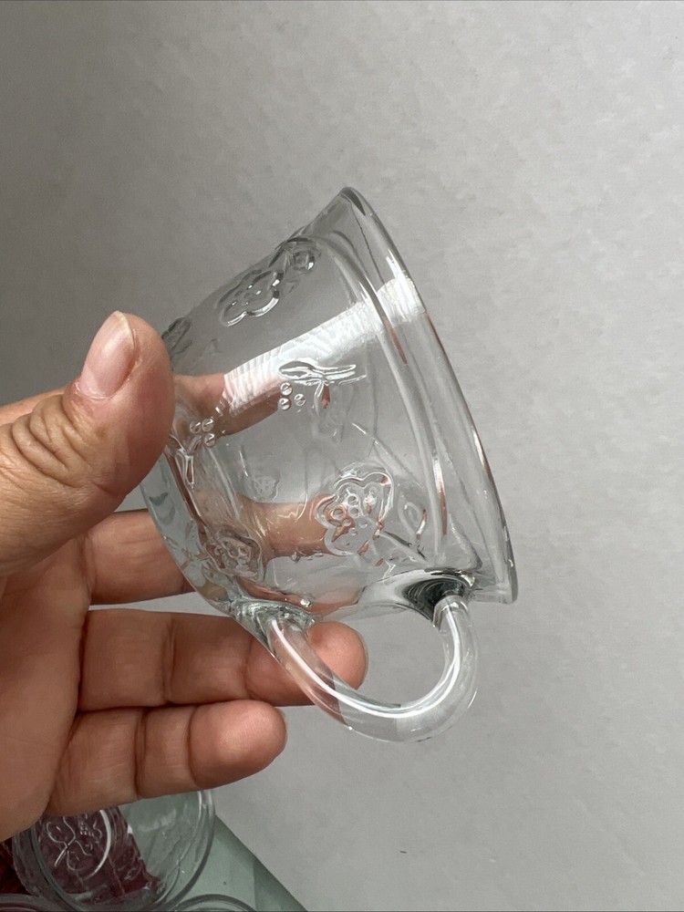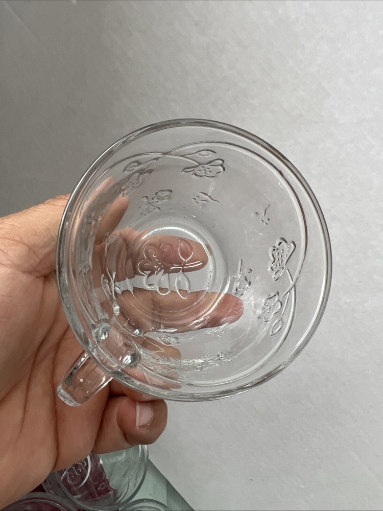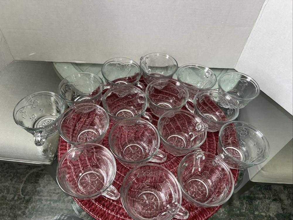 This is an Anchor Hocking Savannah Punch Set that includes 16 cups and 16 plastic hocks. The set features a mid-century modern style with a flower theme, made of pressed glass in clear color. It is an original vintage set from the United States, designed by Anchor Hocking. The cups and hocks are dishwasher safe and decorative, making them perfect for serving punch at gatherings. Open box , never used cups and plastic cups only