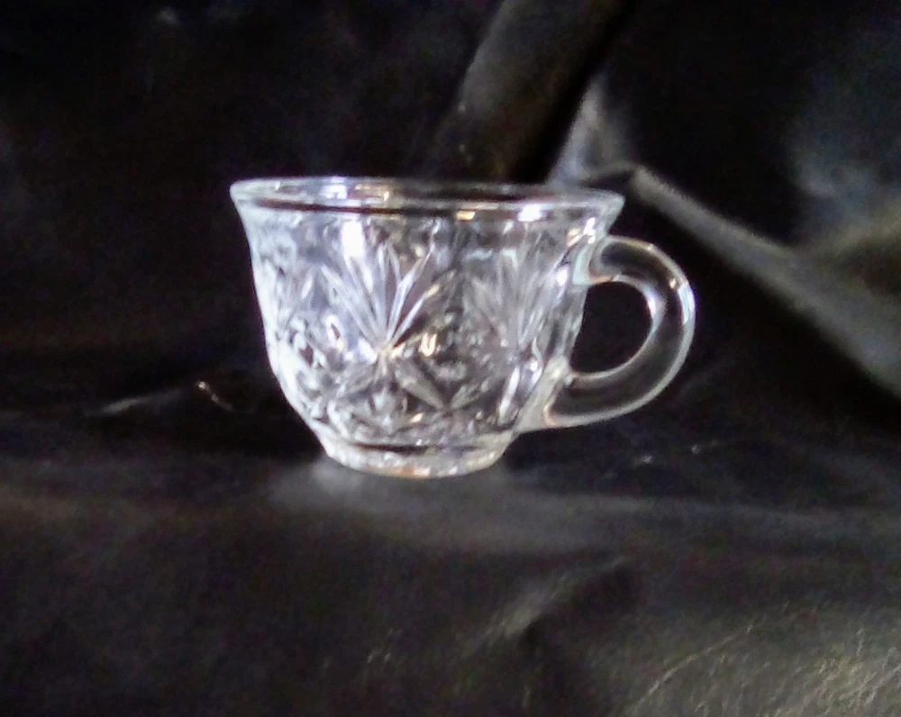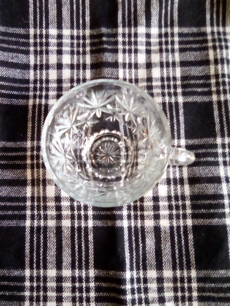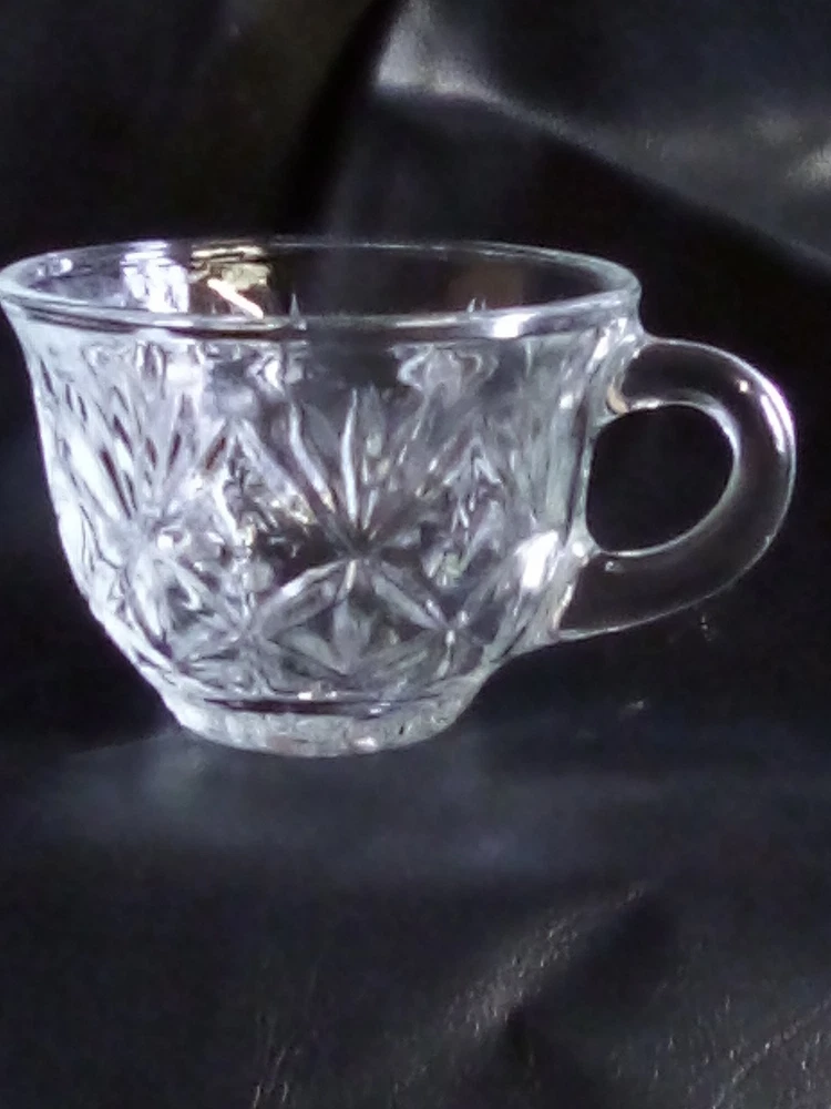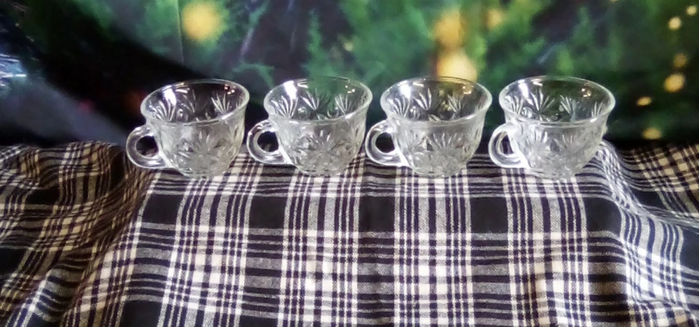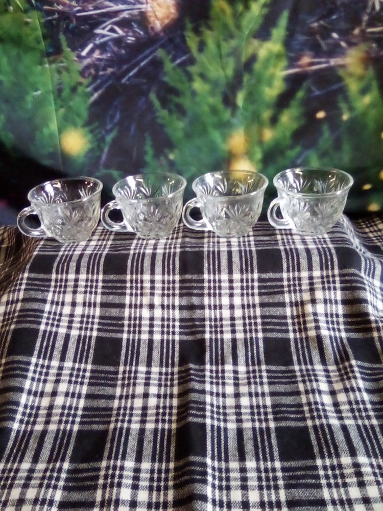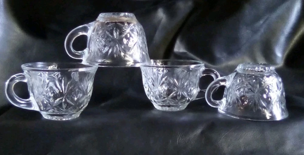 This product is a lot of four Anchor Hocking STAR OF DAVID punch cups made of clear glass with a starburst pattern. Each cup has a round shape, a 2-inch height, and a 3.5-inch width. These pressed glass cups are perfect for all occasions and can serve up to four people. The brand, Anchor Hocking, is known for its quality glassware, making these cups a stylish and practical addition to any kitchen or dining table.