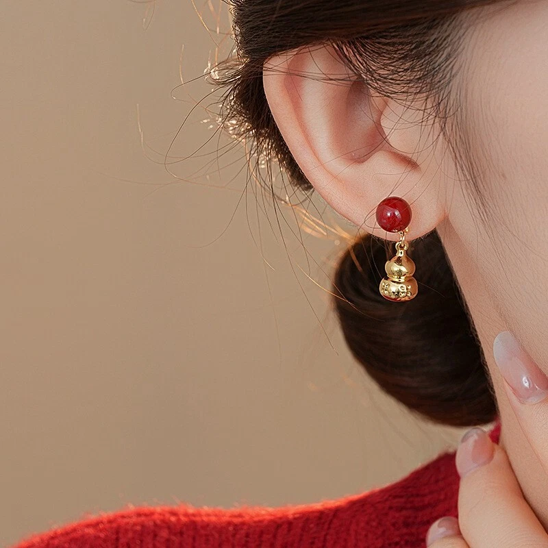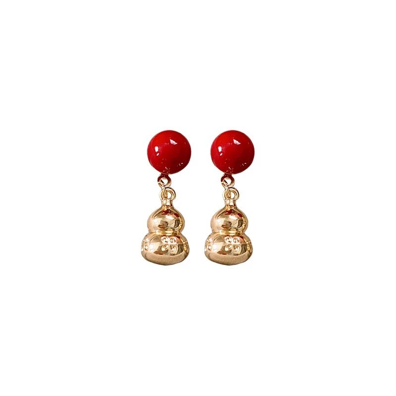 These Anchora earrings feature red round ball gourd pendants, creating a unique and eye-catching design. The earrings are a stylish accessory that can add a pop of color to any outfit. The red color of the gourd pendants adds a vibrant touch to the overall look, making them a fun and trendy choice for those looking to elevate their jewelry collection.