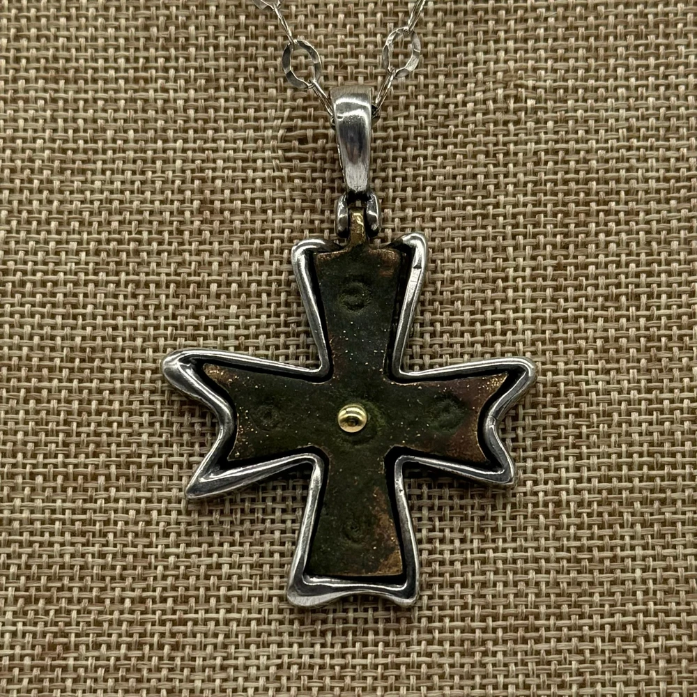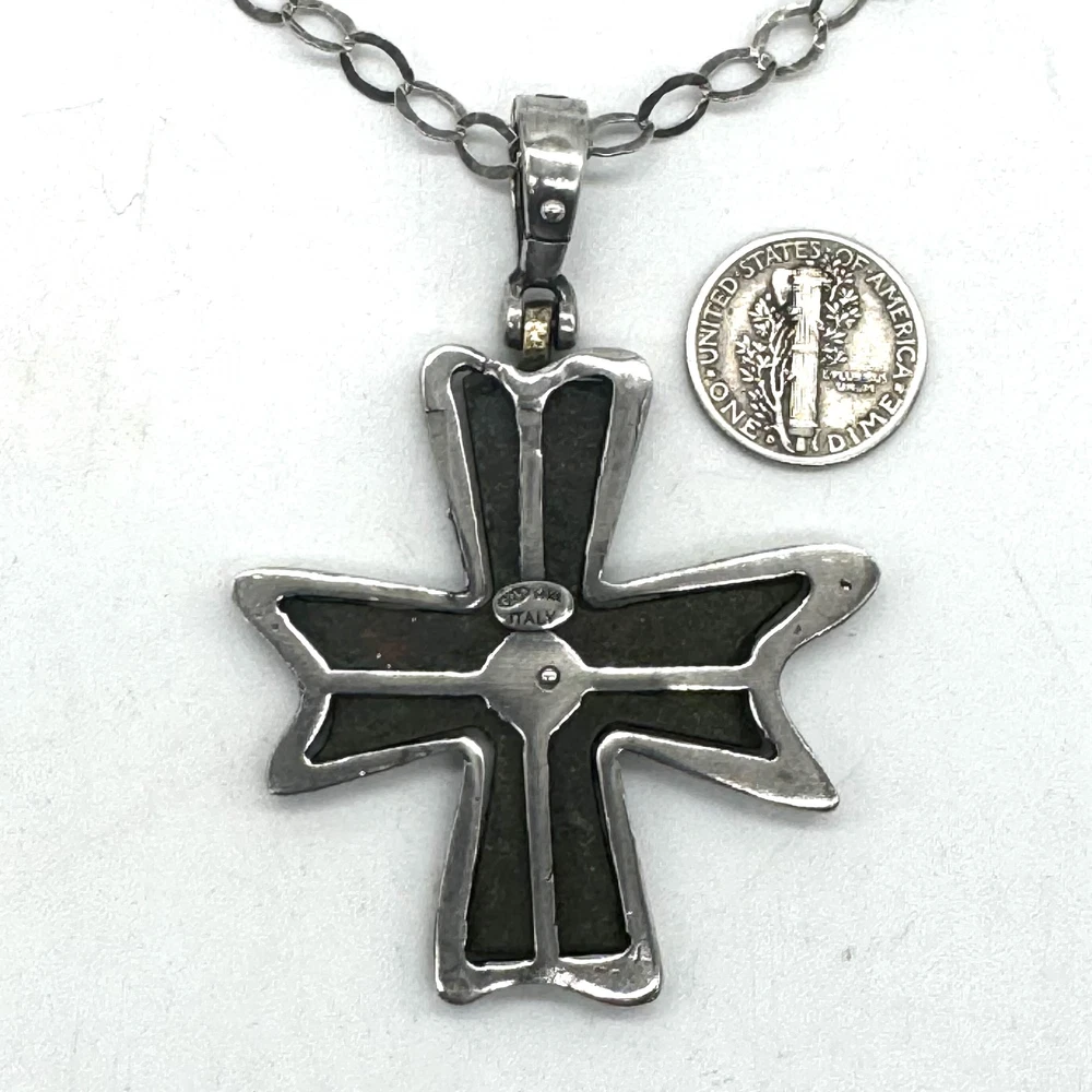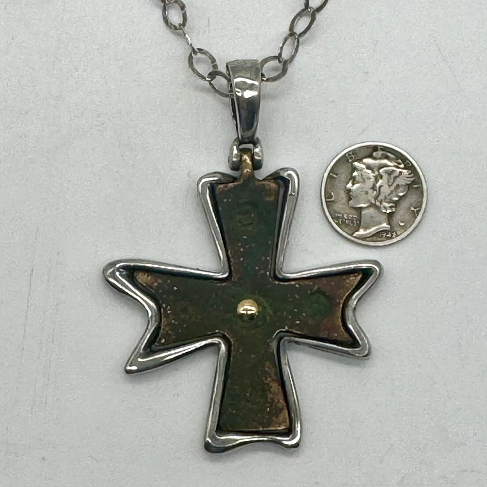 Ancient Byzantine Bronze Cross in Sterling Silver Setting & 20" Chain Ancient Byzantine Bronze Cross in Sterling Silver Setting & 20" Chain Byzantine Bronze Cross in Sterling Silver Setting & 20" Chain. The chain is a simple hammered oval link. The bale hinges on the cross and can actually open up to accommodate a larger chain or strain of beads. The cross in the bezel setting (not including the bale) measures 1.83" by 1.83". Marked 925 / 18k / Italy. The 18k is from the center nail which holds the cross into the sterling setting. SHIPPING: Shipping is First Class in the US. I will spring for the insurance! Most items are mailed within 24 hours of receiving payment. If you need expedited shipping, or Express shipping, please ask. Shipping is from 70767. Our aim is happy customers. We leave feedback for you; please do the same for us if you are happy with your item. If there is a problem, please contact us before leaving low feedback or low DSR's. We answer most email within 24 hours. We appreciate your business and want you for a repeat customer. Please save us a favorite seller and check back each week for new items. Listing and template services provided by inkFrog
