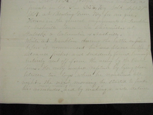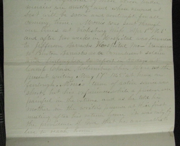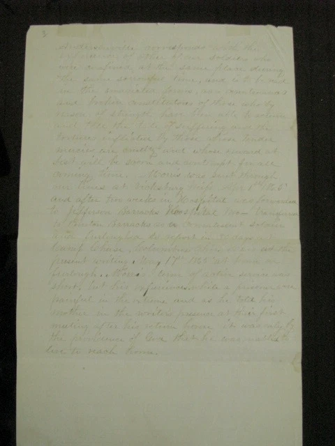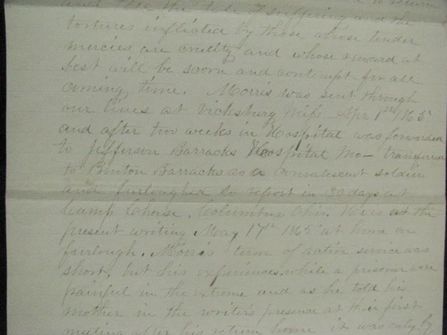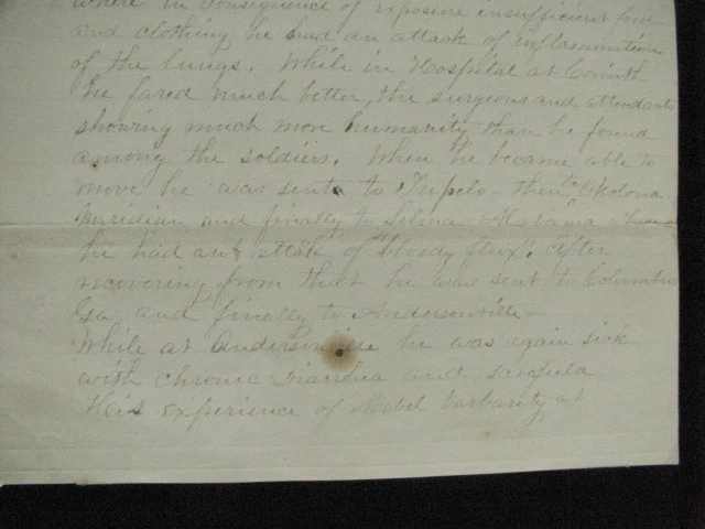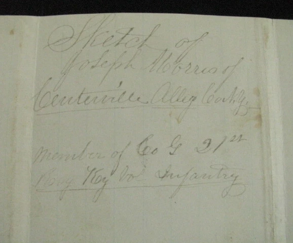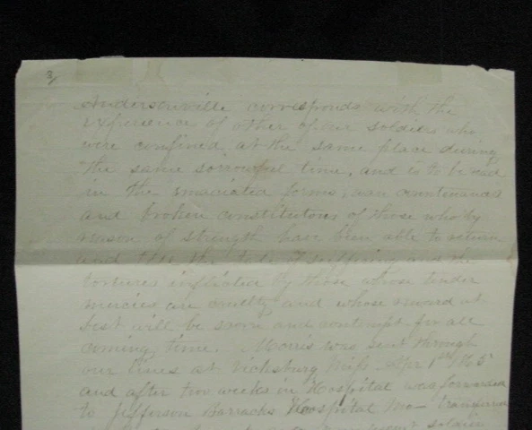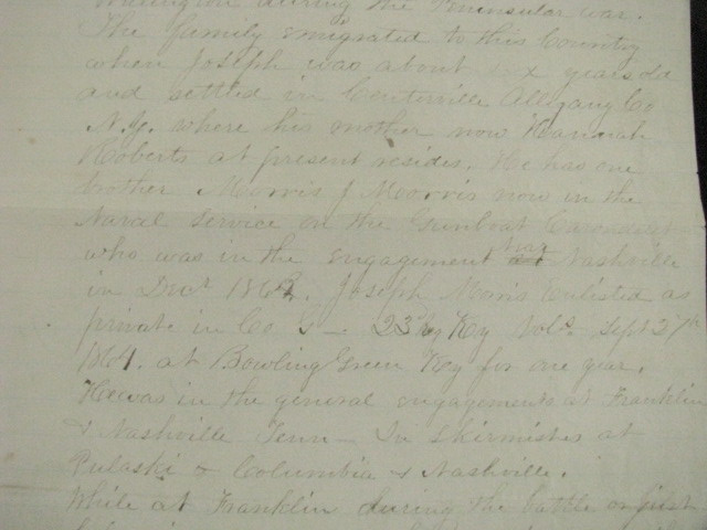 Private Joseph Morris , 23rd Kentucky Volunteers served 1864-1865, was captured at the Battle of Franklin, Tennessee and became a Prisoner of War at Andersonville Prison, Georgia. An Original May, 1865 account by Private Morris of his time in the service including capture and POW life at Andersonville. Briefly describing his family roots,he notes his brother is currently in the naval service aboard the Gunboat Caroldelet, then details his service in Company G, 23rd Kentucky Infantry, listing his skirmishes and battles incl Pulaski, Columbia, Franklin & Nashville, Tennessee. Serving as advanced picket and escaping capture at Franklin, he was again at Nashville, on advanced picket when he was captured , forced to stand in the front line of the Rebels until taken to the rear by a Rebel officer, was stripped of his clothing and given rags to wear. After 4 days without rations he became ill. At Corinth Hospital the Rebel Doctors and attendants gave him humane care. On recovery he was sent to Tupelo,then Okolona, Meridian, Selma where he suffered the "bloody flux", then went to Columbia, and finally Andersonville Prison where he became sick w chronic diarrhea, and confirms the mistreatment of other released comrades, being emaciated, broken in health, and cruelly tortured. After being taken from Andersonville by the Rebels and still being sick, he was sent through the parole lines at Vicksburg on April 1, 1865,then convalesced at Jefferson Barracks,Missouri and finally Camp Chase, Ohio where he was given a 30 day furlough. He states that he is at the present writing at his Mother's home, May 17, 1865 while still on furlough and is grateful to God that, despite his extremely painful experiences was able to return to visit Mother, Hannah Roberts, here at Centreville, Allegheney County, New York where he is dictating this account. The account is inscribed on the reverse" "Sketch of Joseph Morris of Centreville, Alleg. County, member of Co G, 21st Reg Ky Vol. Infantry". He dictated the account to a NY Militia Officer at his Mother's home, May, 1865. 3pp ink, 8x13" lined paper, with age stains, wear, old paper tape on back edge, Overall VG. Comes w bio and service info. Pvt Morris, a native of Wales and still a British subject, enlisted as a substitute at Bowling Green, KY, Sept 1864. After his 1865 furlough, still sick he was finally mustered out August, 1865 but survived and later married. Welcome to my Ebay Store. I am a specialist in early American Military & Historical items, especially American Civil War ephemera- letters, military & historic documents including broadsides, commissions, General Orders and other imprints. I have been collecting and selling original American Civil War & US Military memorabilia for 35 years My customers have included some of the leading names in collecting and selling American History items, as well was as a wide range of novice & advanced collectors in addition to some 30 US federal, state, public and private university & municipal museums and libraries. All items are unconditionally guaranteed to be authentic and in the condition as described. I am a longtime member of the Company of Military Historians, the New England Antique Arms Association, the Ephemera Society of America & the Civil War Veterans Historical Assn. I SELL ONLY ORIGINAL ITEMS, AND HAVE BEEN A PROFESSIONAL FULL TIME SELLER OF ANTIQUE HISTORICAL ITEMS SINCE 1980. PLEASE SEE MY EBAY STORE FOR OTHER LISTINGS. PLEASE READ DETAILS OF THE ITEM DESCRIPTION. I TRY TO DESCRIBE ALL ITEMS ACCURATELY U.S. SHIPPING ONLY I ship only USPS priority mail with insurance