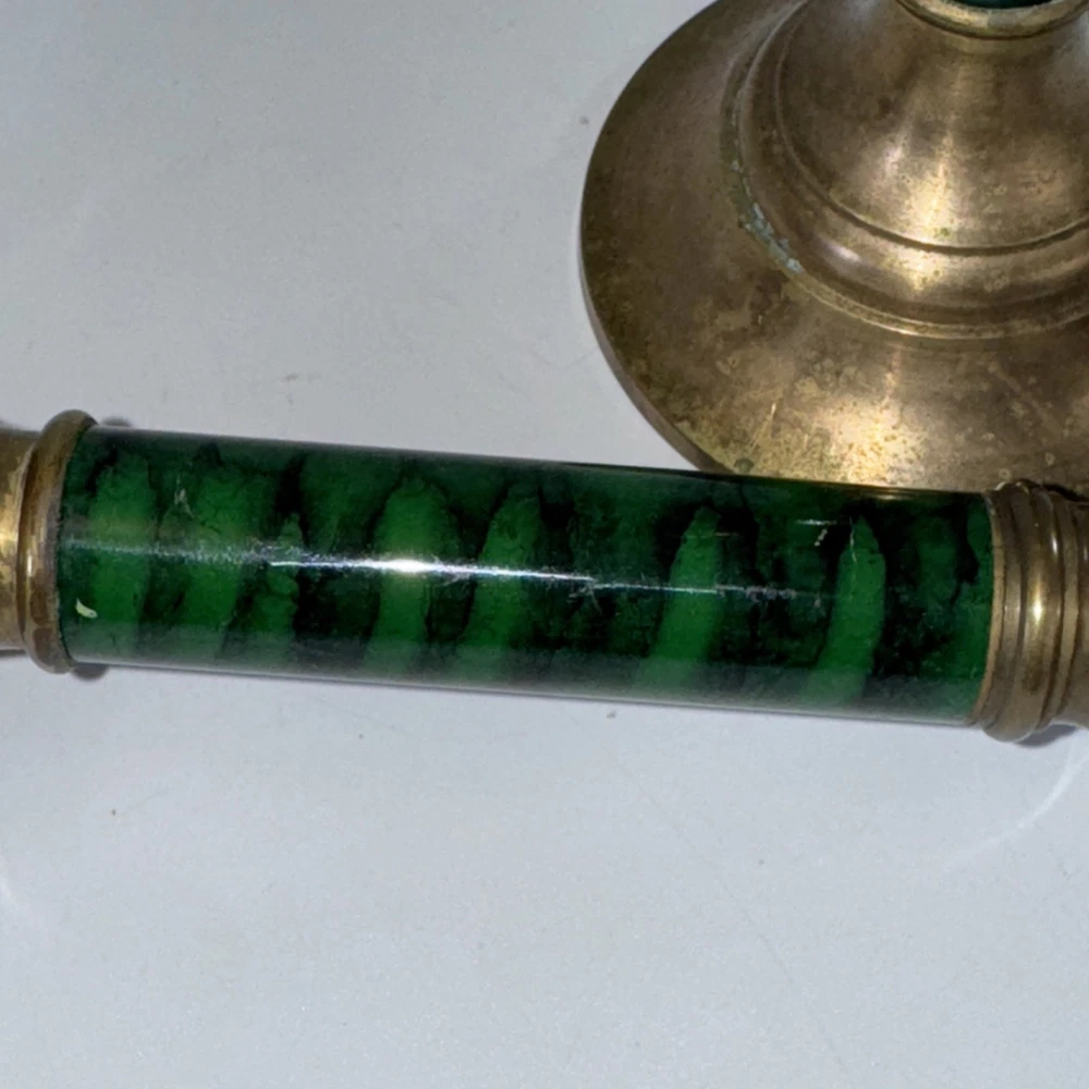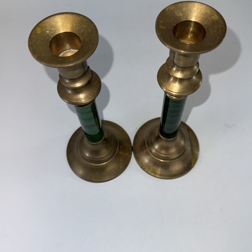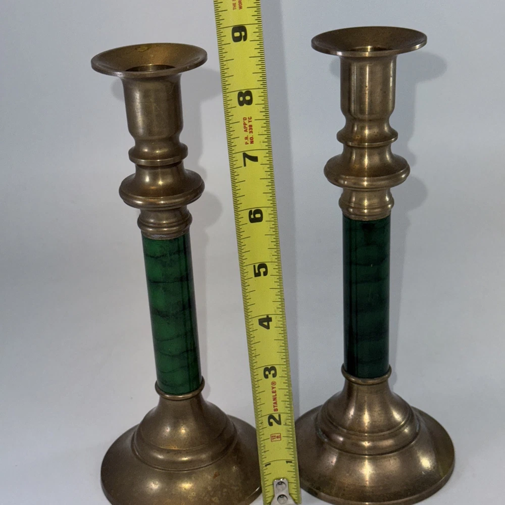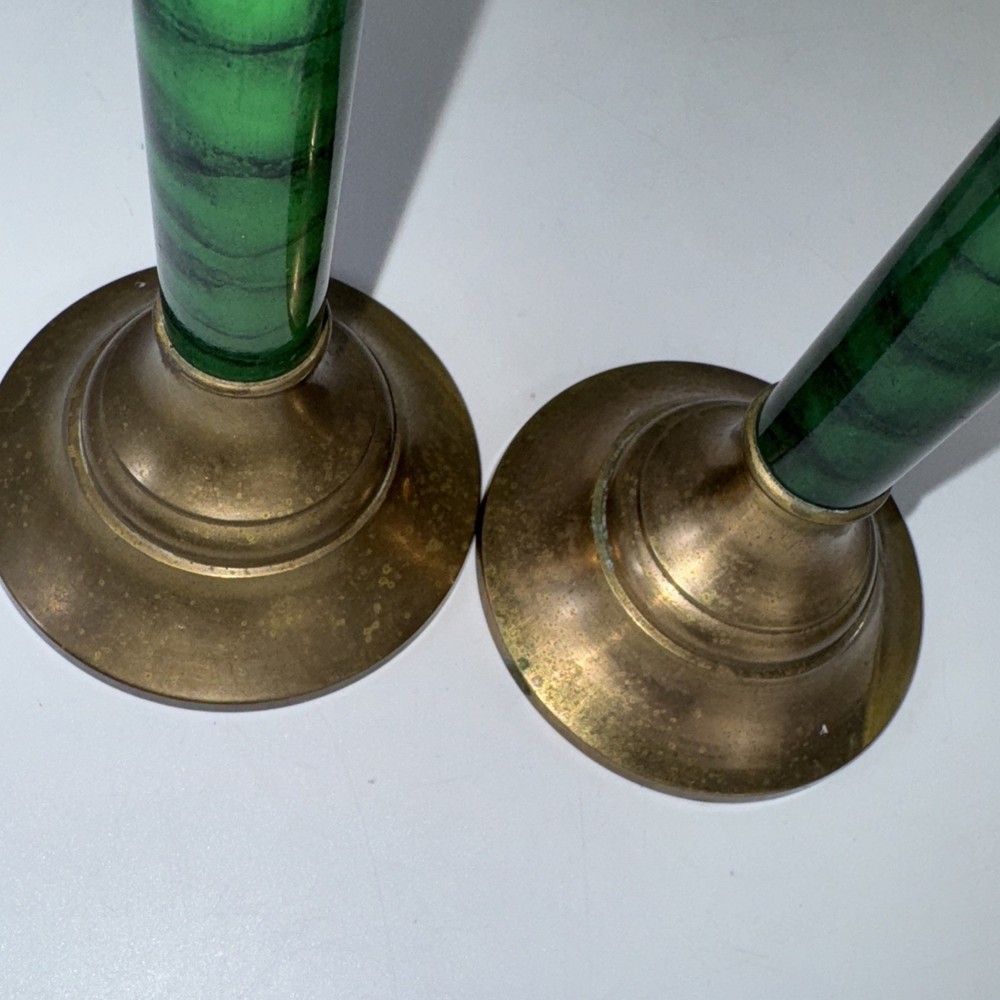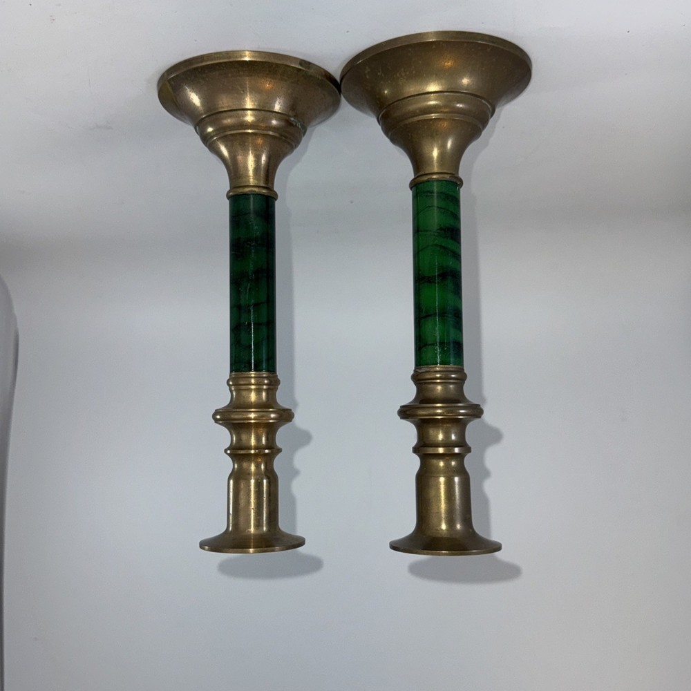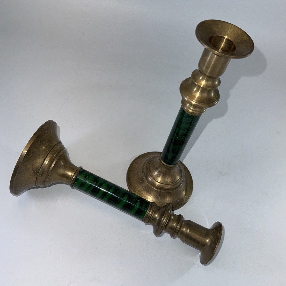 Striking pair of vintage brass candlesticks featuring rich green stone-look columns and classic turned brass bases and tops. These have a bold mid-century presence with a touch of Hollywood Regency glamour, perfect for styling mantels, dining tables, or bookshelves. The green columns appear to be stone or stone-composite (possibly onyx-style), with natural variation and depth that contrasts beautifully with the warm brass. Heavy, solid feel and well-balanced proportions. Details: • Set of 2 matching candlesticks • Brass construction with green stone / stone-look columns • Classic mid-century / Hollywood Regency style • Approx. 8.5 inches tall • Standard taper candle size Condition: Good vintage condition with age-appropriate patina to the brass. Some surface spotting and wear consistent with age and use. No cracks or breaks noted in the green columns. Please review photos closely for full condition details.