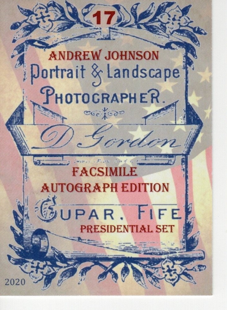 ANDREW JOHNSON Presidential ACEO Portrait D. Gordon Facsimile Autograph PHOTOS SHOW FRONT AND BACK OF THE CARD YOU WILL RECEIVE 1 CARD APS #96033 STOCK PHOTOS UNLESS OTHERWISE MENTIONED BLACK DISPLAY HOLDERS ARE NOT INCLUDED TO RECEIVE FREE SHIPPING YOUR PURCHASES MUST BE ON ONE INVOICE TO SAVE ON SHIPPING, COMBINE YOU PURCHASES ON ONE INVOICE. IF YOU MAKE MULTIPLE PURCHASES AND DO NOT COMBINE THEM ON ONE INVOICE THEY WILL SHIP SEPARATELY.