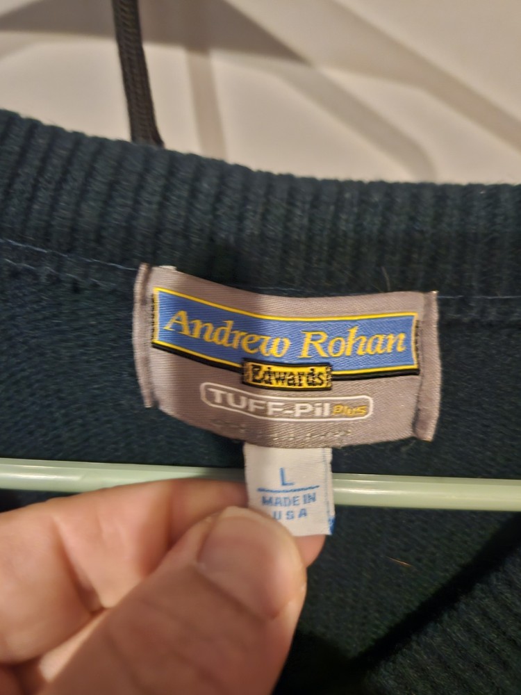 The Andrew Rohan Edwards Tuff-Pil Sweater is a men's size L green V-neck sweater made from acrylic material. It features a tight-knit design with long sleeves, making it suitable for travel, parties, or casual wear during the winter and fall seasons. The sweater offers a relaxed fit and is machine washable for easy care. The Edward's brand and solid green color add a classic touch to this stylish and versatile piece of clothing.