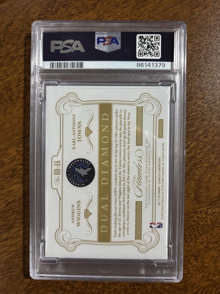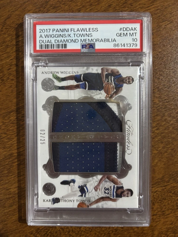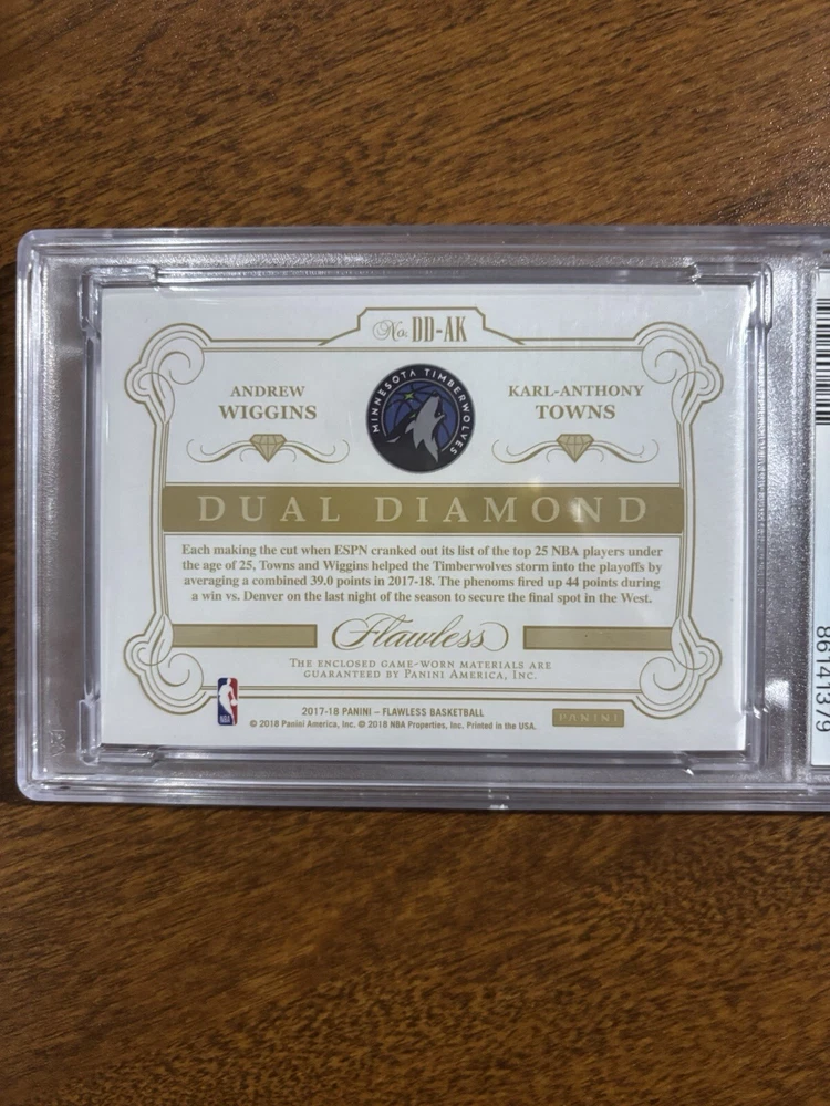Type:Sports Trading CardFranchise:N/AFeatures:Memorabilia, Parallel/Variety, Dual Patch, Game Worn, Serial NumberedCard Manufacturer:Panini America, Inc.Season:2017-18Print Run:25Sport:BasketballLeague:National Basketball Association (NBA)Set:2017-18 Panini FlawlessYear Manufactured:2017Year:2017-18Player/Athlete:Andrew Wiggins, Karl Anthony TownsProduct:Single-InsertCard Number:DD-AKOriginal/Reprint:OriginalTeam:Minnesota TimberwolvesCard Name:Dual DiamondParallel/Variety:SilverManufacturer:Panini America, Inc.