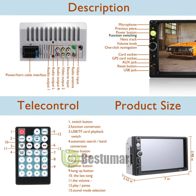 7 Inch Double 2 Din Car Stereo Radio Android 10 GPS Wifi Touch Screen MP5 Player BUY WITH CONFIDENCE ↓ ↓ ↓ √ 100% New & Excellent Quality √ Strictly QC, Each set was fully tested before shipping √ Free 1-3 Days Shipping From NJ,USA.Ship within 24 hours. √ Offer delivery with Tracking Number √ Free Return, Seller Pay!! √ Lifetime Warranty Feature: ✔ This machine comes with a smart 7-inch high-definition digital touch screen, dynamic menu interface, suitable for most cars, supports smartphone Android/IOS screen projection to car player and there are seven light colors that can be adjusted. ✔ Full-featured wireless in-car remote control, built-in bluetooth function, can be connected to mobile phones, hands free calls, HD video, U disk, TF card playback function, USB 2.0 interface compatible with various U disks, mobile hard drives,etc. ✔ MP5 radio can listen to real-time road conditions, news broadcasts, weather forecasts, etc., supports reversing image, steering wheel control functions, and has four playback modes at the same time, you can use U disk, AUX, bluetooth playback. ✔ New processing chipset, faster response, more stable performance, more powerful functions, hardware electronic sound(EQ) processing, multiple sound modes, high and low bass can be adjusted, high-performance digital turning FM radio automatic scanning, 18 station storage. ✔ Support random playback, folder playback, AUX audio input interface can be connected to MP3, GPS, moible phone, walkman and other audio input, and USB supports high current output, which can charge moible phones. Specification: Product model:7018B Color:Black Material:Plastic System:Wince Screen size:7 inches Moible phone interconnection:support Android/IOS AUX input:support Image format:JPG Screen resolution:800*480 Radio frequency:87.5M-108M Radio band:FM1、FM2、FM3 Decoding chip:C500 Reversing image:support(optional camera is required) Steering wheel control:support GPS navigation:Not support Power supply:DC 12V±10% Effective pixel:656*492 Current consumpition:No more 150mA Horizontal sync frequency:15625KHZ Water-proof:IP67/IP68 Vertical sync frequency:PAL 50HZ/NTSC 60HZ Operating temperature:-30℃∽80℃ RH95% MAX Horizontal Angle:110°/160° Lens angle:120°/170 Audio format:MP3/WMA/WAV/OGG/FLAC/APE Video format:RM/RMV/MP4/FLV/MKV/3GP/AVI/ASF/SWFMP1/MP2 Product size:17.8*10.1*6.3cm/7.01*3.98*2.48inch Package include: 1×Car MP5 Player 1×Remote Controller 1×Power Cable 1×Backup Camera 2×Audio Cable 2×Screws 1×User Manual Payment Shipping Return Policy About Us Contact Us Payment *** We accept Paypal,Visa,Credit Card, e-Check . etc. Shipping Below is the approximate delivery time to different countries (Just estimated) *** 1-3 business days to buyer in USA via Expedited shipping *** 1-5 business days to buyer in USA via USPS Standard Shipping *** 5-12 business days to buyer in CANADA *** 8-15 business days to buyer in EUROPE Country (Depends on Custom) Return Policy *** Free Return, we accept 60 days Money Back or Exchange Guarantee for All Items. About Us Customer Comes First !! Contact Us For any questions or problems, please contact us in the first monent, we will always be here to help you solve the problem.(From Monday to Saturday, not for Holidays). On Oct 25, 2024 at 00:22:25 PDT, seller added the following information: