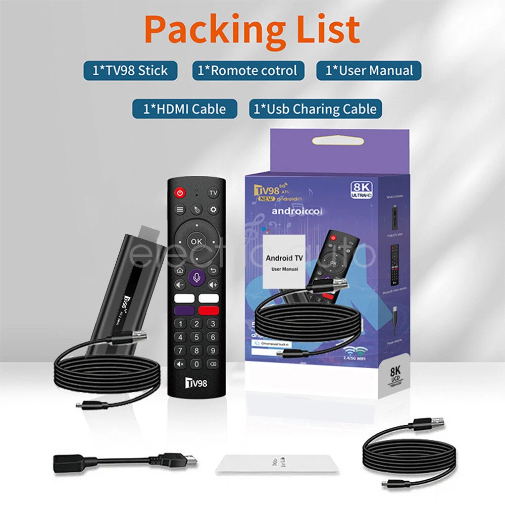Product View Detail Product Features: ✔ COMPREHENSIVE STREAMING SUPPORT: Enjoy a wide variety of content from popular video streaming services such as Netflix, Hulu, Flixster, and YouTube, bringing endless entertainment options to your fingertips. ✔ Wide selection of apps: access a large number of free apps from trusted sources such as the Android Market and Amazon App Store, allowing you to personalize your device with useful and fun apps. ✔ Local media playback: easily enjoy your favorite movies, TV shows and music stored on external storage devices such as hard disk drives (HDDs) and USB drives without the need for additional equipment. ✔Social Connectivity: Stay connected with loved ones and stay up-to-date on social media platforms such as Skype, MSN, Facebook, Twitter, QQ, etc., while enjoying the convenience of email and productivity tools. ✔ Enhanced user experience: Streamline your multimedia experience with DLNA support, enabling easy sharing of content between compatible devices. In addition, control easily with a supported wireless mouse and keyboard at a comfortable 2.4G frequency. ✔ COMPATIBLE WITH WiFi6 AND BLUETOOTH 5.0: Experience lightning-fast WiFi6 for faster, smoother performance with our 8K Smart TV Stick Body. Achieve a smoother streaming and gaming experience when watching videos or playing games. Parameters: Product Name: TV98 TV Stick Resolution: 8K@30fps/4K@60fps Processor chip: Allwinner H618 64-bit quad-core ARM Cortex A53 Graphics Processor: G31 MP2 GPU Running Memory: 2GB Storage: 16GB SD card type: micro SD card (not included) Memory Expansion: up to 64GB (not included) WiFi Support: 2.4G+5G+Wifi6 Bluetooth version: 5.0 Voice Control: Support HDMI version: HDMI 2.1 Operating system: Android 14 Remote control: Infrared remote control Input power: DC 5V/2A 3D Mole: Support 3D movie Support DLNA function Support HDR10+, HLG HDR, Vivid HDR. Support local media playback, support HDD, U disk, TF card. Apps: Free download apps from Android Market, Amazon App Store, etc. Online Browsing: All video sites, support Netflix, Hulu, Flixster, youtube, etc. Support languages: Chinese, English, German, Japanese, Korean, Russian, French, Spanish and 24 other languages. Packing list: 1*TV98 TV stick 1*HDMI cable 1*type-c cable 1*Owner's Manual 1*Remote control (without 2 x 7 batteries) Attention: 1. According to the light color may vary! 2. Please allow a slight 1cm difference due to manual measurement! 3. Thank you for your understanding and attention, wish you have a pleasant shopping experience! Shipping Policy Payment Method Returns Policy Shipping Policy We only accept your Ebay Address ,Please Make sure it's 100% right. The items you ordered will be shipped out in 1 business day by Hong Kong Air Mail when your payment is clear. The arrival time is 5-20 business days to United States usually. We maintain high standards of excellence and strive for 100% customer satisfaction! Feedback is very important to us. We request that you contact us immediately BEFORE you give us neutralor negative feedback, so that we can satisfactorily address your concerns. Payment Method Returns Policy Copyright © 2017 DataCaciques 4K HD TV Stick Android 14 Dual WiFi 2.4G 5G Smart TV Box Streaming Media Player Home Payment Shipping About us Contact us Store Categories Store Categories Consumer Electronics PC&Tablet Accessories Mobile Phone Accessories Sound&Vision Headphones Watches Camera Led Lights Others Auto Car Accessories Lights Others Motorcycle Motor Accessories Lights Others Headlamp&Torch Others Other Product View Detail Product Features: ✔ COMPREHENSIVE STREAMING SUPPORT: Enjoy a wide variety of content from popular video streaming services such as Netflix, Hulu, Flixster, and YouTube, bringing endless entertainment options to your fingertips. ✔ Wide selection of apps: access a large number of free apps from trusted sources such as the Android Market and Amazon App Store, allowing you to personalize your device with useful and fun apps. ✔ Local media playback: easily enjoy your favorite movies, TV shows and music stored on external storage devices such as hard disk drives (HDDs) and USB drives without the need for additional equipment. ✔Social Connectivity: Stay connected with loved ones and stay up-to-date on social media platforms such as Skype, MSN, Facebook, Twitter, QQ, etc., while enjoying the convenience of email and productivity tools. ✔ Enhanced user experience: Streamline your multimedia experience with DLNA support, enabling easy sharing of content between compatible devices. In addition, control easily with a supported wireless mouse and keyboard at a comfortable 2.4G frequency. ✔ COMPATIBLE WITH WiFi6 AND BLUETOOTH 5.0: Experience lightning-fast WiFi6 for faster, smoother performance with our 8K Smart TV Stick Body. Achieve a smoother streaming and gaming experience when watching videos or playing games. Parameters: Product Name: TV98 TV Stick Resolution: 8K@30fps/4K@60fps Processor chip: Allwinner H618 64-bit quad-core ARM Cortex A53 Graphics Processor: G31 MP2 GPU Running Memory: 2GB Storage: 16GB SD card type: micro SD card (not included) Memory Expansion: up to 64GB (not included) WiFi Support: 2.4G+5G+Wifi6 Bluetooth version: 5.0 Voice Control: Support HDMI version: HDMI 2.1 Operating system: Android 14 Remote control: Infrared remote control Input power: DC 5V/2A 3D Mole: Support 3D movie Support DLNA function Support HDR10+, HLG HDR, Vivid HDR. Support local media playback, support HDD, U disk, TF card. Apps: Free download apps from Android Market, Amazon App Store, etc. Online Browsing: All video sites, support Netflix, Hulu, Flixster, youtube, etc. Support languages: Chinese, English, German, Japanese, Korean, Russian, French, Spanish and 24 other languages. Packing list: 1*TV98 TV stick 1*HDMI cable 1*type-c cable 1*Owner's Manual 1*Remote control (without 2 x 7 batteries) Attention: 1. According to the light color may vary! 2. Please