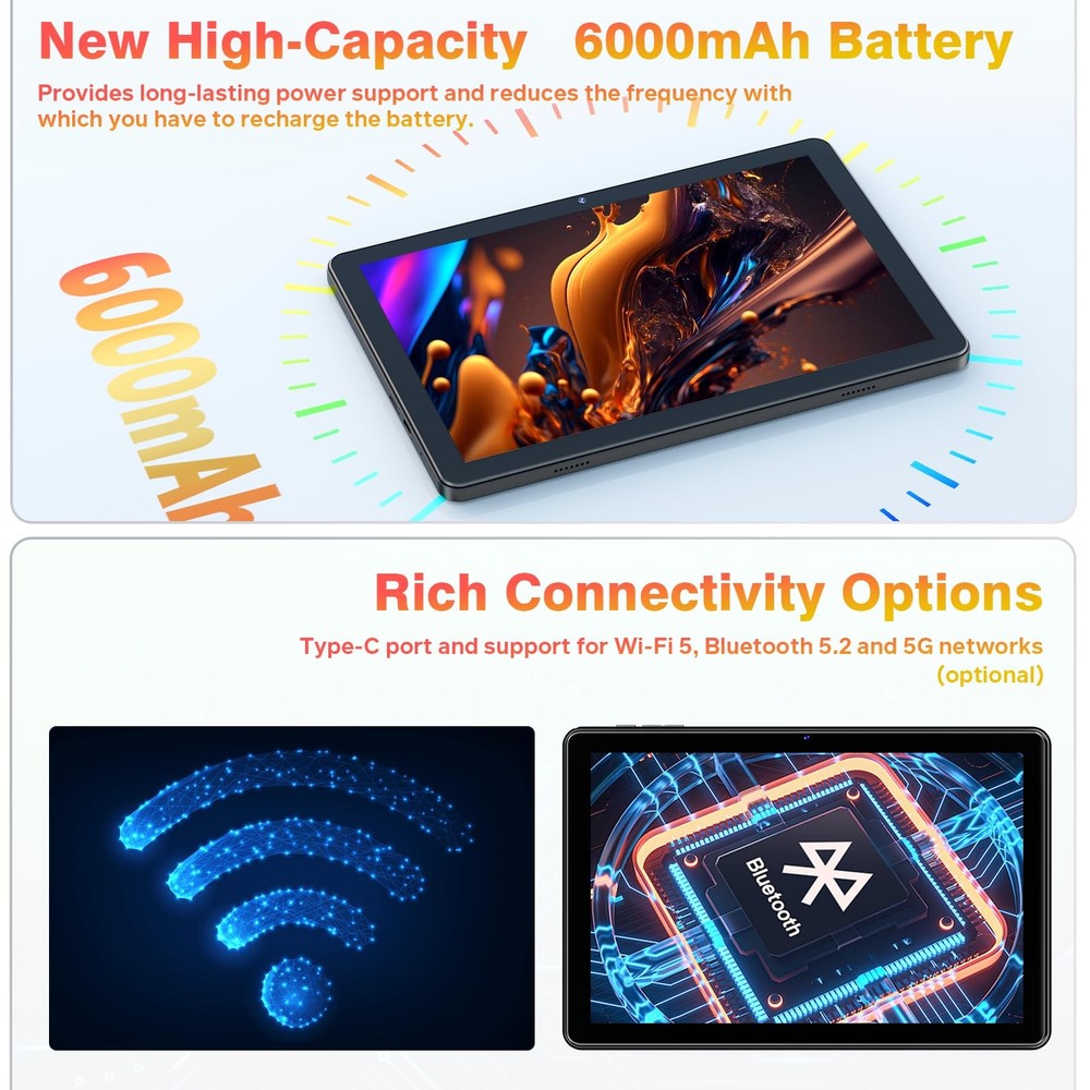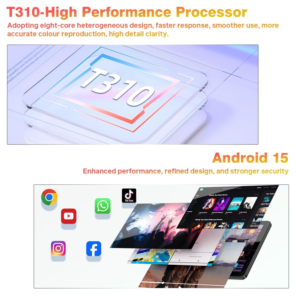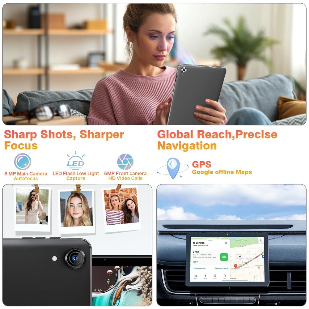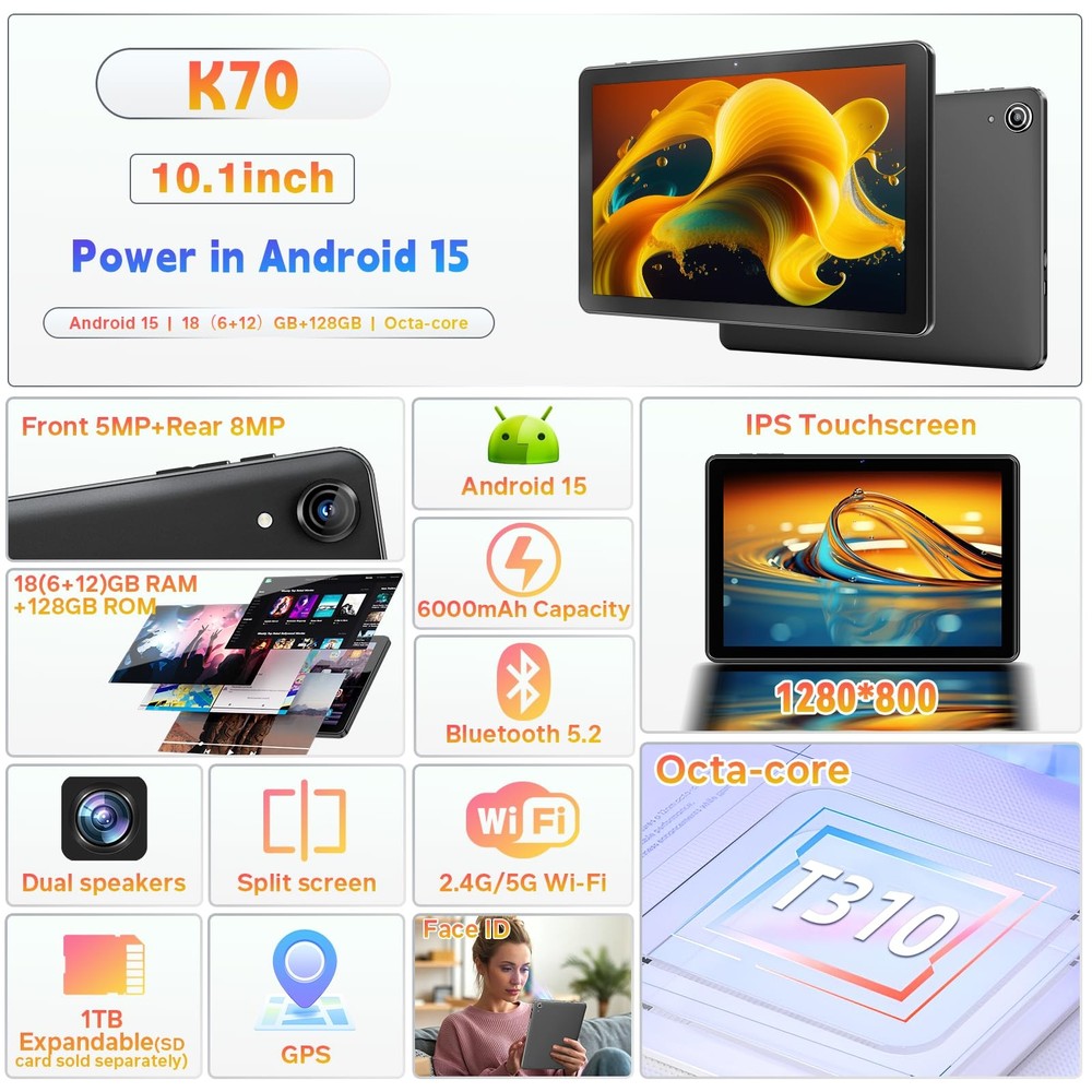 Android 15, 10 Inch ,18GB+128GB,1TB Expand,Widevine L1 Octa-Core with WiFi 5,BT5.2,6000mAh,T310 CPU,GPS,High Performance, Processor,Dual (5MP+8MP) [Latest Android 15 with High-Performance Octa-Core] Powered by the latest Android 15 OS and equipped with an Octa-core T310 processor, this 10 inch Android delivers professional-level performance through seamless multitasking and smooth split-screen collaboration.Equipped with 18GB RAM (6GB+12GB virtual RAM), and 128GB ROM (expandable up to 1TB via external memory card), this PC ensures fast app launches, smooth gaming, and lag-streaming.Perfect for electronics enthusiasts seeking speed and reliability.(1TB card not ). [Equipped with quad-constellation GNSS + recognition] The 10 inch integrates four satellite GPS systems (Beidou, QZSS, GLONASS, and Galileo), enabling rapid and precise location acquisition even in GPS-challenged areas, which significantly enhances navigation and outdoor usability. Additionally, it features the highly anticipated recognition function! Simply the to unlock the device in just 0.3 seconds, eliminating the need for passwords or PIN codes. Compared to traditional authentication methods, recognition offers superior convenience while safeguarding user privacy and against unauthorized access. [Wi-Fi 5+Bluetooth 5.2+5MP+8MP] Featuring 5th generation Wi-Fi technology, this Android supports 5G and 2.4G dual-band Wi-Fi, searching for networks quickly and freely to provide a better internet connection with low latency, strong signal and fast speed. It also comes with a clear 5MP front and 8MP rear for your daily needs, providing you with great photos and clear video chats. [1280*800 HD Screen & Widewine L1:Immersive entertainment and work experience] The 1280x800 high-resolution screen brings you a surprising visual enjoyment. With a wide and bright field of view, you can enjoy a detailed and realistic picture whether you are watching HD movies, playing 3D games or reading -books. The built-in high-quality speakers also provide excellent sound quality for an immersive entertainment experience.Widewine L1, it will be able to transmit high-definition of high-quality video streaming platforms such as netflix, video. [Long-lasting battery life] Built-in 6000mAh high-capacity battery, combined with the intelligent power management function of Android 15 system, is able to meet the needs of daily use. Even under intense use, it can maintain a long battery life and reduce the trouble of frequent charging.