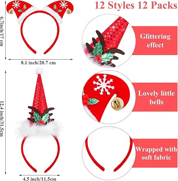 What you will receive: you will get 12 pieces of cute Christmas headbands, including styles of Christmas hat, Christmas tree, gift box, reindeer, bow, antler, etc.; various styles with rich colors can meet your needs for decoration Superb material: our assorted Christmas headboopers are made of durable plastic and comfortable fabric, which are high-quality; they are with elasticity and you will feel comfortable when wearing, suitable for most people to wear Faddish design: our Xmas headbands are exquisite and stylish in shape plus classic Christams elements; you can wear them alone or use them to match other Christmas costumes; you will be cute and stand out from the crowd when you are wearing them