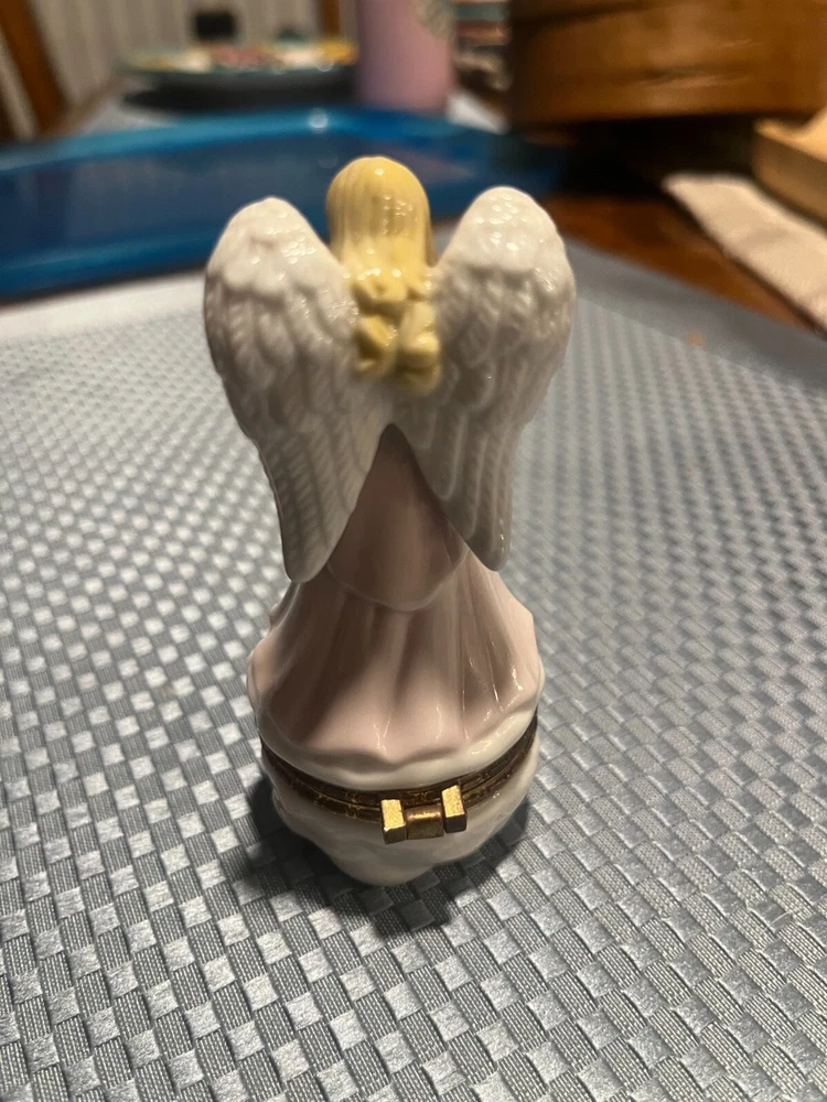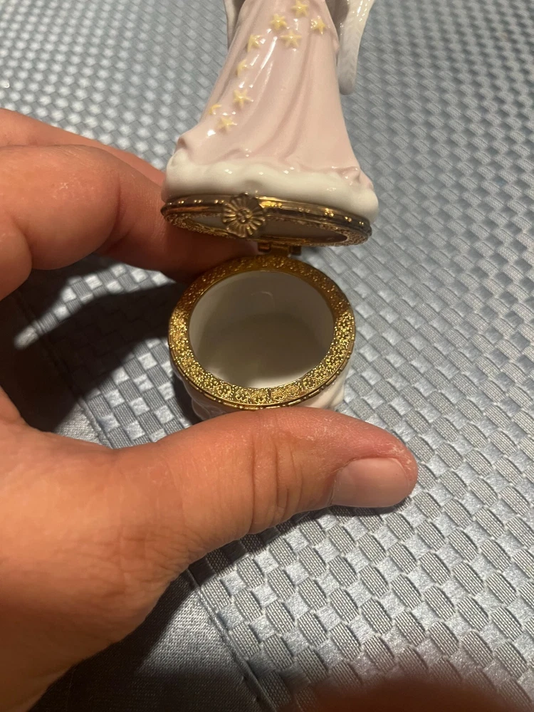 This beautiful trinket box is a must-have for any collector. Featuring a stunning pink and white ceramic finish with yellow stars cloud bottom, it is designed in the shape of an angelic figure. The box is perfect for storing small items and comes with a lid to keep them safe. Made in China with exquisite attention to detail, this American style figural trinket box is a great addition to any decorative collection. The box is categorized under 'Boxes, Jars & Tins' and 'Decorative Collectibles' and is a part of the 'Angel' character family. Get your hands on this glossy finished trinket box today!