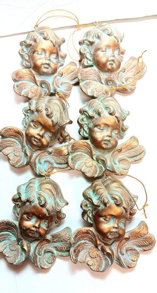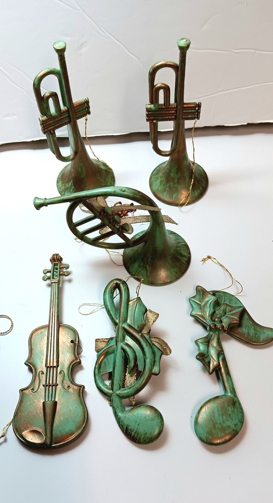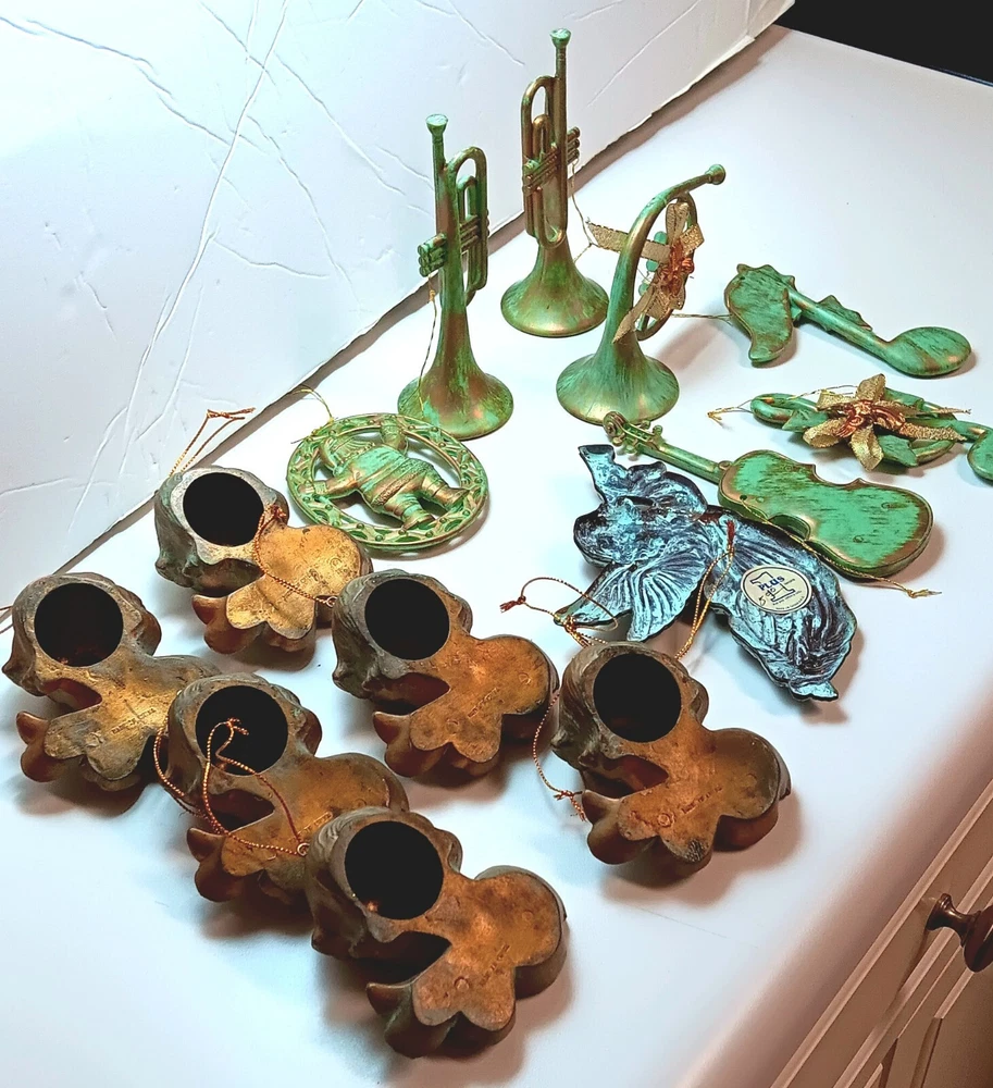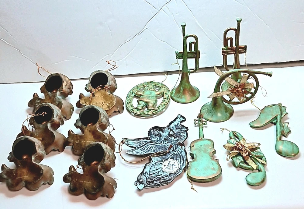 Angel Cherubs Musical 14 Piece Christmas Ornaments Plastic Antique Green Gold Finish. Gently pre-loved great condition. The lot consists of 6 resin/plastic 4"-6" Cherubs, one 6" metal angel blowing trumpet (Taiwan), 4 musical plastic/resin 4-6" instruments, 2 musical plastic/resin 4" notes, and one 3.5" Santa. See photos.