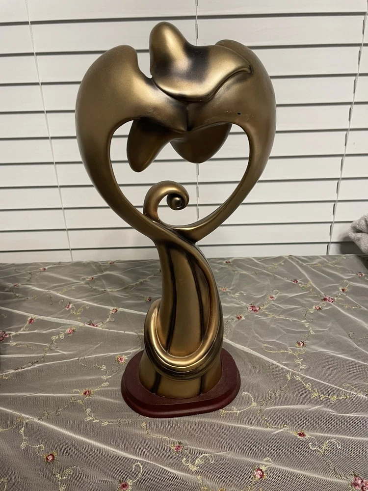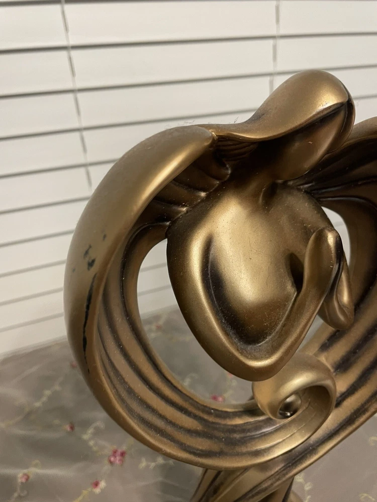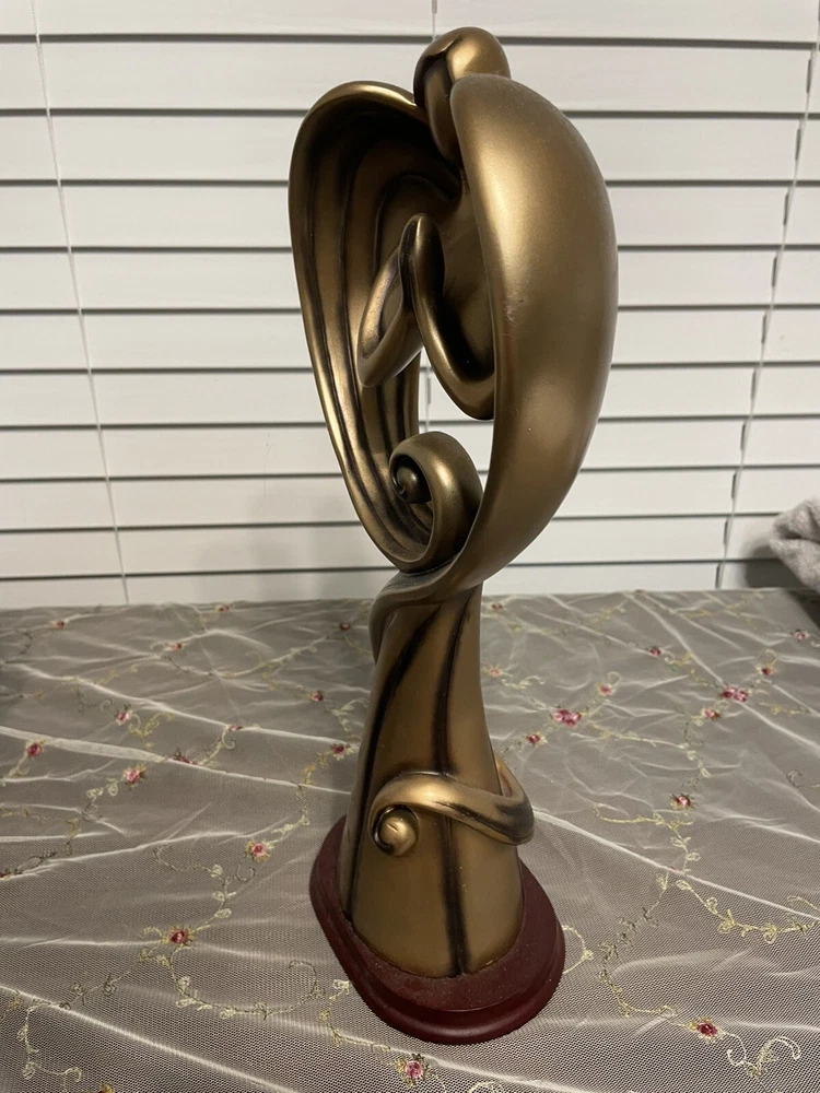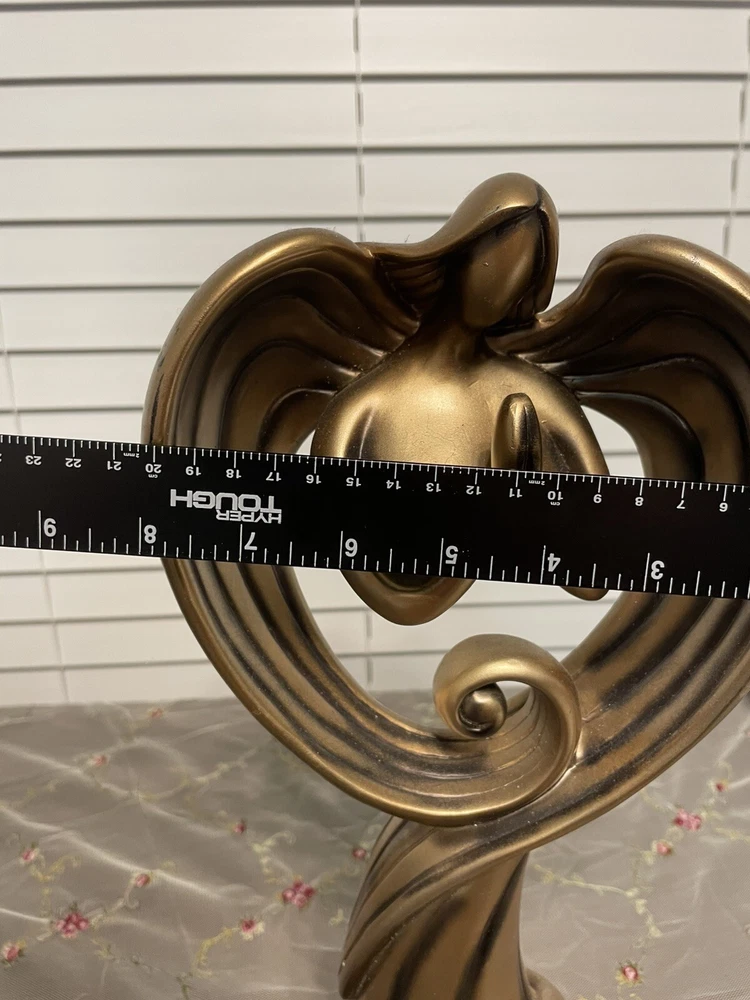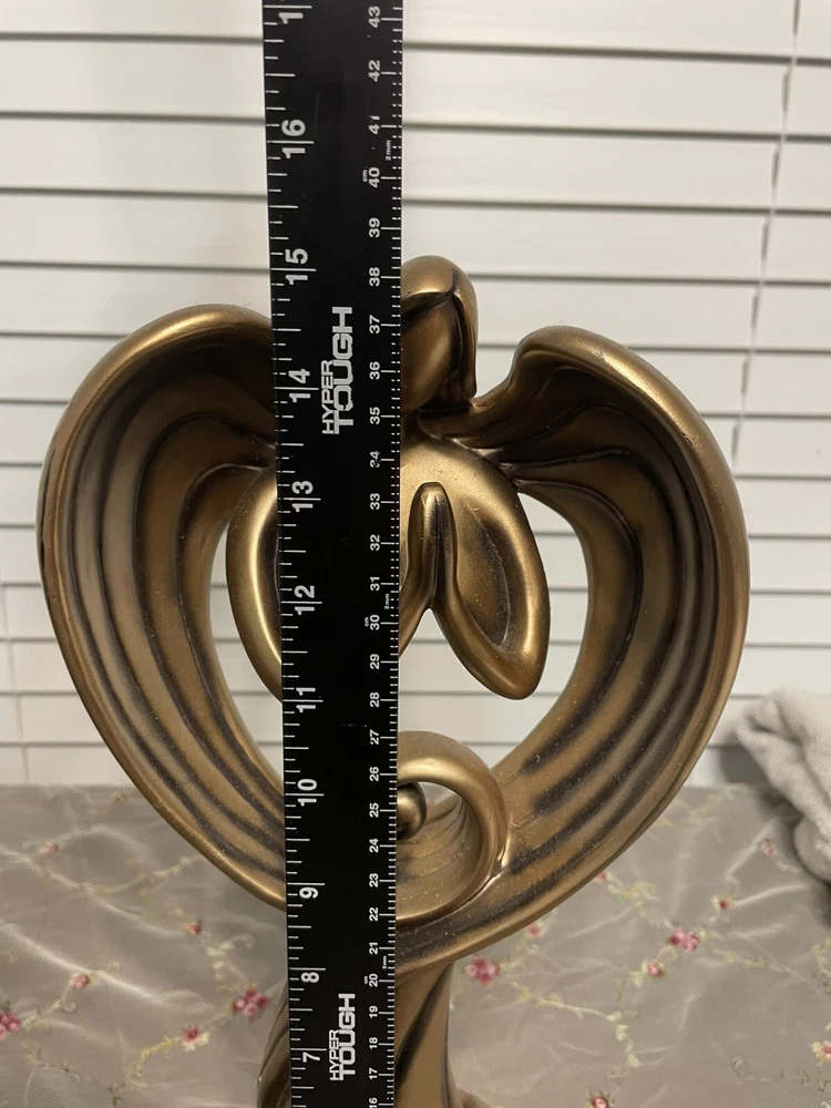 The product is a large 15" Faux Bronze Sculpture Statue of an Angel, with a contemporary art style on a wood base. The statue is made of either bronze or resin and weighs heavily. It features a realistic depiction of an angel and fits well with Americana or Art Deco decor themes. The sculpture stands 15" tall and has a width of 8". Perfect for art enthusiasts or those interested in religious-themed decorations.