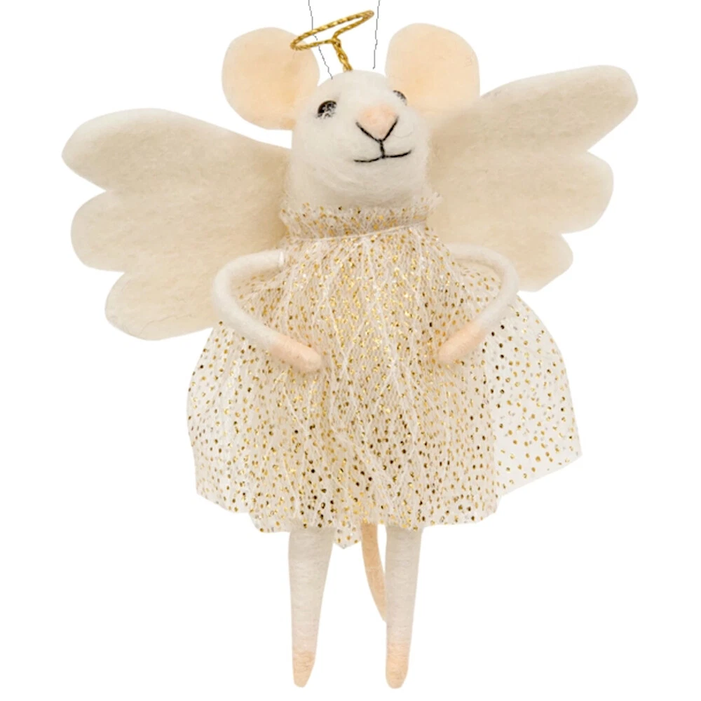 Angel Mouse Christmas Tree Ornament WHIMSICAL DESIGN: Charming mouse with wings and halo, capturing the magical spirit of Christmas. Add a touch of whimsy to your holiday décor! SIZE: 5 Inches EXQUISITE CRAFTMANSHIP: Showcases meticulous handcraftsmanship, highlighting the artistry and attention to detail put into creating this enchanting wool ornament. IDEAL GIFT: Unique design and exquisite craftsmanship make this a standout present for friends and family as a keepsake collectible item. Spread the holiday cheer by surprising your loved ones with this enchanting and whimsical Christmas ornament. Sweet Angel Mouse Ornament is waiting to sparkle on your Tree Perfect to brighten any Christmas tree, wreath, garland, or mantel. This delightful holiday decoration captures the whimsical spirit of the season with its adorable depiction of a mouse with angel wings and a halo. Handcrafted ornament showcases the artistry of wool craftsmanship. Made of high-quality wool, this ornament offers a unique alternative to traditional holiday decor. Each piece is meticulously shaped and sculpted to bring out intricate features. Makes a wonderful gift! Whether you're looking to surprise a loved one or seeking a unique collectible for yourself, this ornament is sure to bring joy and delight to anyone who receives it. Celebrate the magic of the holiday season and embrace the spirit of joy, wonder, and elegance by adorning your home with this enchanting and delightful ornament. New