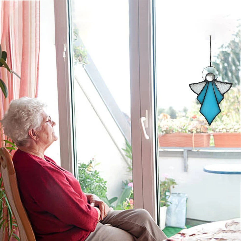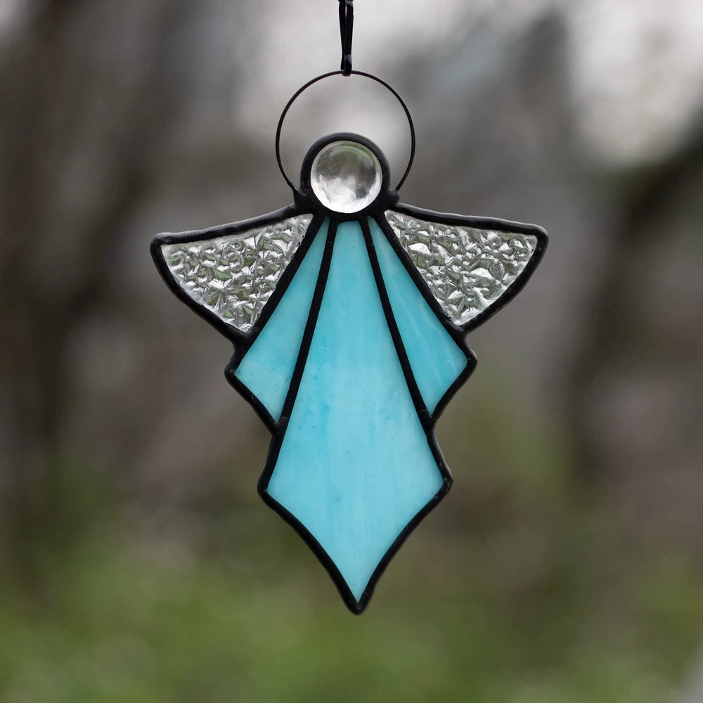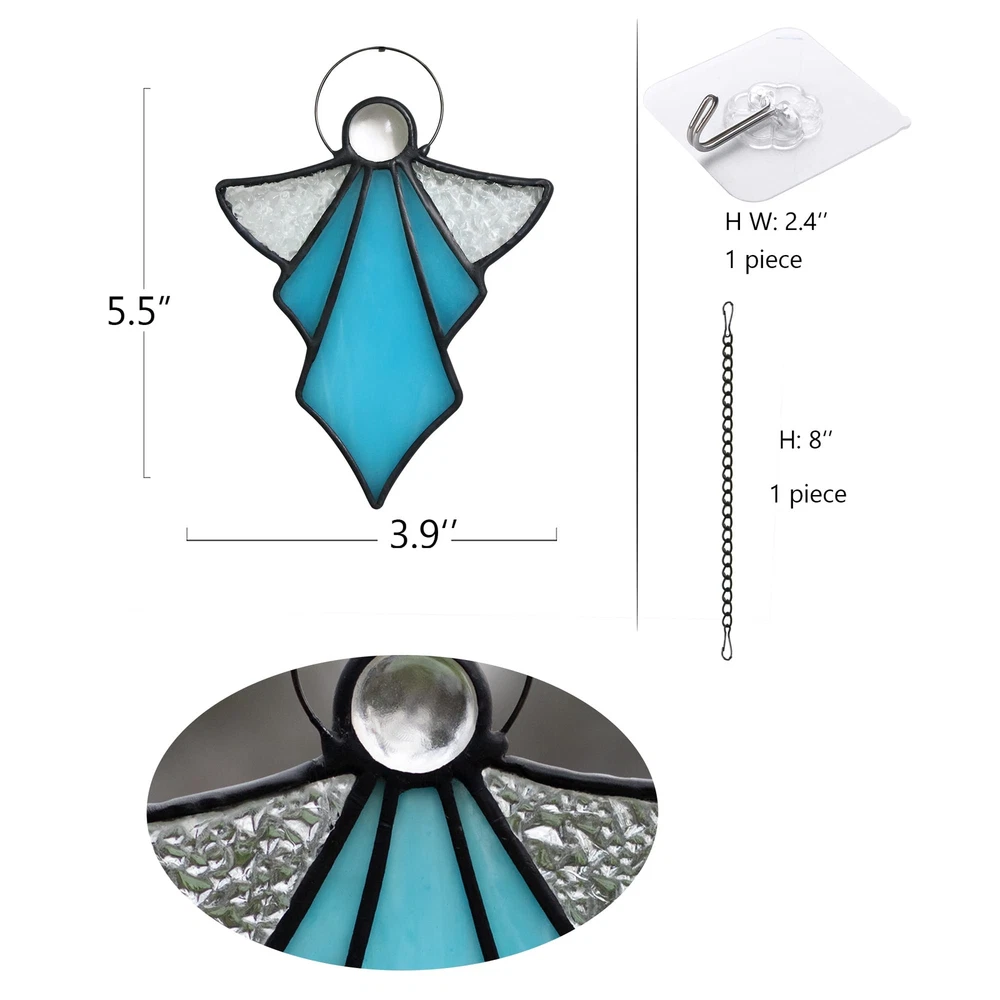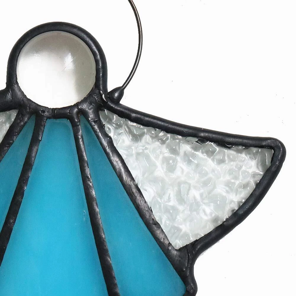 Angel Ornament Material: stained glass, copper foil, strong metal chains and suction cup for easy hanging . Special: Well welded by 3mm stained glass material, color will never change and fade. Amazing Stained Glass Window Hangings: More than a hanging ornament, made with sun-through and opaque glass pieces that allows glass shape and textures shadow to shine through onto other surfaces, so you will get colorful sunshine on your window or wall. Perfect Gift And Decoration: This multicolored stained glass handmade hanging ornaments would be a great decoration on window, wall, patio, garden and living room. Also, it can be used for party favors,birthday gift ,mother's day gift ,thanksgiving day gifts for any occasions and everyday use. Note: Glass is fragile,pls take care of use it. Small parts not for children under 5 years old. It's normal to have bubbles in stained glass. Blue Angels is made from many pieces of stained glass , create a unique design.Blue Angels can be used to decorate homes or memorial remembrance sympathy gifts,nurse gift. Blue Angels is skilled handmade by stained glass sheet NOT cheap plastic or resin , which can stand fire and never color fade. TIFFANY STYLE Handcut stained glass pieces are soldered together using the copper foil method.Each product will be presented with strong metal chains and sticker hooks for easy hanging .Each sun flower will be presented with strong metal chains and suction cup for easy hanging . t's not just amazing stained glass window hangings. When made from sunlight and opaque glass sheets, it allows the shadow of the shape and texture of the glass to shine on other surfaces, so you can get colorful sunlight on the windows or walls. Special handmade gift for your lover, parents, children, friends,clients and colleagues etc, great choice for home decoration. Quality assurance one month return and refund guarantee.