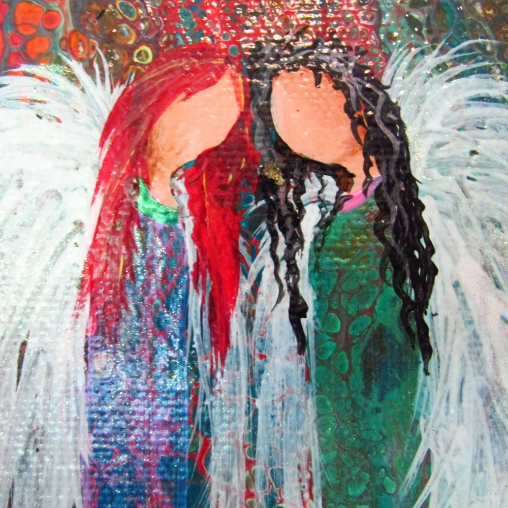 This colorful painting features a pair of "sister" angels in prayer for the good of human kind . Painted by Rain Crow. It is multi colored and done in an abstract style with a pour painted background. It was painted on quality canvas and back stapled for security. It's multi color makes it usable for any space. You may frame it for a larger look. 4" x 6" x 1 1/2" Title: Angel Sisters in Prayer Varnished. Please ask questions before purchase. Note: The photos are zoomed in to provide details. They may appear extremely large in the photos. Please see actual size above. COMBINED SHIPPING is available automatically at checkout. I cannot hold items after you pay. Once you pay for an item, It MUST ship within 24 hours. If you wish to combine, ALL items must be paid for the same day. ANG-4x6-GAL