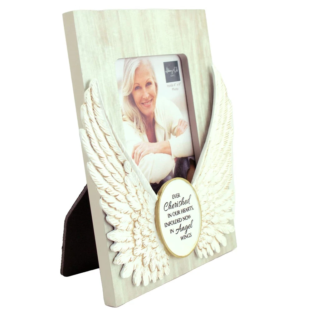 ***Forever in Our Hearts*** Make every home a loving place full of precious memories. With Abbey + CA Gift’s Angel Wings Memorial Photo Frame, you can honor deceased loved ones and cherish their memory each day. Our beautifully crafted 7.75” x 8.63” frames hold a 4”x6” photo of our treasured guardian angels. The antique white engineered wood is enfolded in intricate white metal wings, honoring the truly special love we have for lost family and friends. In remembrance of those who have passed, you can preserve their love and light and help them rest in peace by adding their pictures to your home decor. This easel-backed frame can be displayed or hung, with a memorial quote reading, "Ever cherished in our hearts, enfolded now in angel wings." While death and loss may leave us feeling like a part of us is missing, these touching gifts can keep a piece of heaven in our hearts forever. Your beloved mom, dad, wife, aunt, baby, grandma, or sister is only a glance away, keeping your moments of happiness close with beautiful photos that embrace and honor their memory. ***Gifts of hope and faith*** Abbey + CA Gift is a family-owned and operated manufacturer and wholesale distributor dedicated to helping people celebrate the lives of those we hold dear. These frames are designed by artists, and make a heartwarming gift for moms, sisters, papas, friends, and family that have lost someone close to them. They arrive in a protective white box to preserve your memories for years to come. While death or miscarriage may forever change us, the exquisite art and personalized photos are perfect for remembering our loved ones and keeping our faith. We can keep them in an eternal embrace, forever in our hearts and our homes. CHERISH THEIR MEMORY FOREVER: This beautiful frame is the perfect way to hold your loved one who has gained their wings in remembrance; Measures 7.75-inches x 8.63 inches and holds one 4x6 inch photo; Comes ready to hang or stand with an easel back ENFOLDED IN ANGELS WINGS: Keep your memories with your deceased family member or friend close by with this frame that enfolds your picture in angelic wings and a memorial quote reading, "Ever cherished in our hearts, enfolded now in angel wings" BEAUTIFULLY CRAFTED DESIGNS: Our soft and classic memorial keepsake frame was designed by artists and is made of engineered wood with metal angel wings adhered to the front, making the perfect keepsake to display a portrait of one who has passed HEARTWARMING GIFTS: Our heart-felt frame makes the perfect gift for anyone who has lost someone dear, whether it be their mom, Dad, Grandma, Grandpa, Brother, Sister, or friend, this commemorative gift will help them grieve their departed loved one GIFTS OF HOPE AND FAITH: Abbey + CA is a family-owned and operated manufacturer and wholesale distributor dedicated to helping people celebrate their loved ones with heartwarming, expertly crafted items that leave a lasting impression