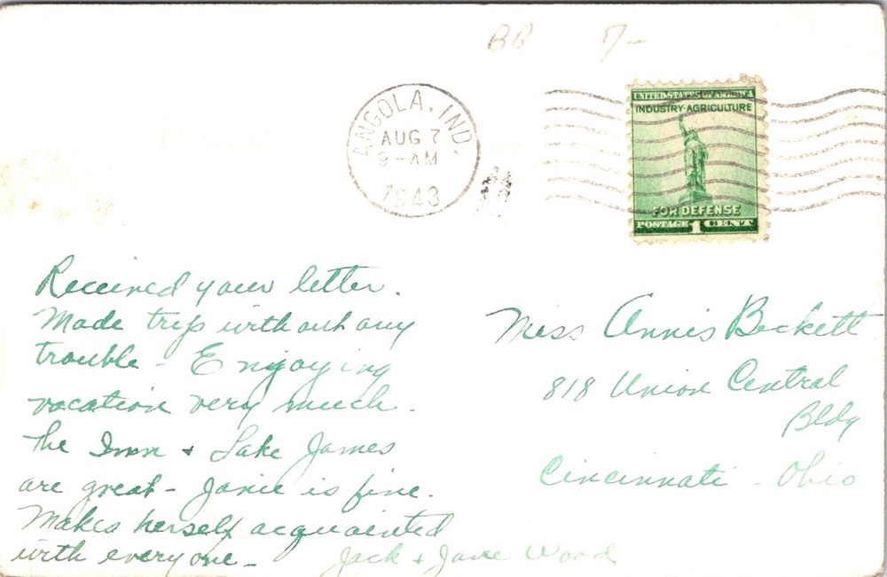 Angola Indiana Pokagon State Park Lake James Potawatomi Inn 1943 Vintage RPPC Postcard 24013