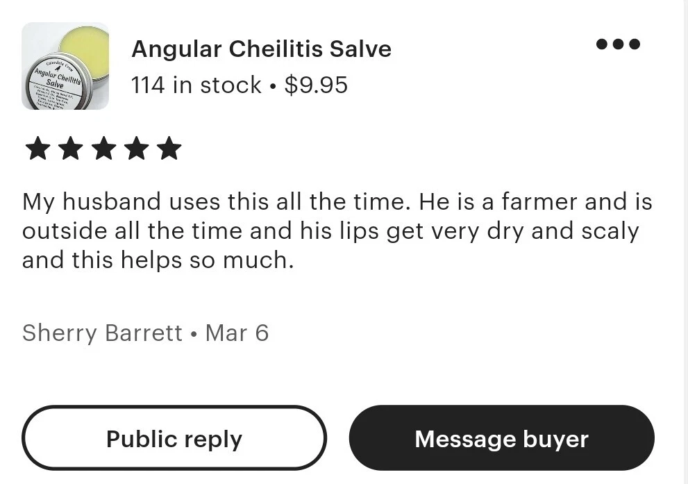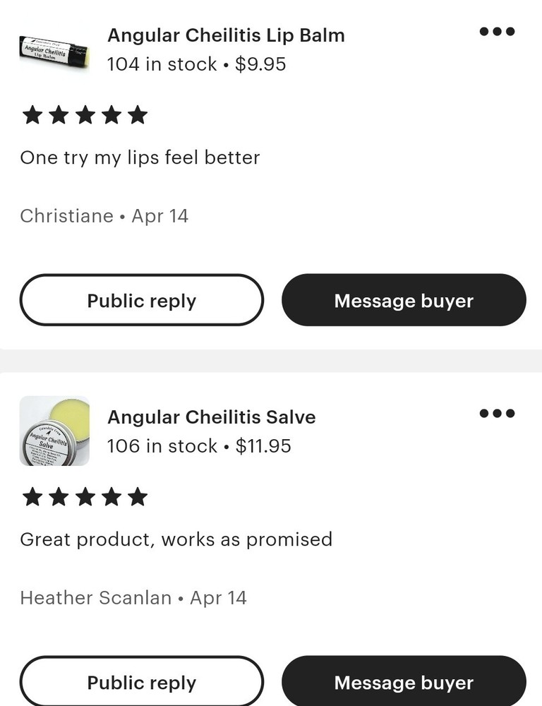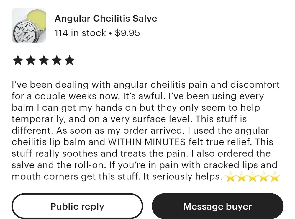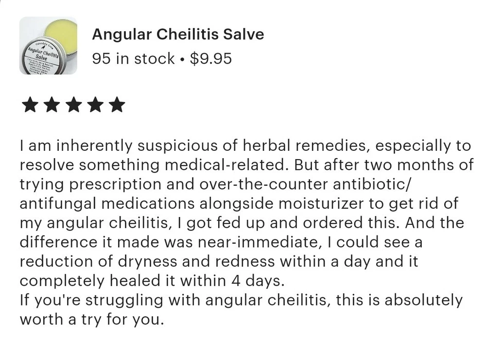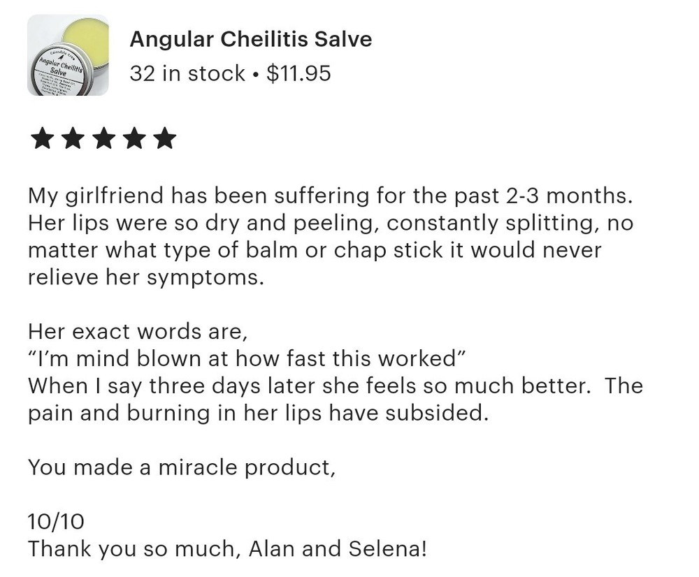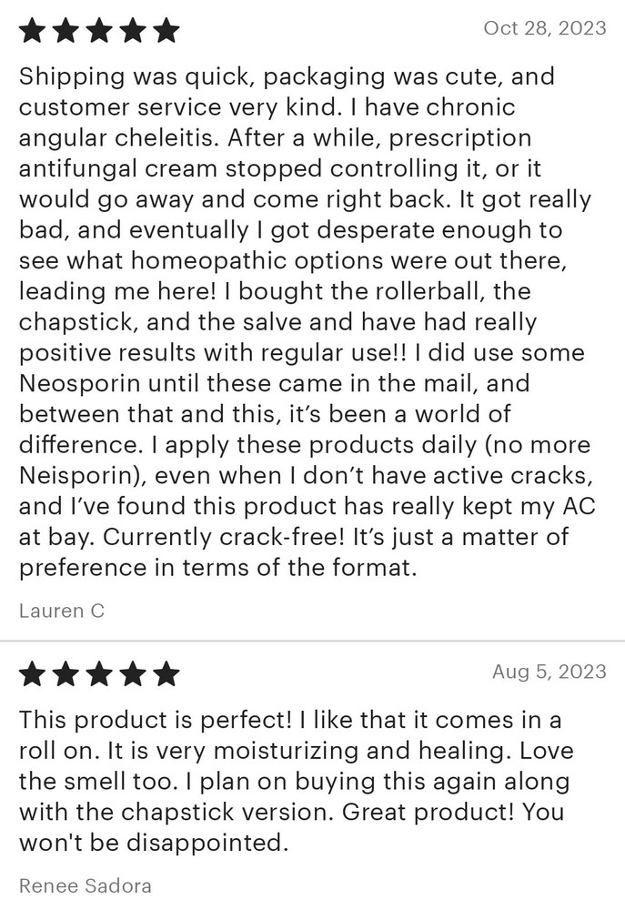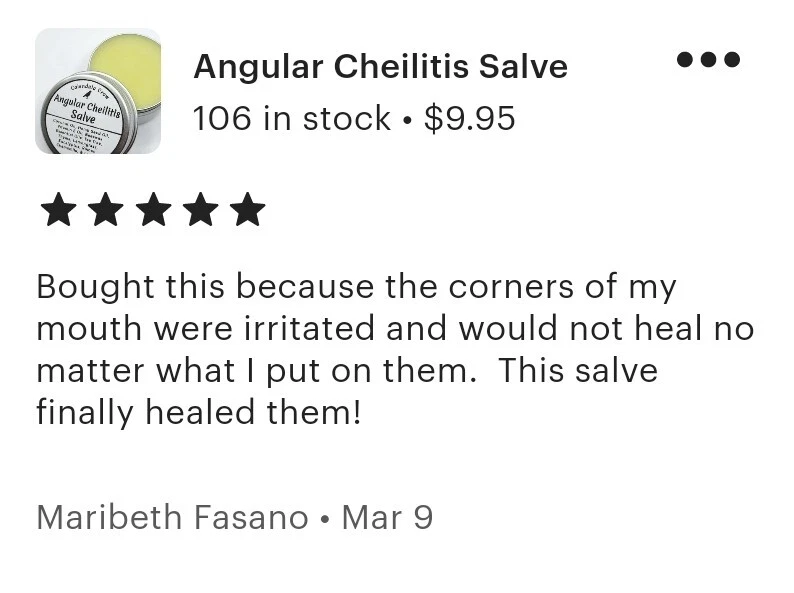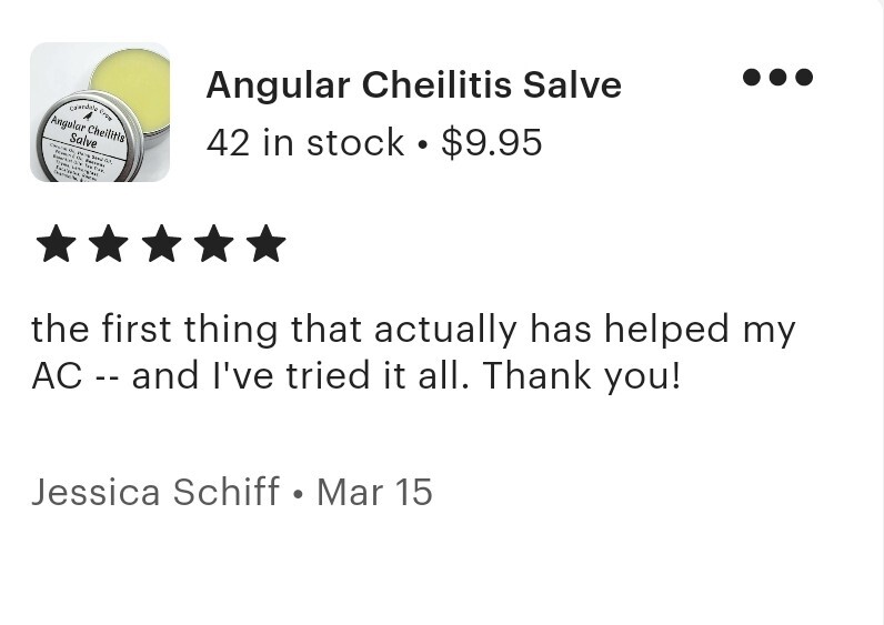 This salve was formulated specifically for Angular Cheilitis by using a blend of therapeutic essential oils. Ingredients: Coconut Oil, Hempseed Oil, Vitamin E Oil, Beeswax, Essential Oils: Tea Tree, Lemongrass, Thyme, Roman Chamomile, Eucalyptus, & Lemon. ▪︎ Suggested use: Apply a small amount of the salve to the corners of the mouth, lips, or affected area 2 to 3 times a day. With an essential oil dilution of 2.5% this product is intended for Adult use only. External use only. Avoid contact with the eyes. Test the salve on a small patch of skin prior to use. Discontinue use if irritation occurs. Do not use if pregnant or nursing. Keep out of reach of children. 🪴 I have worked with herbs and oils for over 20 years, it's truly my passion. I create all of my products using top therapeutic ingredients, and make everything in smaller batches to ensure quality and freshness. The raw materials we use are sourced from the same, reputable vendors to maintain a high level of consistency within our products. Thank you for allowing me, to help you.