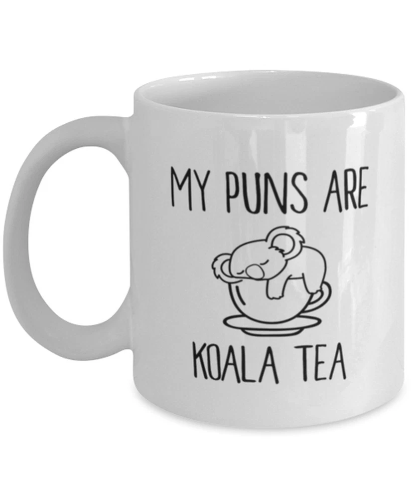 Animal Puns Funny Coffee Mug My Puns Are Koala Tea - White Coffee Mug Product Details.. This high quality 11oz. ceramic white mug has a premium hard coat that provides crisp and vibrant color reproduction sure to last for years. Perfect for all hot & cold beverages. The highest quality printing possible is used. It will never fade no matter how many times you wash it. Material: 100% Ceramic. Print both sides. Dishwasher and Microwave Safe. High Gloss + Premium White Finish. Printed in the U.S.A. Personalized & Custom. We support personalized and custom mug to add custom, when placing an order, you can add notes to the "order note" in shipping address section. Also you can contact us directly via message. Shipping Info. Ready to ship in 1 to 2 business days, All products are made-to-order and proudly printed in the United States. Shipped by USPS and DHL, You will receive your order in 5-7 days. Replace & Refund. All products are defective during shipping broken, chipped will be replaced free of charge. You are not satisfied with the product, we will refund 100% money to you. If any other issues arise, please do not hesitate to message, we would be more than happy to assist you.