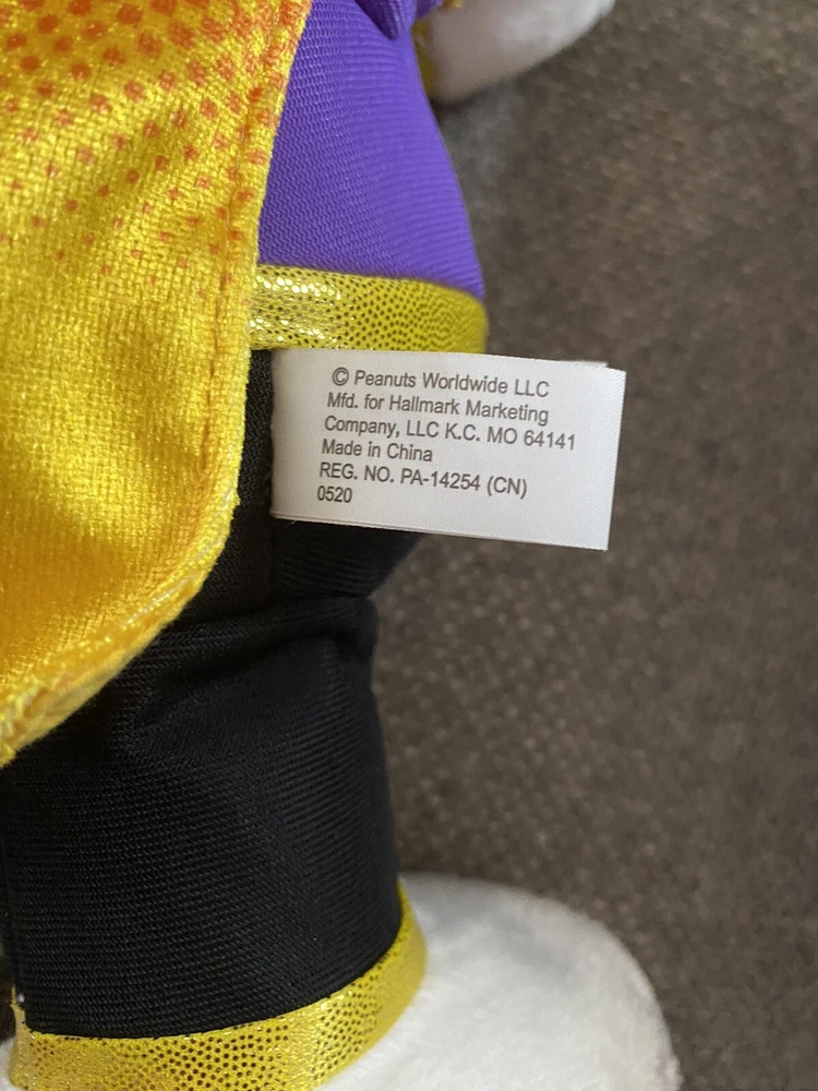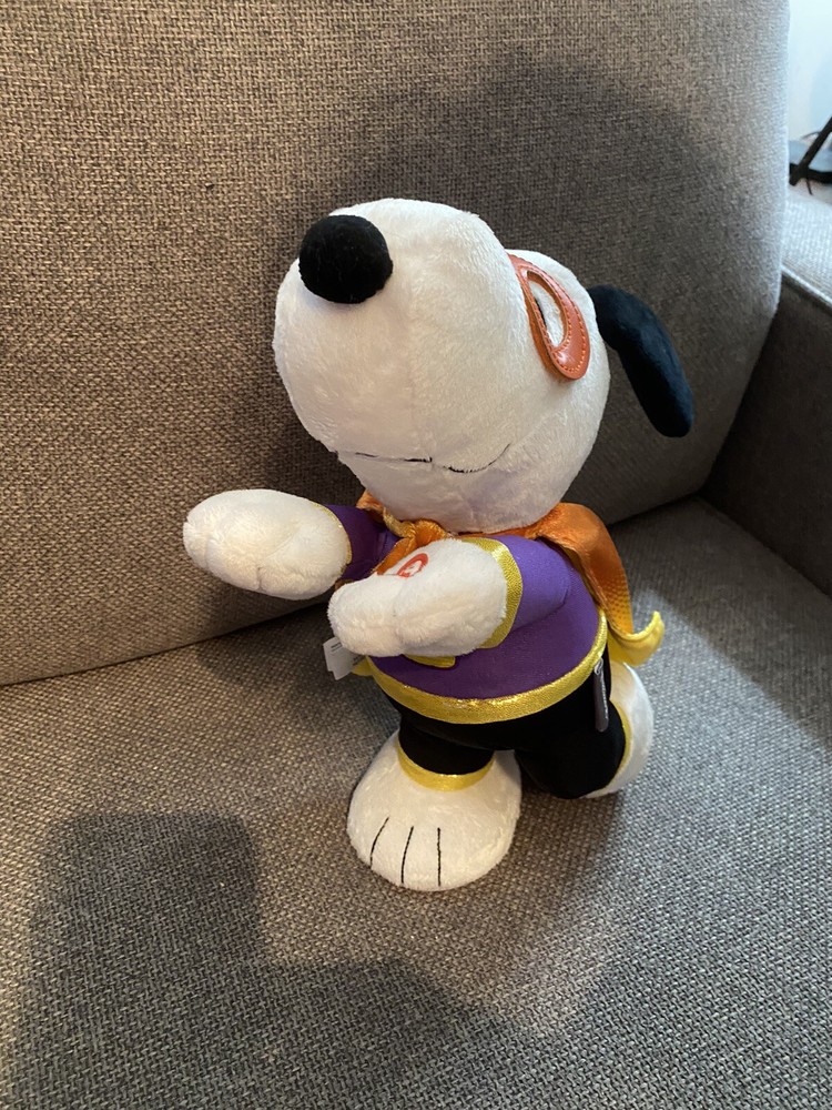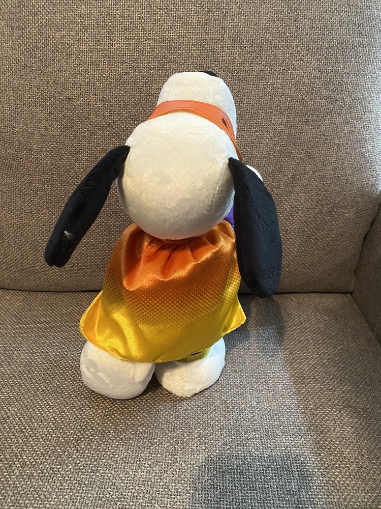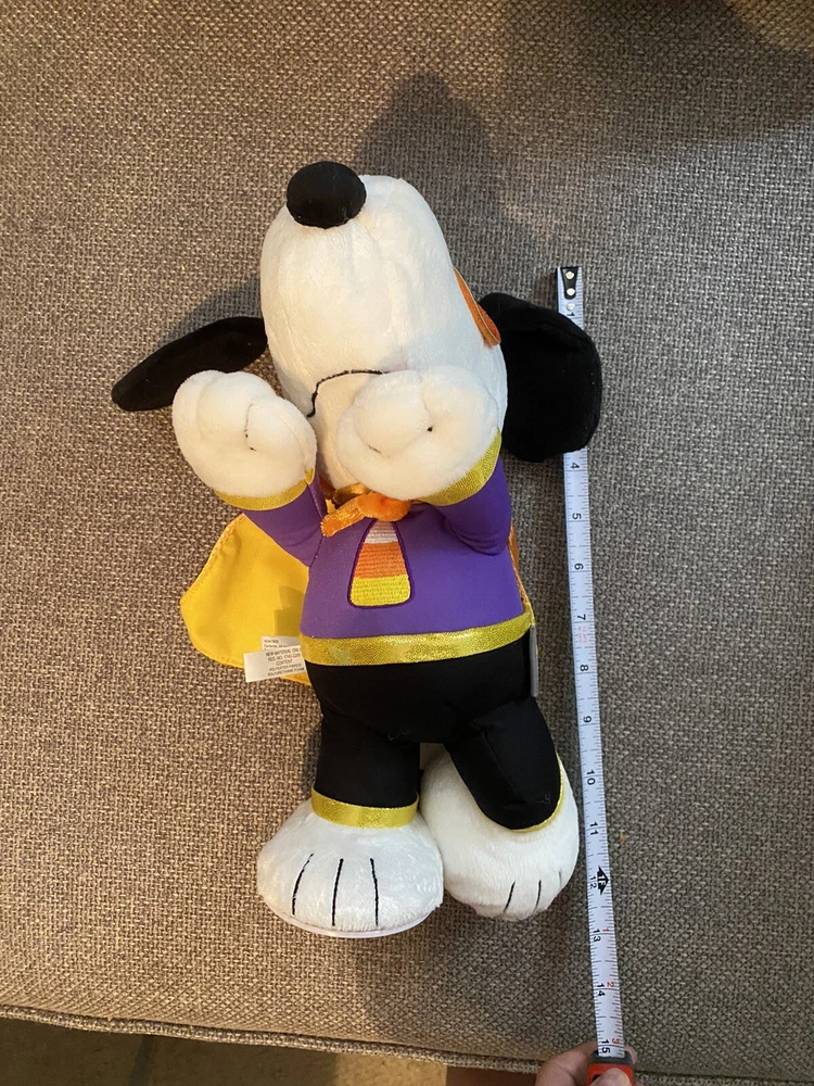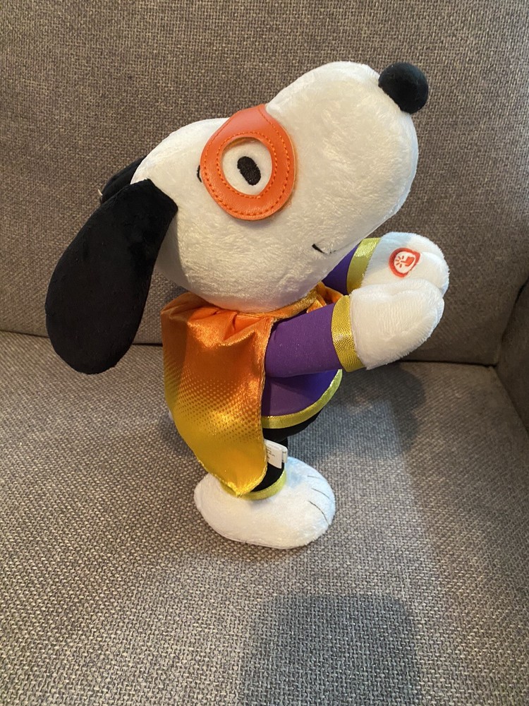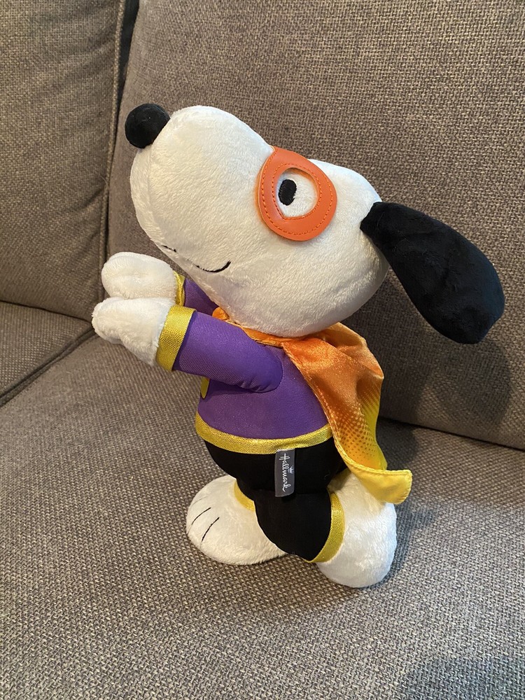 Plush Animated Hallmark Candy Crusader Snoopy Sound Motion Halloween Peanuts. Preowned, but works perfectly and is in great condition. Is that Charlie Brown's friendly beagle or the Candy Crusader on a quest to "rescue" all the candy from his friends on Halloween? Have some fun this trick-or-treat season when you press the button on this plush Snoopy who's decked out in a super hero costume with a mask and cape. Ready to embark on his mission, Snoopy laughs and howls as he spins around while "The Ride of the Valkyries" plays. Requires three (3) AA replaceable batteries, included. Measures 5" W x 11.75" H x 10.5" D.