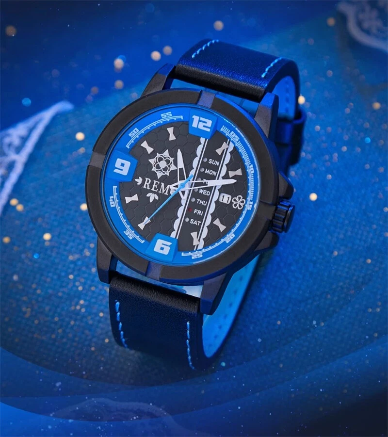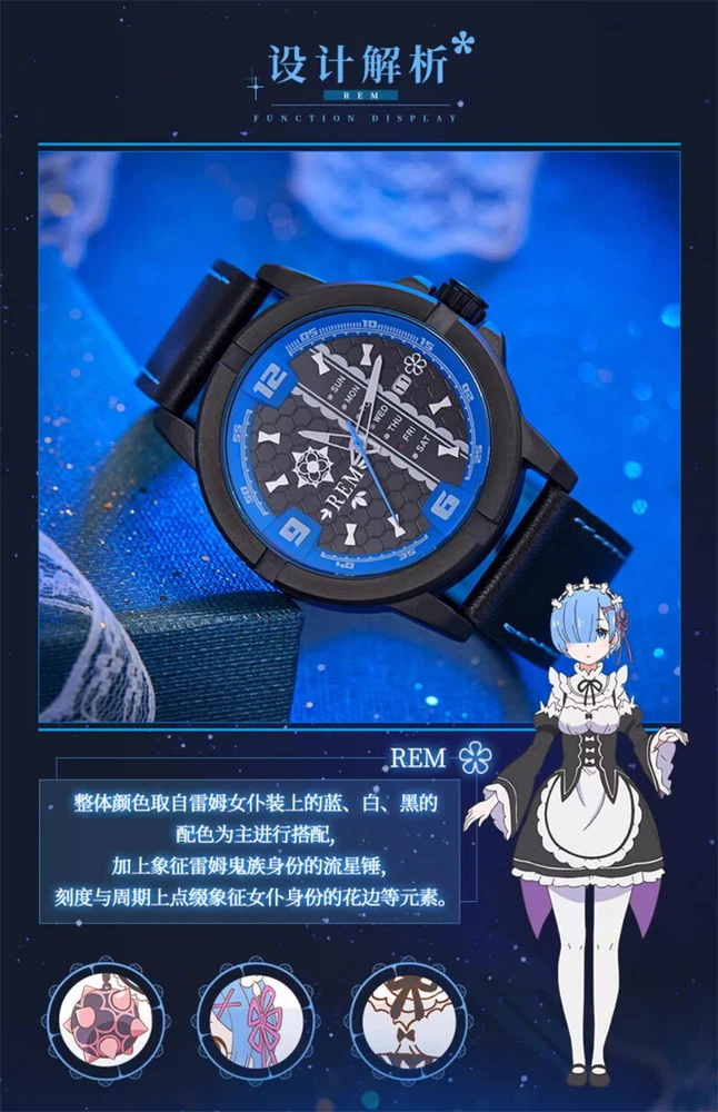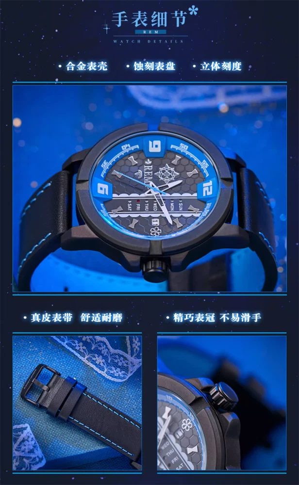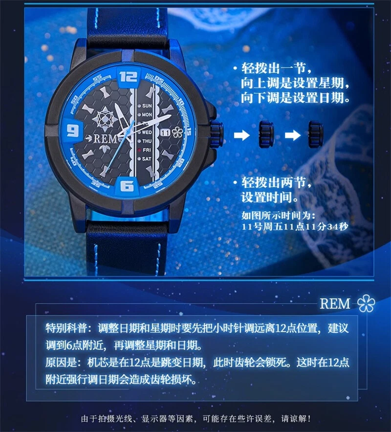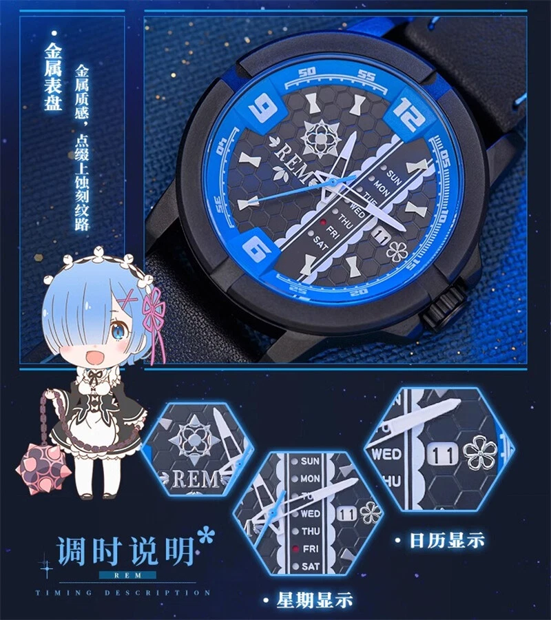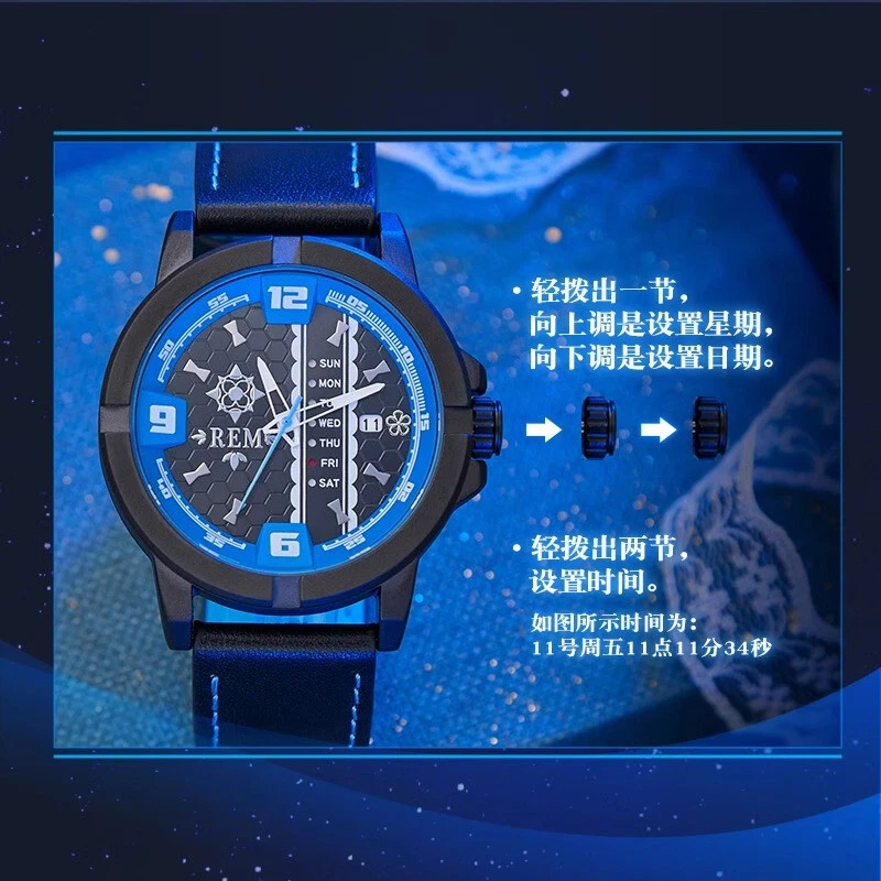 Anime Re: Life In a Different World From Zero Quartz Watch Rem Quartz Wristwatch 100% Brand new & High quality Color: (As shown in picture) Package: 1 Pc Gently dial the first section, up to set the week, down to set the date. Gently dial out two sections and set the time. As shown in the picture, the time is: 11:11:34 seconds on Friday, 11th. Special science popularization: When adjusting the date and week of the month, you should first adjust the hour needle away from the 12 o 'clock position, it is recommended to adjust it near 6 o 'clock, and then adjust the week and date. The reason is: the movement is at 12 o 'clock is the jump date, at which time the gear will lock. When the hour needle is around 12 o 'clock, forcing the date will cause damage to the gear. Note: The real color of the item may be slightly different from the pictures shown on website caused by many factors such as brightness of your monitor and light brightness. Type Wristwatch Model Rem Features 12-Hour Dial Department Unisex Adults Style Anime Case Color Black Dial Color Black/Blue Band Color Black Case Material Alloy Band Material Leather Display Analog Movement Quartz Closure Buckle Case Size 45 mm Case Thickness 12 mm Band Width 22 mm Watch length 250 mm Theme Anime Character Family Re: Life In a Different World From Zero Character Rem TV Show Re: Life In a Different World From Zero Year Manufactured 2024 Brand Unbranded MPN Does not apply Country/Region of Manufacture China Vintage No