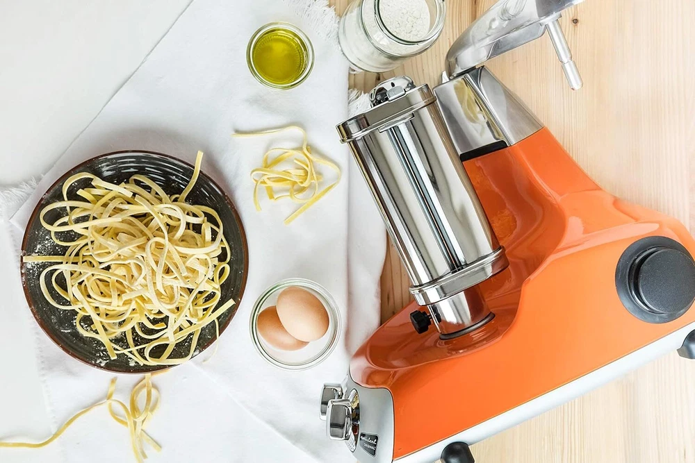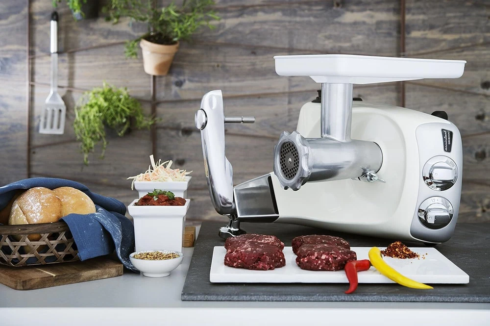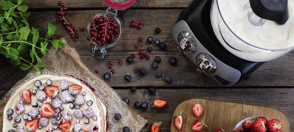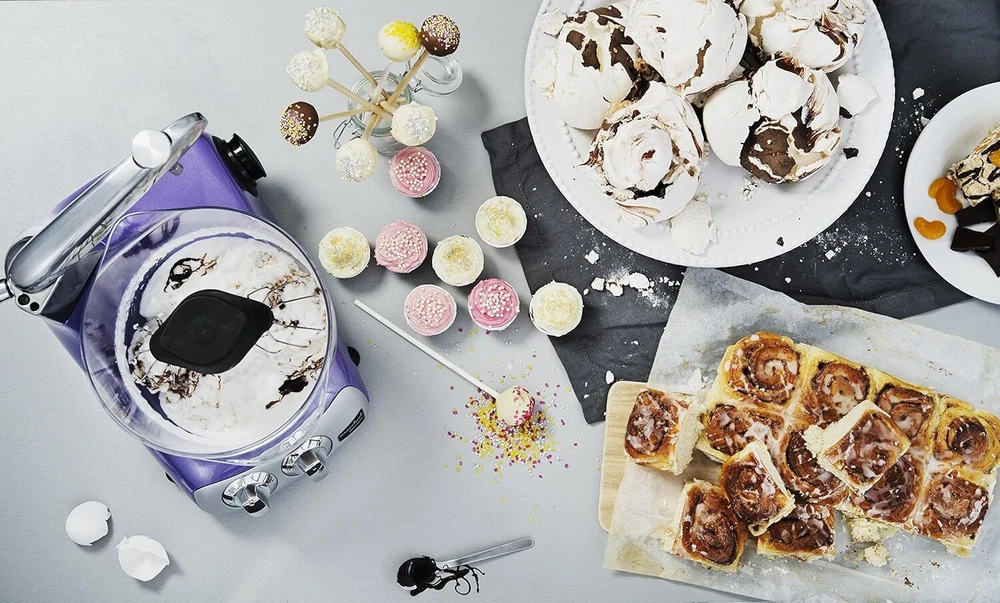 Basic Package Includes: 7L stainless steel bowl, 3.5L Double whisk bowl assembly (bowl, whisks, head gear, and shaft), Dough hook, Roller, Scraper, Spatula, Dust cover / accessory bowl, Cookie Beaters, Removable power cord, Instructional DVD, Owners Manual Powerful and quiet 600 watt motor features self adjusting speed control. Includes 12 minute timer and bowl speed control (adjusts from 45 to 130 rpm) Unique engineering puts the motor in the bottom of the unit. A movable steel arm holds the roller with a separate scraper that simultaneously rolls and kneads dough and batter Mixer may be turned on its side to accommodate a variety of attachments purchased separately. These include a meat grinder, vegetable slicer, blender, citrus press, strainer, grater, pasta discs, flake and grain mills and cookie press Large plastic beater bowl whisks meringue, creams butter and icing and holds up to 18 egg whites