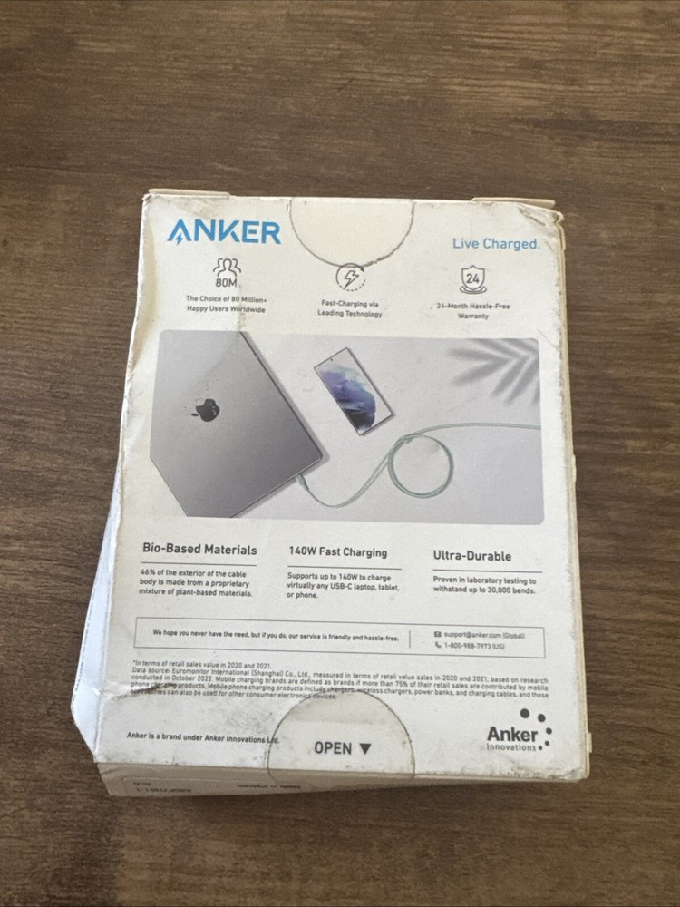 Anker 544 Bio-Nylon 140W USB-C to USB-C Cable 10ft - Green OPEN BOX. Shipped with USPS Ground Advantage.