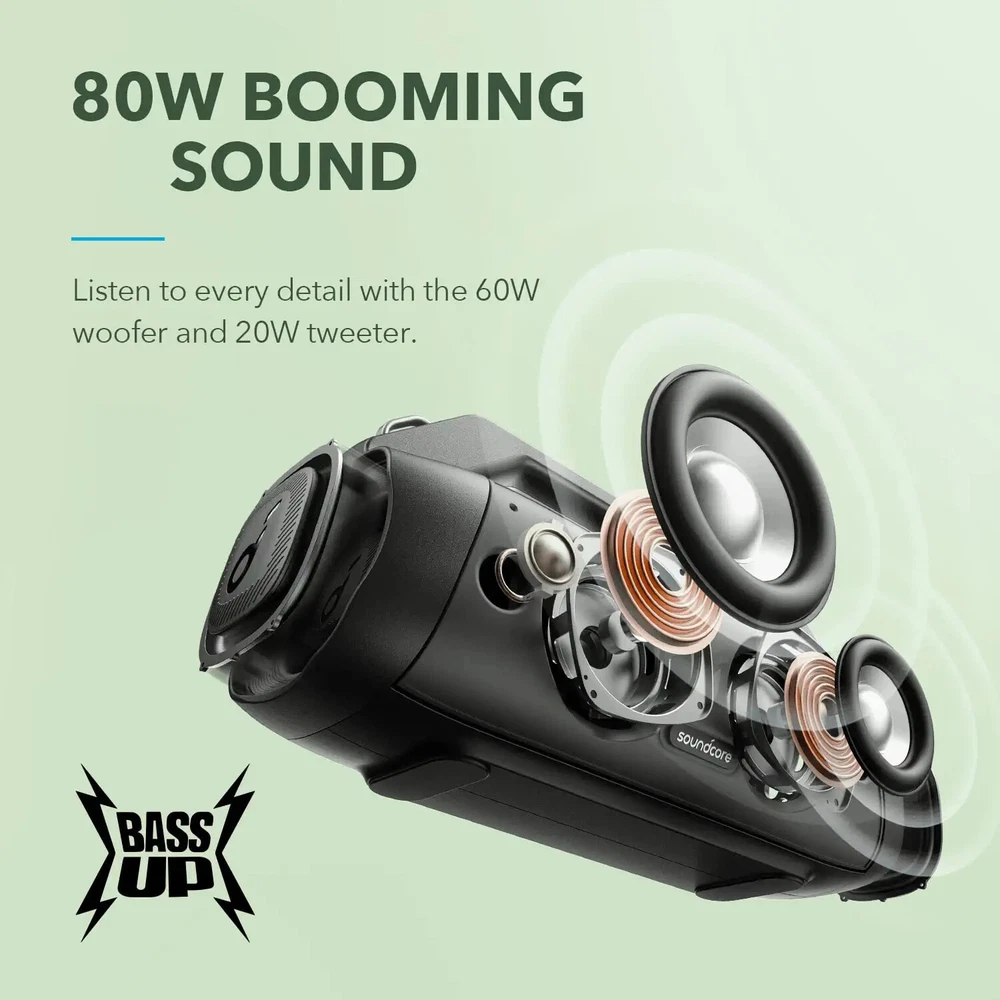 Anker Soundcore Motion Boom Plus Outdoor Speaker with 80W Booming Sound, 20H Playtime, IP67 Waterproof and Dustproof, Type-C, Custom EQ, Bluetooth 5.3, Portable Bluetooth Speaker For Outdoors, Camping | eBay Certified Refurbished Product Details Key Features Super Powerful Stereo Sound Enjoy 80W of body-shaking sound thanks to two tweeters and woofers. Hear every detail in music! Extreme Bass Soundcore's proprietary BassUp technology intensifies a song's low frequencies in real-time so you can enjoy music with thumping beats. Convenient and Highly Portable Motion Boom Plus outdoor speaker has a built-in handle and detachable carrying strap that offers great portability. Up to 20 Hours of Playtime Motion Boom Plus portable speaker has a 13,400mAh battery capacity that enables you to enjoy non-stop music all day long. IP67 Rating Motion Boom Plus waterproof speaker is dust-proof and can survive any water splashes, unexpected spills, or downpours for all-day listening by the beach or poolside. PartyCast 2.0 Reach unbelievable volumes and amplify your listening experience by linking over 100+ PartyCast-compatible speakers together. True Wireless Stereo (TWS) For huge stereo sound and double the volume, pair two Motion Boom Plus speakers. Bluetooth 5.3 and AUX-IN Get seamless music streaming with Motion Boom Plus Bluetooth speaker's rock-solid Bluetooth connection. To enjoy high-quality sound, connect to non-Bluetooth devices such as TVs or computers using the 3.5mm AUX input. Personalize Your EQ Customize Motion Boom Plus's EQ and create the perfect mix for your favorite music genres using the Soundcore app. Note: For peak performance, please use the Soundcore app and update to the latest firmware. Charge Out Motion Boom Plus outdoor speaker carries a convenient USB charge out to quickly charge your devices such as your smartphone, so you will never run out of power again. Specifications: Input: 5V/3A; Audio Output: 30W x 2+10W x 2 Battery Capacity: 13,400mAh; Charge Time: ≤5.5 Hours Bluetooth Frequency Range: 2402-2480MHz; Sound Frequency Range: 46hz-20kHz THD+N: ≤1% What's In The Box Motion Boom Plus Outdoor Speaker, Detachable Strap, USB-C to USB-C Cable, Quick Start Guide ▪ Waterproof and Dustproof for Any Adventure Take Motion Boom Plus to the beach or the pool without worrying about spills or submersion in water. The speaker's comprehensive protection also includes dirt-defeating dust-proofing . ▪ PartyCast 2.0 Connect with unlimited Soundcore PartyCast speakers for synchronized music and large sound . ▪ Optimized Charging With Anker's PowerIQ 2.0 technology, Motion Boom Plus can also power other devices while you're on an adventure . Copyright All Rights Reserved.