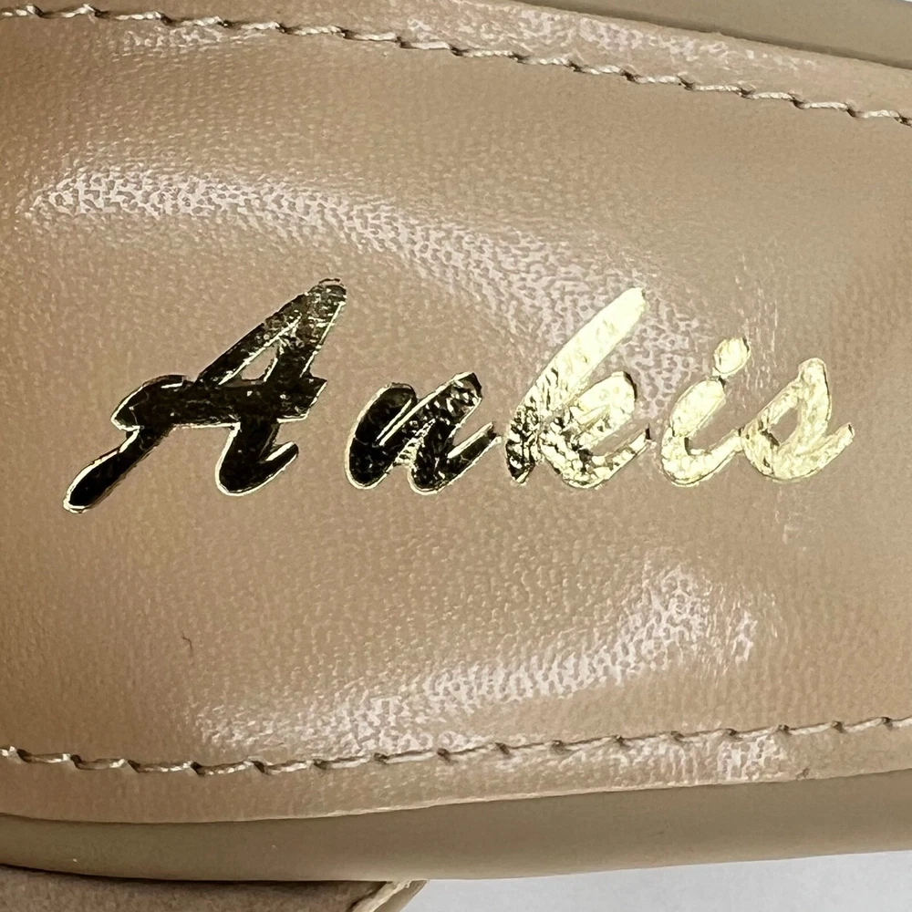 Ankis Womens Nude Gold Cross Strappy Heels Peep Toe Buckle Size 7.5 Stiletto