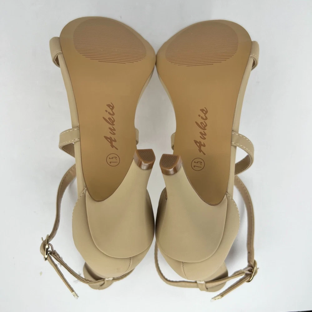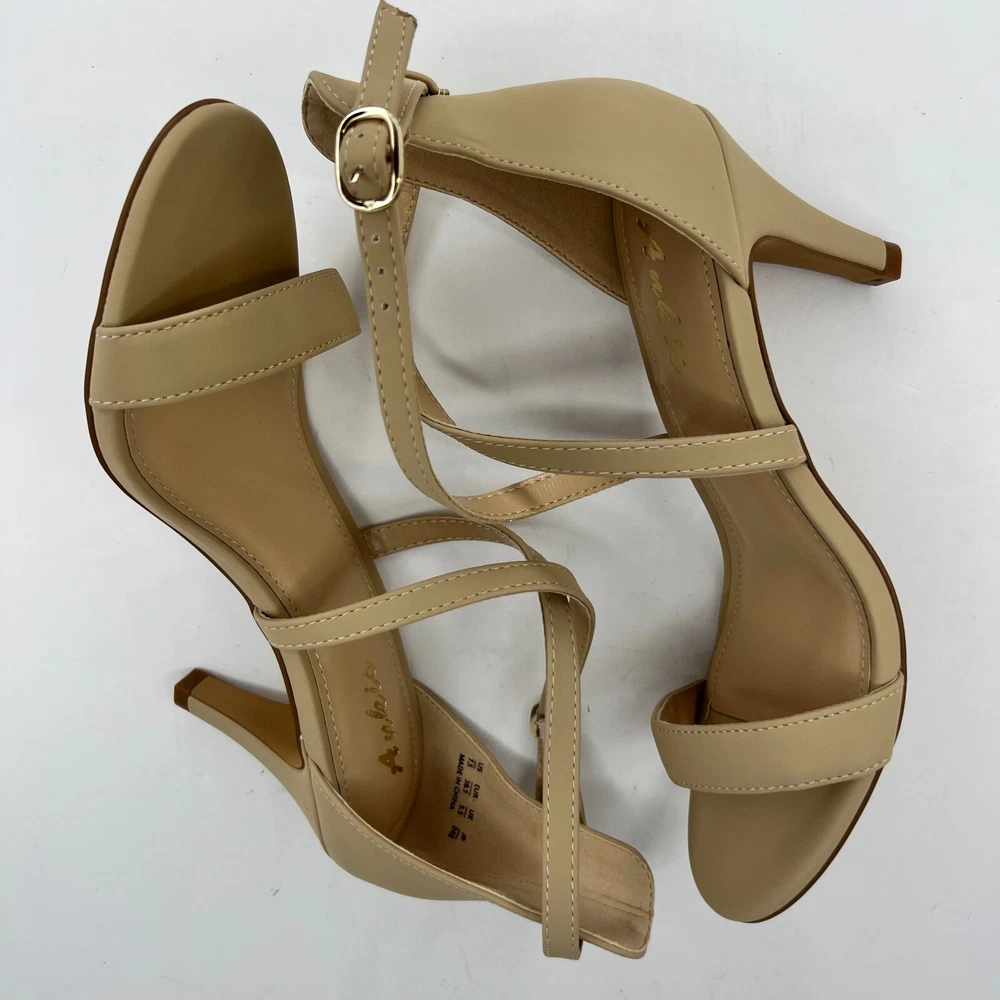 Elevate your style with these gorgeous Ankis strappy heels . The nude color and peep toe design add a touch of sophistication to any outfit. The buckle detail and hook & loop closure ensure a secure and comfortable fit. These high stiletto heels are perfect for any season, whether you're dressing up for a night out or adding a touch of glam to your work wardrobe. The leather outsole and faux leather insole provide both durability and comfort. Don't miss out on this stylish and versatile addition to your shoe collection. 100% CUSTOMER SATISFACTION IS OUR GOAL! Our items are always carefully examined for condition, measured if necessary, and photographed in a climate controlled and smoke-free environment. We make every attempt to accurately describe and clearly picture the items we have for sale. Please, ALWAYS view all of the photos. We value your business and our goal is your complete satisfaction. FAST SHIPPING All items are packaged with care and shipped out the same or next business day via USPS, FEDEX, or UPS with tracking numbers so you are always informed. RETURNS We offer a 30-day return policy. All items must be unused and unopened in the condition in which they were received, with original packaging, and all accessories included for return. REVIEWS - CUSTOMER SATISFACTION - COMMUNICATION We aim to make you happy. After you receive your shipment, please leave a positive review . If you have concerns or questions about your order, please contact us so we can resolve the issue. We will do our best to make you satisfied. THANK YOU FOR YOUR BUSINESS!