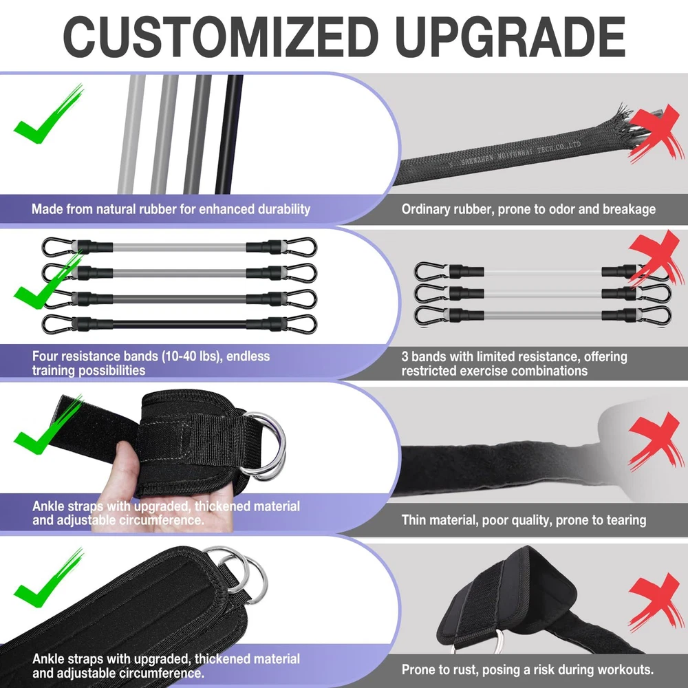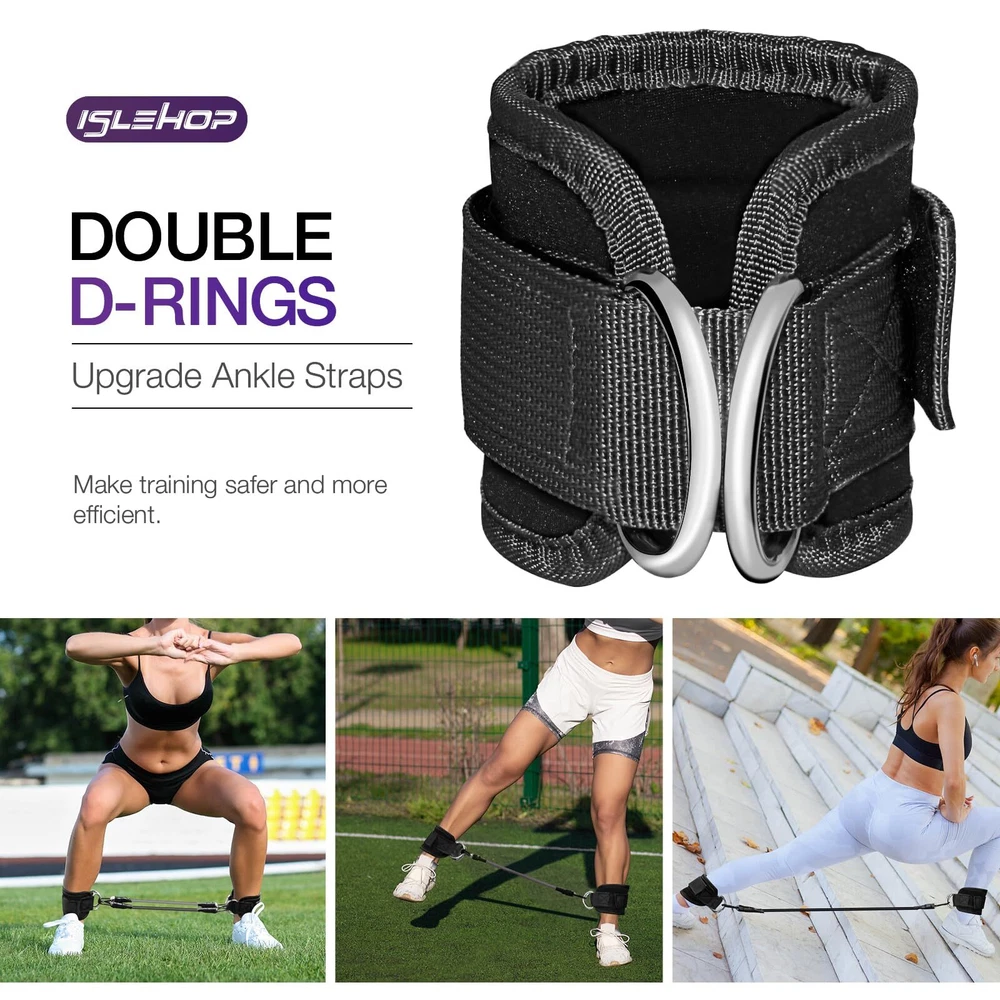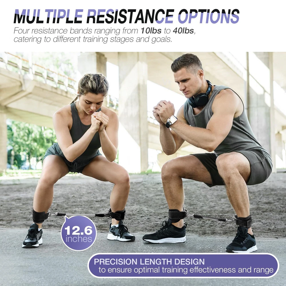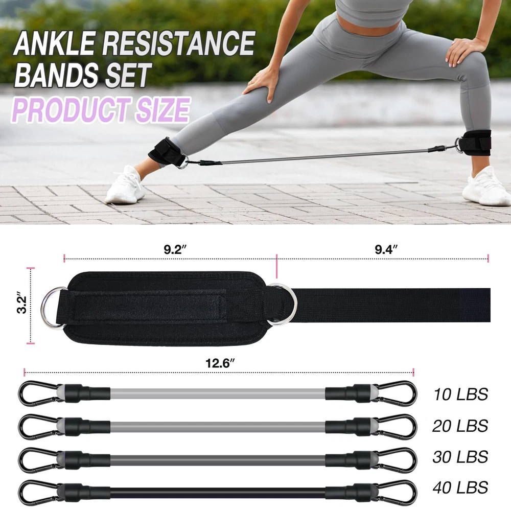 【Versatile Training Set】- These ankle resistance bands with cuffs are tailored for targeting various muscle groups, such as the legs, buttocks, and hips. Ideal for kickbacks, hip thrusts, and gluteus training, they intensify your workouts, helping you achieve a sculpted and defined lower body. 【Secure and Comfortable】 - With double D-ring loops and adjustable length, our ankle cuffs ensure a snug and secure fit for maximum comfort and safety during workouts. Essential home gym equipment for focused, injury-free exercises. 【4 Different Levels】 - Equipped with resistance levels ranging from 10lb to 40lb and a specific length of 12.6 inches, these exercise bands offer personalized fitness training options. You can customize their workout intensity by choosing different resistance levels. 【High-Quality Materials for Durability】 - These ankle cuffs feature thickened, sweat-absorbent padding for comfort during ankle workouts, while the resistance bands are made of durable natural rubber. This ankle training set is built to last, ensuring longevity and reliability. 【On-the-Go Fitness】- With a storage bag included, these ankle resistance bands are lightweight and portable, perfect for workouts at home, the gym, or outdoors. Enjoy the ease and simplicity of exercising anytime, anywhere.