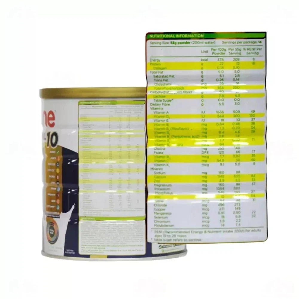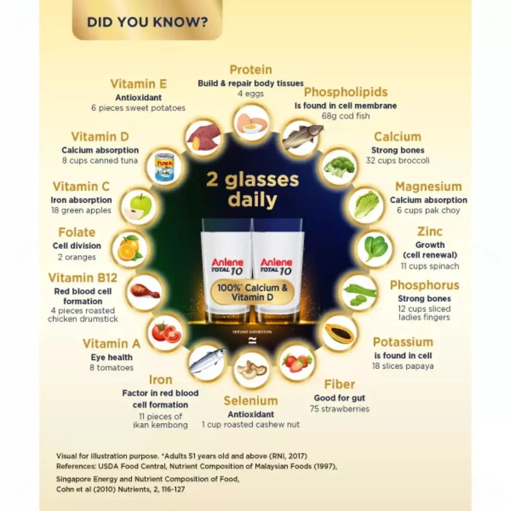 1 X Anlene Total 10 High Calcium & Collagen Adult Milk Powder 800g Ensuring our diet is always balanced may be difficult and as we age, our body becomes less efficient in absorbing some nutrients. Hence, it's crucial to make smart choices when it comes to food selection. Get the important nutrients every day to help maintain an active and meaningful lifestyle, even as we age. Anlene Total 10 is scientifically formulated with 28 beneficial nutrients & ingredients, including high calcium, high protein, MFGM Active, Collagen, Prebiotic, and lower lactose. Enjoy the 10 goodness every day. Support your overall wellness with balanced diet and active lifestyle today! Compared to regular milk. Anlene Total 10 only contains 4.3g lactose in each 200ml serving. Regular milk contains 8.6g lactose per 200ml serving. New Zealand Food Composition Database Reference. Direction for Use: Add 5 tablespoons (55g) of milk powder to 1 glass (200ml) of warm water and stir. Drink 2 glasses in a day. Ingredients: Maltodextrin, Cow's Milk Solids (Whole Milk Powder, Milk Protein Concentrate, Whey Protein Isolate & Buttermilk Powder^), Inulin, Minerals (Calcium Carbonate, Potassium Citrate, Magnesium phosphate, Potassium Chloride, Ferric Pyrophosphate, Magnesium Oxide, Zinc Oxide, Copper Sulphate, Manganese Sulfate, Sodium Molybdate, Sodium Selenite, Potassium Iodide, Chromium Chloride), Creamer Powder (Plant), Soy Protein Powder, Vitamins (Choline Bitatrate, Sodium ascorbate, Vitamin E acetate, Niacinamide, Biotin, Vitamin D3, Vitamin A acetate, Pyridoxine hydrochloride, Calcium pantothenate, Thiamine Mononitrate, Riboflavin, Vitamin B12, Folic acid, Vitamin K), Flavourings, Fish Collagen (0.2%), Emulsifier (INS 322, Soy lecithin). ^Source for Milk Fat Globule Membrane (MFGM). Phospholipid is a main component in MFGM PAYMENT We only accept payment via PayPal/Google Pay/VISA/Master Card. SHIPPING Please make sure you have read and understand all shipping information before you bid our items: · Please make sure your postal address is correct! · All item will be shipped within 4 business days , after receiving the full payment. The items shipped from Malaysia using Standard international postage and it normally take within 10-14 working days to deliver. · Express Shipping from Aboard with Full Tracking. Normally it takes 5-10 working days for delivery on all international order. If your item does not arrive within the time frame, please contact us via eBay message. · Standard Shipping from Abroad with Full Tracking. Normally it takes 10-14 working days for delivery on all international order. If your item does not arrive within the time frame, please contact us via eBay message. · Proof of shipment will be kept for future reference. · Your item will be packed up properly to avoid any damages. · To ensure a smooth delivery/transaction, please make sure your shipping address is verified and correct (which is associated with your PayPal account). We are not responsible for invalid addresses. Worldwide shipping available. CUSTOMS · Not responsible for your country’s customs. Please check with your country’s customs before you buy. · All the customs fee & taxes will be on the buyer’s responsibility. · Also allow some time for your country’s customs clearance time, because the delays usually come from Customs. · Seller are not responsible for item lost, but seller always keeps the proof of delivery. FEEDBACK We are always working hard for maintain high standards ***** of excellence and strive for 100% customer satisfaction. So your positive feedback is very important. If you have any problem with items received such as not as described or damaged, please message us. For any cases that you consider about the neutral and negative feedback, please contact our customer services executive for assistance. We will resolve your concern at your earliest convenience . We greatly appreciate your POSITIVE feedback . Please do NOT leave negative feedback without asking for help. Welcome you back to our store again.