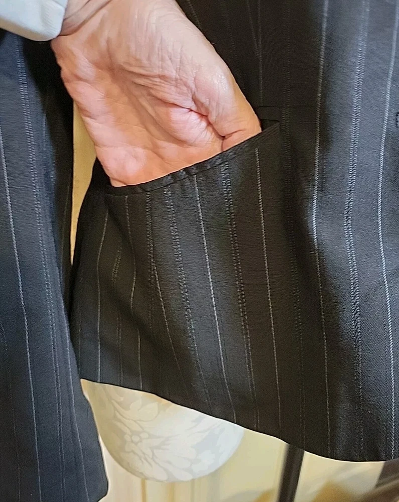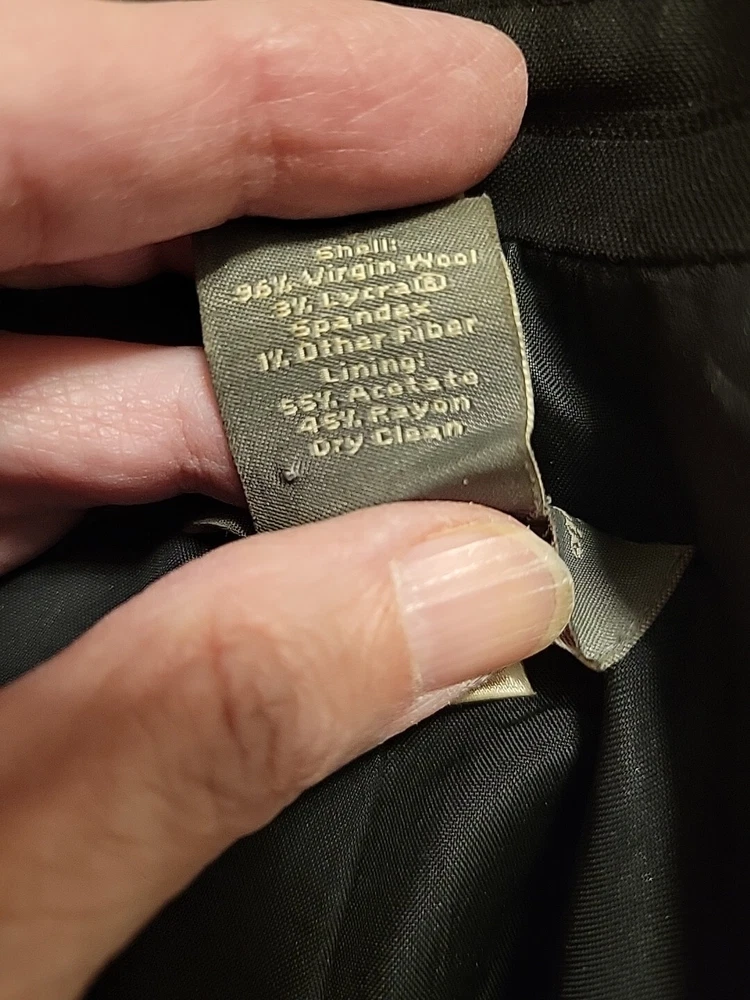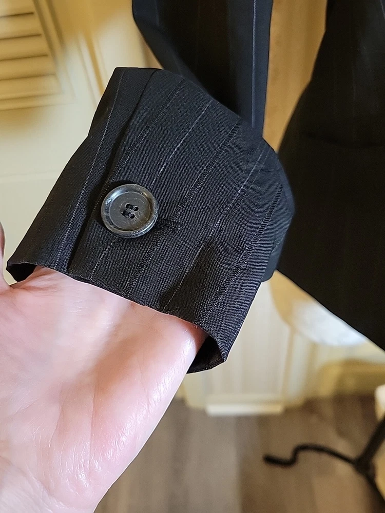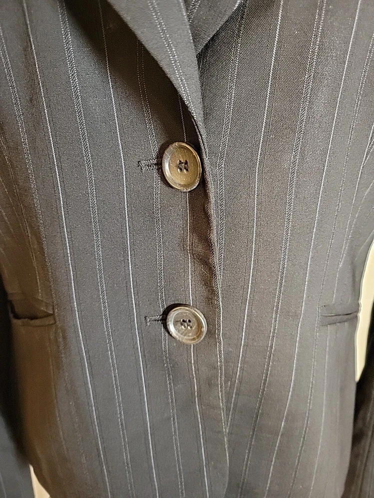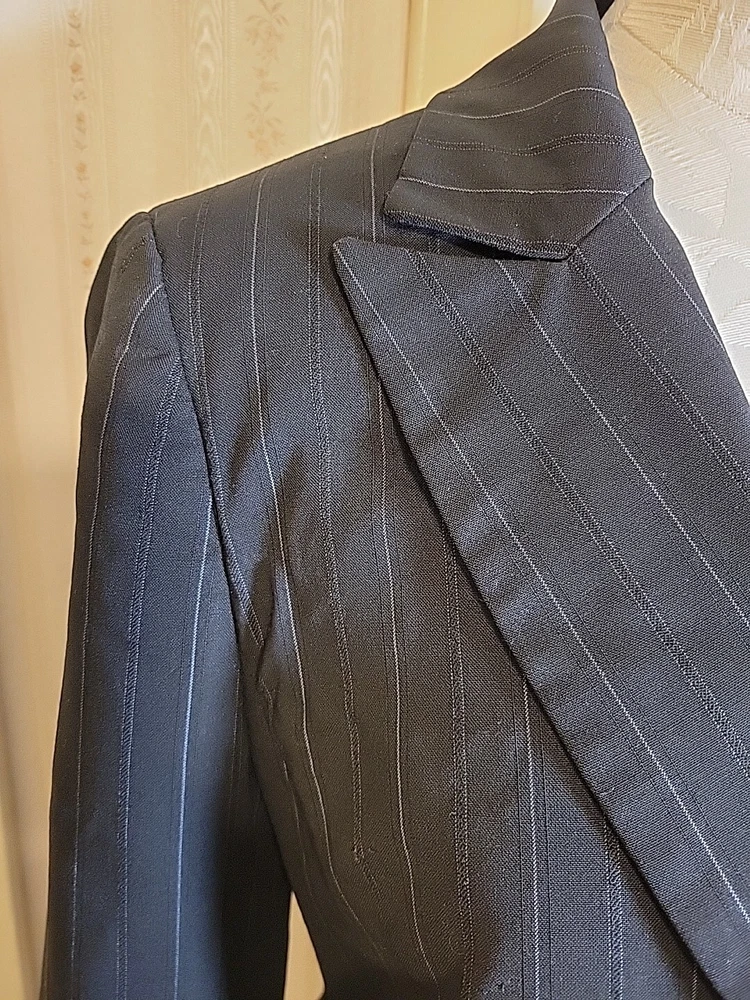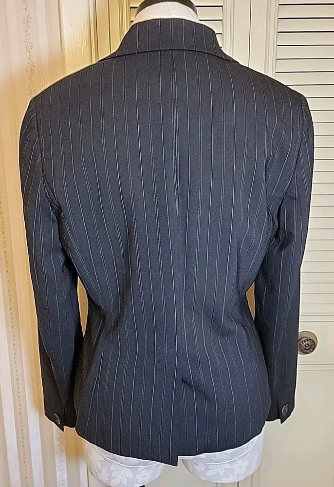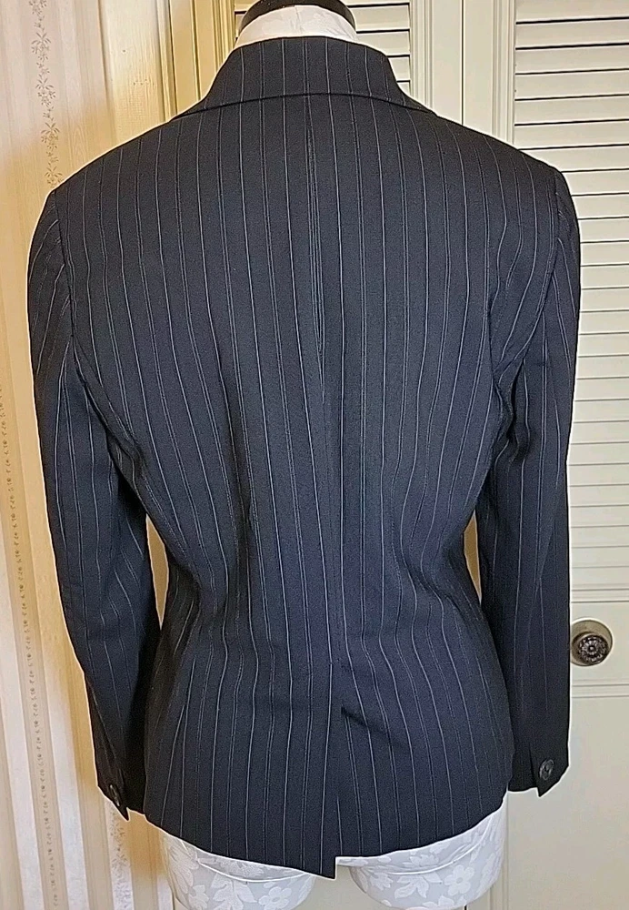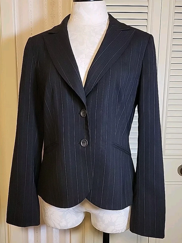 Elevate your wardrobe with this sophisticated Ann Taylor blazer. Crafted from fine Italian fabric, this black blazer with stripes is perfect for any occasion. The blazer features a two-button front button style, one-button sleeve button style, and a length of 24". The jacket is made of 96% virgin wool, 1% other fiber, and 3% lycra spandex, making it lightweight and stretchy. The blazer is perfect for any season, whether it's winter, fall, or spring. The garment care instructions are to dry clean only, and it has minor damage that can be seen in the pictures. The blazer has an armpit to armpit measurement of 19", a shoulder to shoulder measurement of 16", and a waist measurement of approximately 17" (across the front side). This blazer is perfect for going out or any classic occasion.