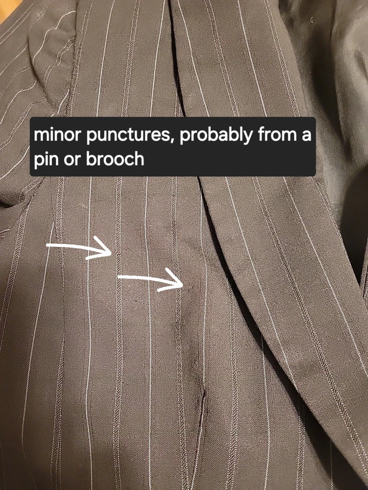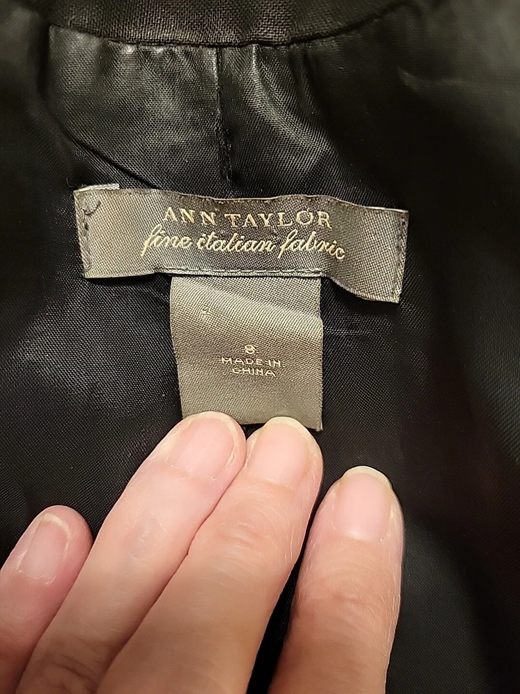 Style: Jacket Country/Region of Manufacture: China Department: Women Type: Blazer Size: 8 Season: Fall, Spring, Winter Garment Care: Dry Clean Only Features: Lightweight, Stretch, shoulder to shoulder 16", armpit to armpit, armpit to armpit 19", waist approx 17", length 24", minor damage - see pictures gtin13: Does not apply Size Type: Regular Jacket Sleeve Button Style: One-Button Pattern: Striped Lining Material: acetate & rayon Brand: Ann Taylor Material: 96% virgin wool, 3% lycra spandex, 1% other fiber Color: Black with Stripes Theme: Classic, Going Out Sleeve Length: Long Sleeve UPC: Does not apply Jacket Front Button Style: Two-Button