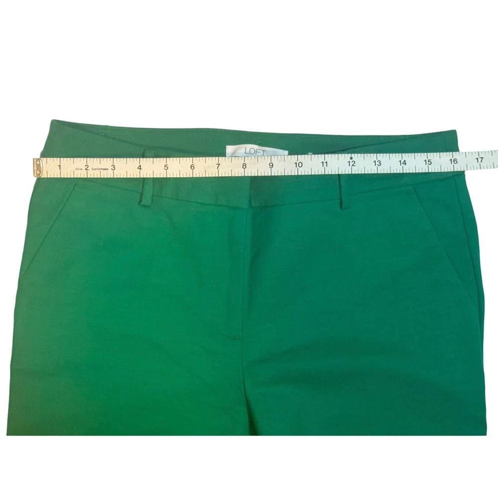Theme: Work, Office, Career, Professional, Christmas, Holiday, Xmas, Business, School Front Type: Flat Front Rise: Mid (8.5-10.5 in) Country/Region of Manufacture: Indonesia Pattern: Solid Features: Stretch, All Seasons Waist Size: 32 in Fit: Slim Brand: Ann Taylor LOFT Department: Women Garment Care: Machine Washable Size: 6 Material: Cotton, Rayon, Spandex Size Type: Regular Closure: Zip Leg Style: Straight Style: Chino Color: Green Season: Fall, Spring, Summer, Winter Inseam: 26 in Accents: Button, Zipper