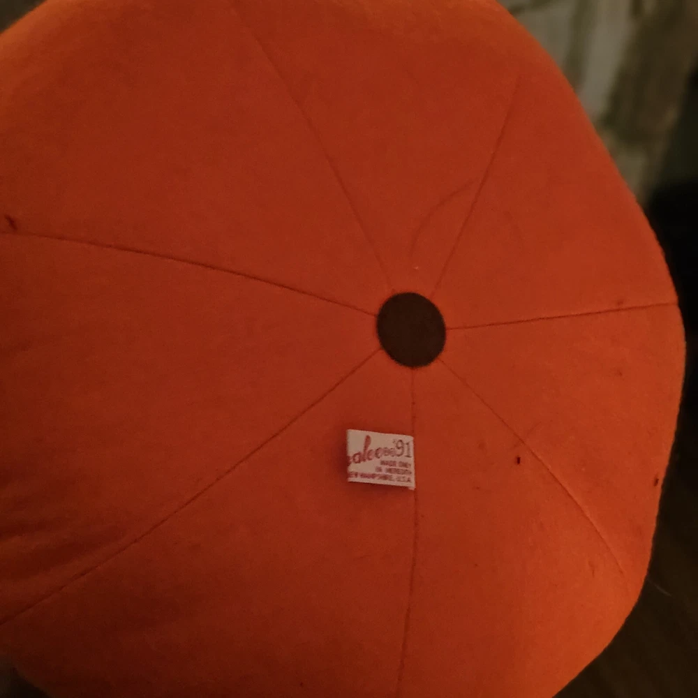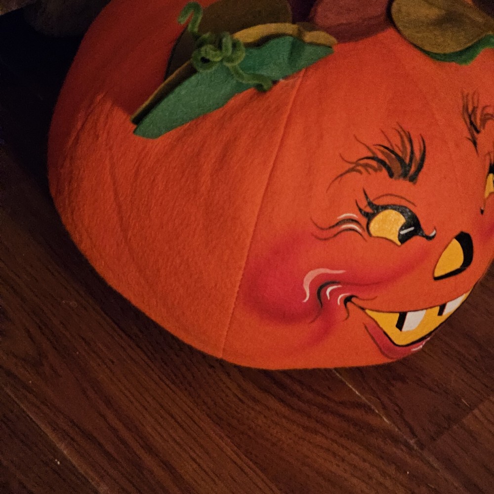 The Annalee Pumpkin Jack-o'-lantern is a vintage Halloween decoration from 1991. Made of orange felt, this kitschy anthropomorphic piece adds a fun and festive touch to any Halloween display. Large see measurements