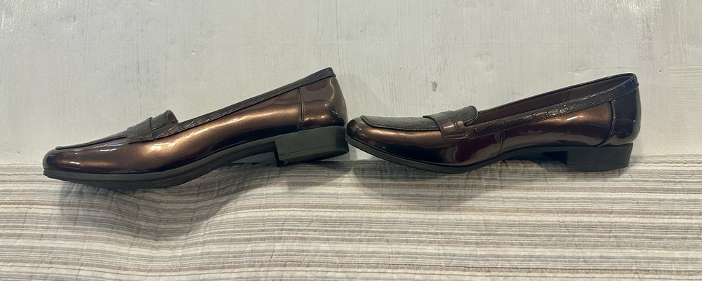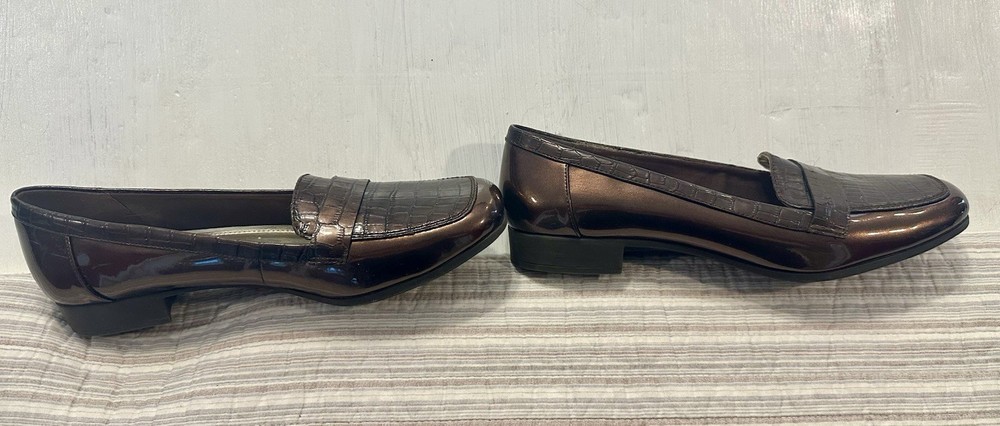 Step into timeless style and all-day comfort with these Anne Klein AK Sport “Vittorio” loafers. Featuring a chic croc-embossed finish and a low heel, these versatile shoes blend fashion and function perfectly. Details: • Brand: Anne Klein AK Sport • Style: Vittorio Loafers • Size: 11M (Medium Width) • Color: Dark Brown • Features: Slip-on design, square toe, low heel • Upper: Man-made (faux croc embossed) • Lining: Textile • Sole: Flexible rubber with great traction • Comfort: iFlex technology for enhanced comfort • Condition: Gently pre-owned with minor wear to insoles and soles (see photos) These are ideal for business casual looks, office wear, or pairing with trousers and skirts for everyday elegance. I do have pets and cannot guarantee no pet hair #AnneKlein #AKSport #VittorioLoafers #WomensShoes #Size11Shoes #ComfortLoafers #CrocEmbossed #WorkWearStyle #BusinessCasual #SlipOnShoes #BrownLoafers #WideFeetFriendly #PrelovedFashion #ClassicStyle #OfficeShoes