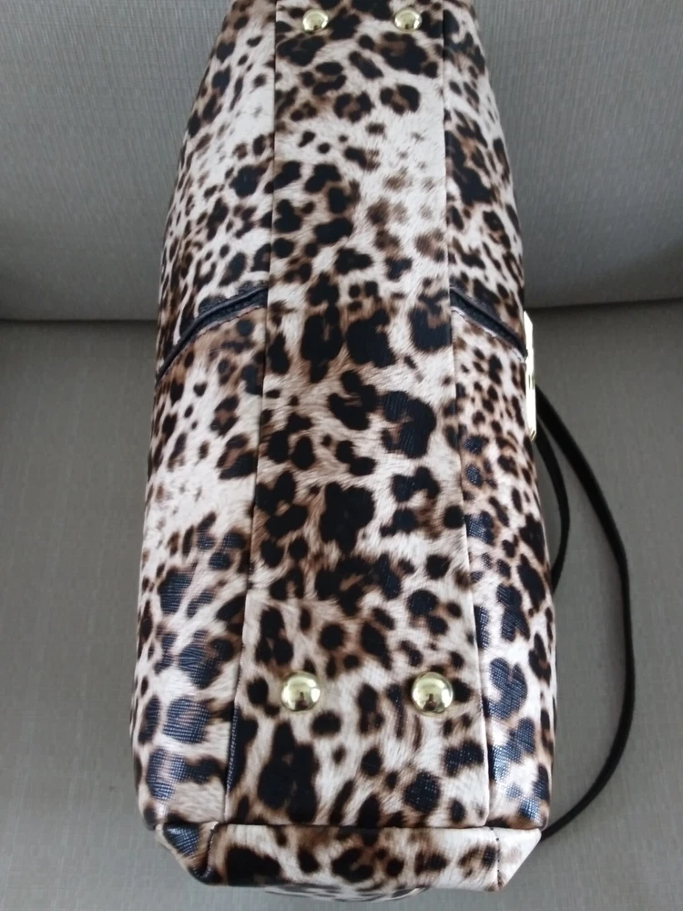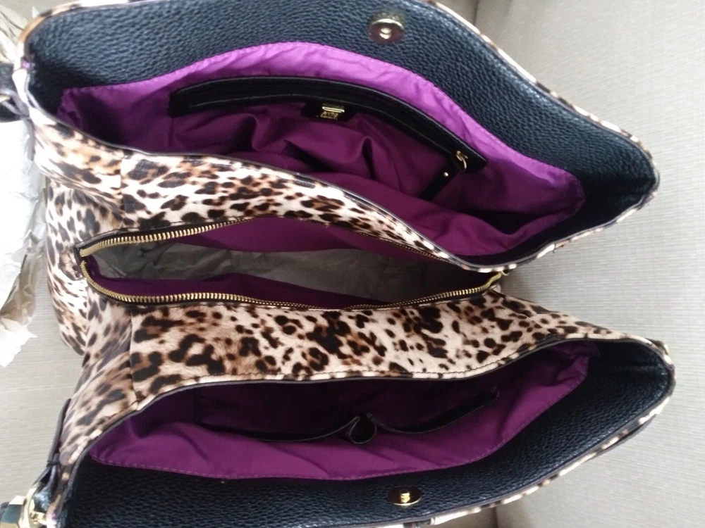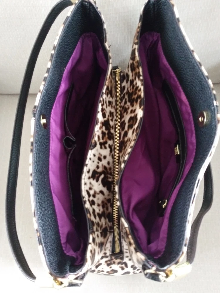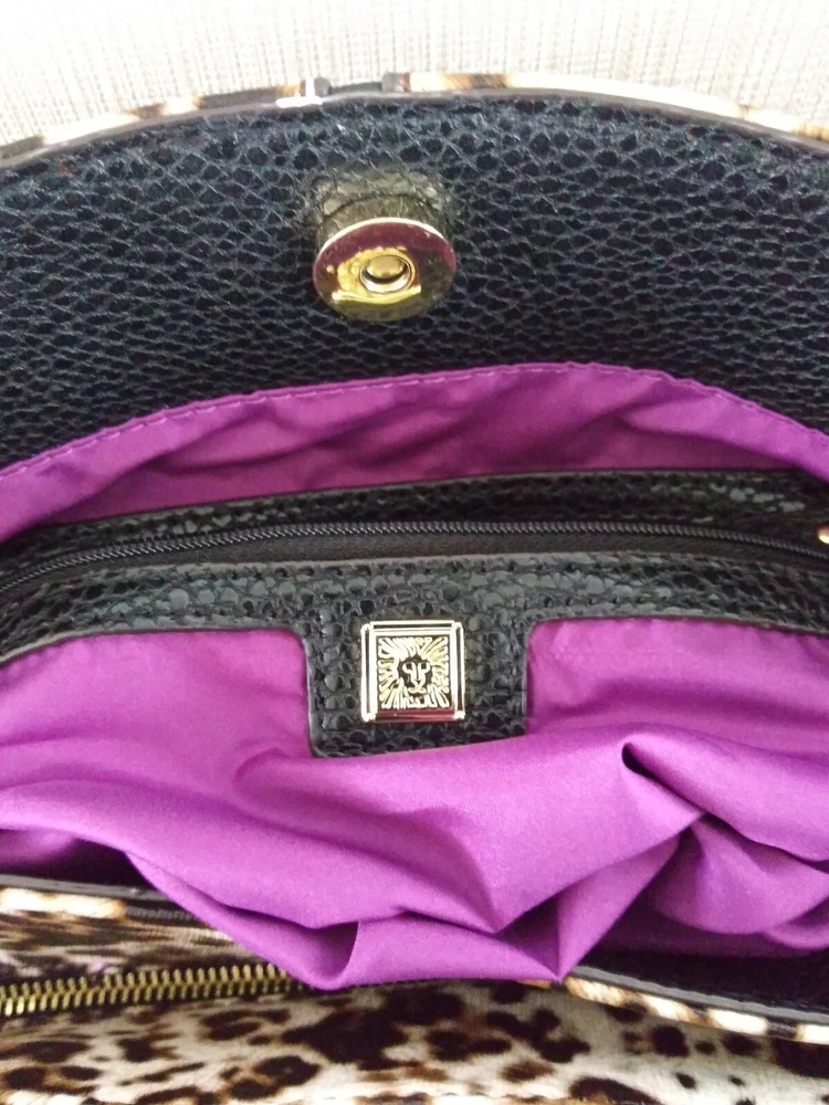 Exterior Material: Faux Leather Lining Material: Polyester Closure: Zip, Snap, Magnetic Hardware Material: Brass Shape: Rectangle Occasion: Travel, Business, Casual Country/Region of Manufacture: China Brand: Anne Klein Product Line: Anne Klein Exterior Color: Multicolor Lining Color: Purple Features: Inner Pockets, Lightweight, Lined Handle Style: Shoulder Strap Pattern: Animal Print Hardware Color: Gold Accents: Logo Handle/Strap Material: Faux Leather Style: Shoulder Bag Fabric Type: Faux Leather Size: Large Handle/Strap Color: Black Character: Cheetah Handmade: No Model: Tote Department: Women Vintage: No Finish: Patent Personalize: No Theme: Animals