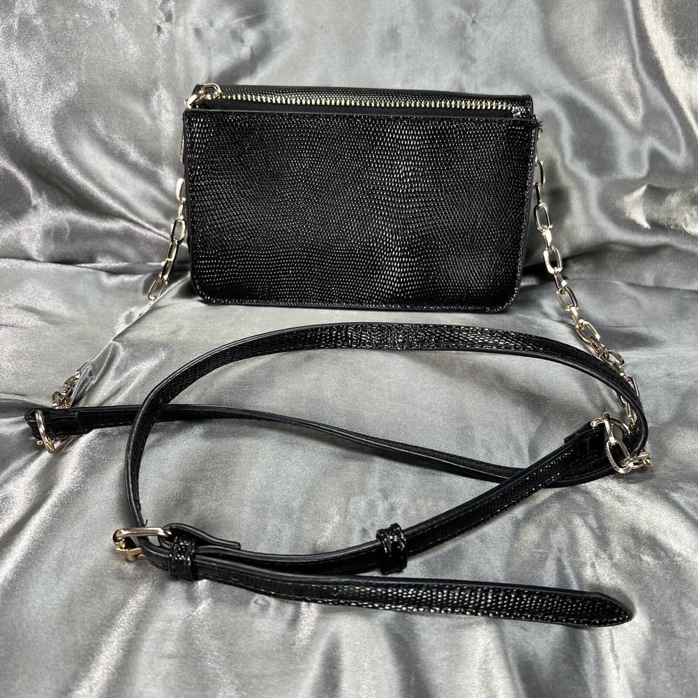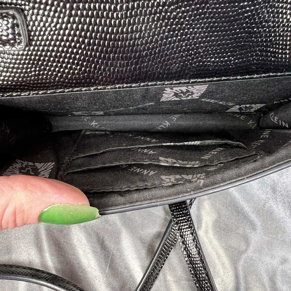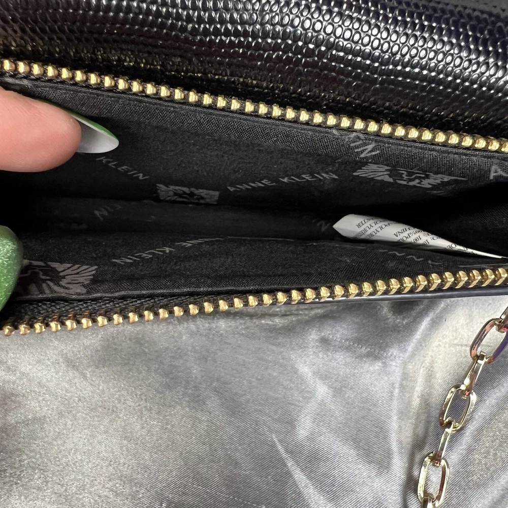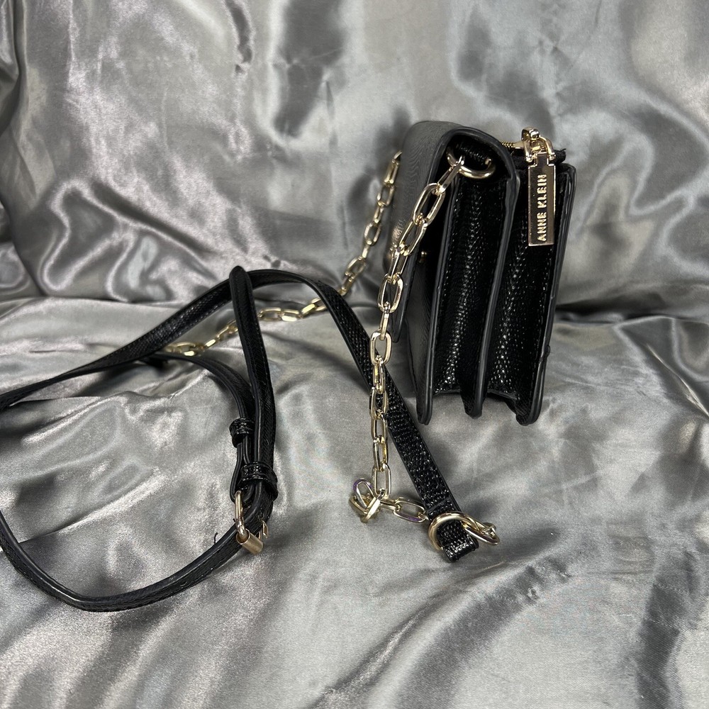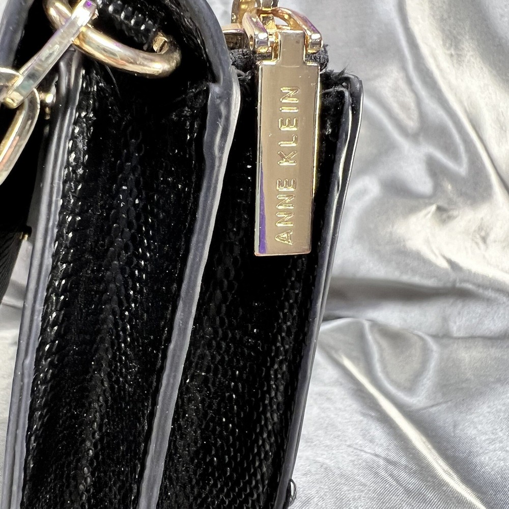 This Anne Klein crossbody mini bag wallet on a chain is a stylish and functional accessory for women. It features a convenient iPhone compartment and is made of black faux leather with gold hardware accents. The bag has a zip closure and measures 2 inches in width and 4 inches in height. The bag is pre-owned but in excellent condition. It is perfect for a night out or for everyday use. The brand is Anne Klein, a trusted name in fashion. This crossbody bag is a great addition to any woman's wardrobe. Anne Klein Crossbody Mini Bag Wallet Clutch on a Leather Chain w/IPhone Compartment EUC Adjustable long strap with chain One flip closure compartment One zipper compartment Three credit card slips 7 inches length 4.5 inches height 2 inches width Reasonable offers welcome! Ships within 24 hours!