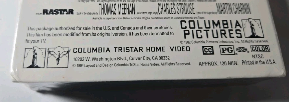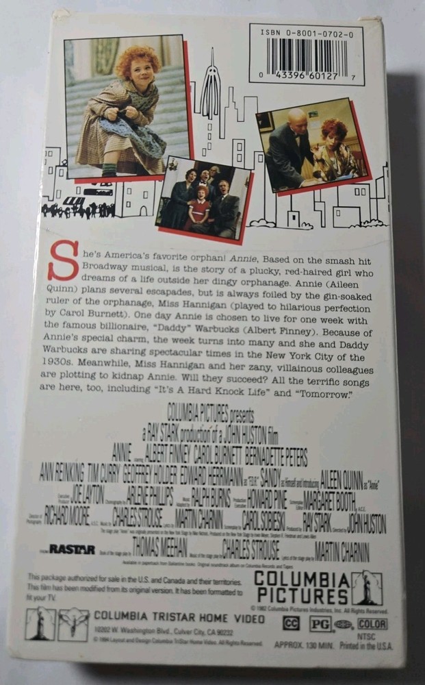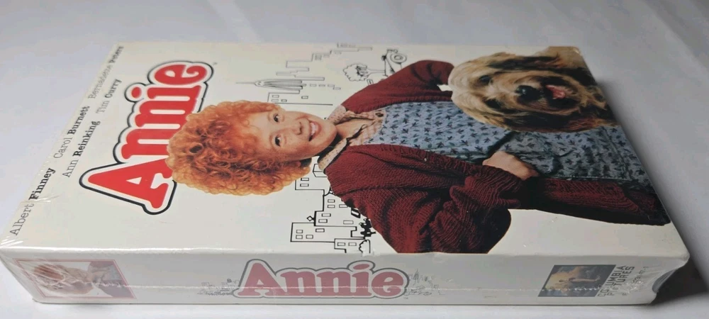The product is a brand new sealed VHS tape of the movie "Annie" by Columbia Pictures. Directed by John Huston, the musical stars Aileen Quinn and Carol Burnett in leading roles. Set in the 1930s, this G-rated film is a classic musical with a Broadway feel, perfect for fans of musicals and performing arts. The VHS tape is in NTSC signal standard, ensuring high quality viewing experience. 1994 printing. Factory Sealed. One small dent on side, otherwise good condition. Please reach out with any questions!