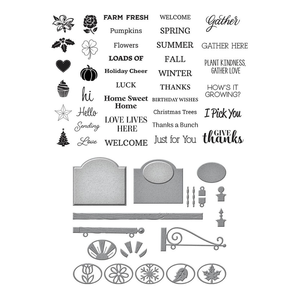 Welcome Sign & Sentiments Clear Stamp & Die Set is from the Country Road Collection by Annie and is the perfect set for this collection! The 14 thin metal cutting dies and 38 clear stamps makes a combination of sign designs with a few that can land inside of a card. Die-cut a detailed sign with so many features that are hard to decide which to create first! What a fun set! The clear stamps are designed to be used with an acrylic block. Country Road is Annie ’ debut collection with . This offering creates a wonderful rural backdrop. It includes all the details such as a wheelbarrow, florals, wooden signs to even fencing parts, and more. A clear stamp set provides not only a wonderful wood sign but sentiments and images to tie everything together. Bring a part of the countryside into your projects! Approximate Size: Dies: Wood Post: 3.86 x 0.20 in./9.80 x 0.50 cm Rounded Post Top: 0.46 x 0.30 in./1.20 x 0.80 cm Pointed Post Top: 0.57 x 0.30 in./1.40 x 0.80 cm Outer Sign: 1.59 x 1.45 in./4.00 x 3.70 cm Sign Inlay: 1.47 x 1.33 in./3.70 x 3.40 cm Oval Inlay (Blank and 6 Decorative): 0.87 x 0.62 in./2.20 x 1.60 cm Straight Hanging Post: 2.12 x 0.19 in./5.40 x 0.50 cm Wrought Iron Sign Hanger: 1.94 x 0.73 in./5.00 x 1.90 cm Hanging Chain (2 pcs): 0.06 x 0.62 in./0.20 x 1.60 cm Hanging Sign Hardware (2 pcs): 0.21 x 0.29 in./0.50 x 0.80 cm Stamps: Home Sweet Home: 1.31 x 0.38 in./3.30 x 1.00 cm Holiday Cheer: 1.26 x 0.15 in./3.20 x 0.40 cm Birthday Wishes: 1.36 x 0.11 in./3.50 x 0.30 cm How's It Growing?: 1.04 x 0.36 in./2.60 x 0.90 cm Christmas Trees: 1.28 x 0.13 in./3.20 x 0.30 cm Give Thanks: 1.22 x 0.39 in./3.10 x 1.00 cm Large Welcome: 1.27 x 0.18 in./3.20 x 0.50 cm Small Welcome: 0.91 x 0.13 in./2.30 x 0.30 cm I Pick You: 1.10 x 0.32 in./2.80 x 0.80 cm Sending: 0.75 x 0.28 in./1.90 x 0.70 cm Hello: 0.63 x 0.28 in./1.60 x 0.70 cm Thanks: 0.89 x 0.15 in./2.30 x 0.40 cm Love: 0.59 x 0.25 in./1.50 x 0.60 cm Farm Fresh: 1.33 x 0.14 in./3.40 x 0.40 cm Luck: 0.49 x 0.15 in./1.50 x 0.40 cm Plant Kindness: 1.21 x 0.42 in./3.10 x 1.10 cm Loads of: 1.02 x 0.14 in./2.60 x 0.40 cm Fall: 0.61 x 0.17 in./1.50 x 0.40 cm Spring: 0.87 x 0.18 in./2.20 x 0.50 cm Winter: 1.00 x 0.18 in./2.50 x 0.50 cm Summer: 1.09 x 0.18 in./2.50 x 0.50 cm Gather: 1.01 x 0.50 in./2.60 x 1.30 cm Hi: 0.34 x 0.43 in./0.90 x 1.10 cm Love Lives Here: 1.25 x 0.44 in./3.20 x 1.10 cm Thanks a Bunch: 1.35 x 0.14 in./3.40 x 0.40 cm Just for You: 1.25 x 0.24 in./3.20 x 0.60 cm Gather Here: 1.36 x 0.16 in./3.50 x 0.40 cm Flowers: 0.72 x 0.15 in./1.80 x 0.40 cm Holly & Berries: 0.70 x 0.45 in./1.80 x 1.10 cm Pumpkin: 0.50 x 0.45 in./1.30 x 1.10 cm Christmas Tree: 0.40 x 0.55 in./1.00 x 1.40 cm Cupcake: 0.35 x 0.49 in./0.90 x 1.30 cm Heart: 0.34 x 0.41 in./0.90 x 1.00 cm Star: 0.49 x 0.51 in./1.30 x 1.30 cm 4 Leaf Clover: 0.50 x 0.55 in./1.20 x 1.40 cm Rose: 0.43 x 0.54 in./1.10 x 1.40 cm Flower: 0.52 x 0.66 in./1.30 x 1.70 cm Welcome Sign & Sentiments Clear Stamp & Die Set is from the Country Road Collection designed by Annie The 14 thin metal cutting dies and 38 clear stamps makes a combination of sign designs with a few that can land inside of a card. Die-cut a detailed sign with so many features that are hard to decide which to create first! ' wafer thin etched dies are designed to cut cardstock, paper, metallic foil and other thin materials and can cut, emboss, and stencil with a single template Designed for the Platinum machines, but in most die cutting machines Various Sizes from 0.06" x 10.62" to 3.86" x 0.20"