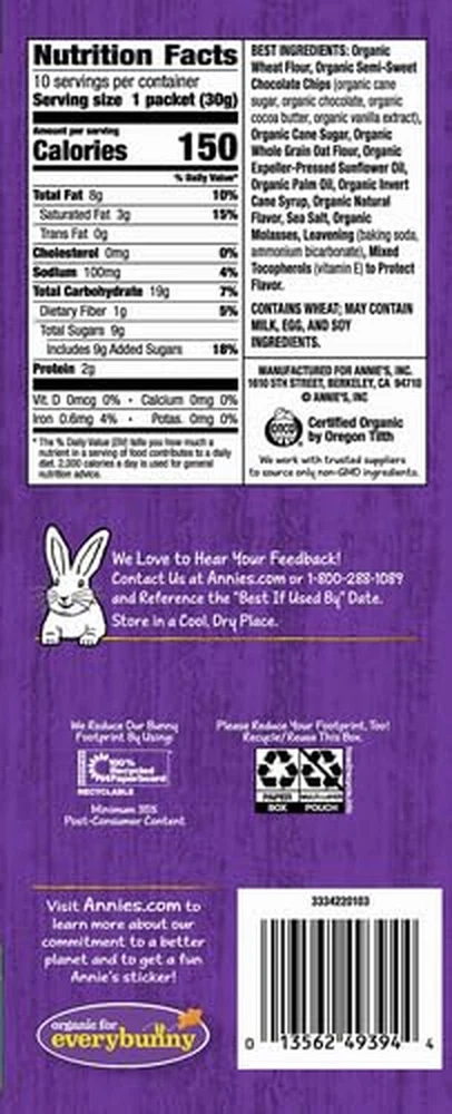 Store New Arrivals Add to Favorite View Feedback Contact Fast deliveries to the customer's home Quality customer service John Make the customers happy! Annie'S Organic Chocolate Chip Cookie Bites, 10 Pouches, 10.5 Oz Description BITE-SIZE COOKIES: Annie's Chocolate Chip Cookie Bites are the little cookies that are big on taste, fun, and chocolatey goodness WHOLESOME INGREDIENTS: No artificial flavors, synthetic colors, or high fructose corn syrup CERTIFIED ORGANIC: They're non-GMO and certified USDA Organic for the goodness you'd expect from Annie's snacks ON-THE-GO TREAT: Perfectly portable dessert for lunches or an anytime treat CONTAINS: One 10.5 oz box of Annie's Organic Chocolate Chip Cookie Bites; 10 pouches Annie's Chocolate Chip Cookie Bites are the little cookies that are big on taste, fun, and chocolatey goodness! With real, organic chocolate chips and bite-size yumminess, kids and adults will come hopping to devour these scrumptious sweet treats. Best of all, they don't contain any high fructose corn syrup, artificial flavors, or synthetic colors. They're also non-GMO and certified USDA Organic. These bite-size treats are the perfect addition to lunches and snack bags for kids and teenagers alike! Grab a box of cookie bites to add fun, chocolate flavor, and hoppiness at snack time. Annie's makes products in over 20 family-friendly categories, from fruit flavored snacks and cereal to mac and cheese. For busy bunnies and families on the go, we help make life a little easier and more delicious by spreading goodness through tasty foods and kindness to the planet. Item model number 10013562493941 Unit Count 10.5 Ounce Style Round Number of Items 1 Product Dimensions 3.63 x 6 x 8.88 inches; 10.56 ounces Country of Origin USA Occasion Birthday Flavor Chocolate Chip Is Discontinued By Manufacturer No Size 1.05 Ounce (Pack of 10) ABOUT US We offer the best prices around on high quality products. Our E-store includes media such as books, movies, music and games while offering electronics, toys, sporting apparel, clothing, tools, general home, garden items and more. SHIPPING We are always working hard to ensure your package arrives as soon as possible. Please understand that some factors like weather, high postal traffic, and the performance of shipping companies are outside of our control. We offer free shipping to the lower 48 states and ship within 2 business days of payment, usually sooner. We do not accept P.O. Boxes. Please provide a physical address. For shipping outside of the continental USA, we only use eBay's Global Shipping Program. The item is shipped to KY and then sent to the rest of the world. International customers are responsible for all duties and taxes. Continue to 'check out' to calculate costs for shipping the item to your country. Messages regarding eBay's Global Shipping Program MUST be directed at eBay EXCLUSIVELY. RETURNS We offer a 30-Day Return Policy on items in which you are not completely satisfied with. You have the option of a full-refund or an exchange of the item. No returns are available on items shipped outside of the USA PAYMENT We accept PayPal. CONTACT US This page content is yet to come Please ad us to your favorite seller and visit again later Thank You CUSTOMER SATISFACTION We try our very best to make sure every customer is completely satisfied. If there's a problem, message us! We're happy to help. WE ACCEPT