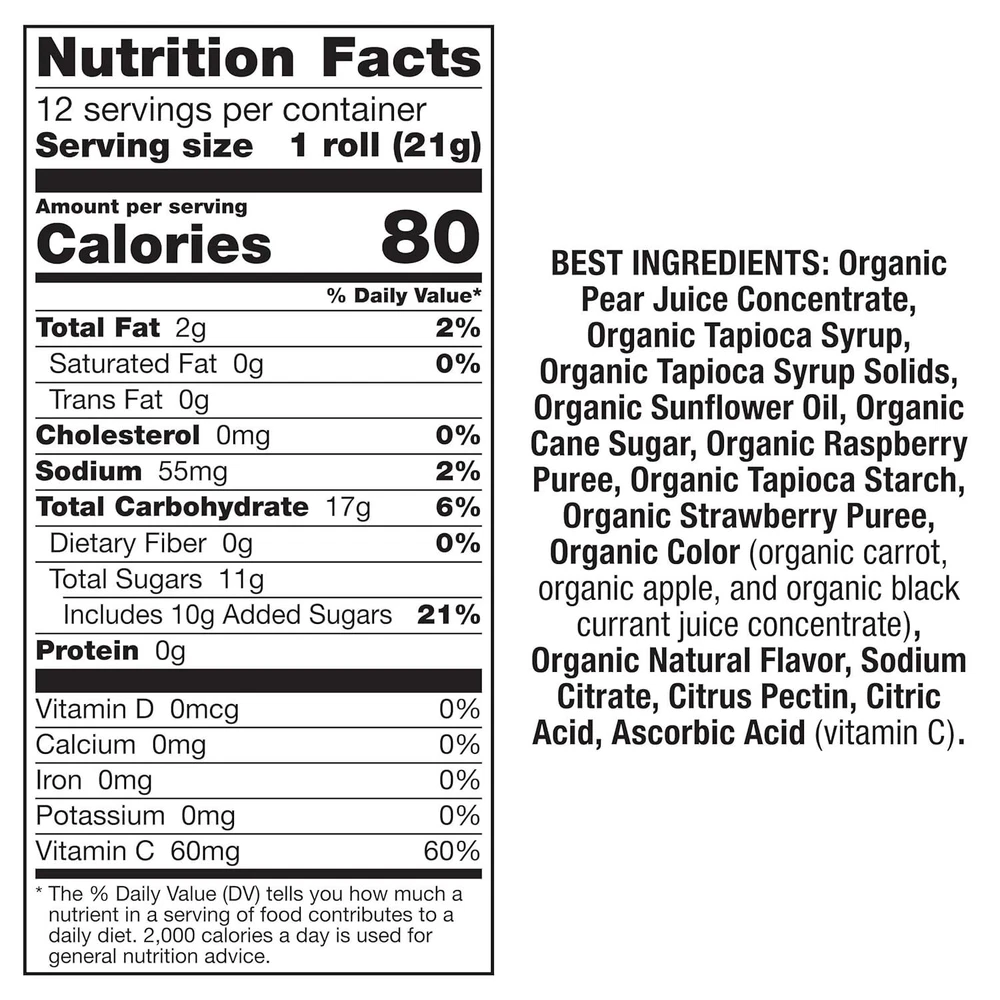 Annie's Organic Fruit Tape, Swirly Strawberry and Bendy Berry Flavors, Variety Pack, 12 Rolls, 9 oz Product Overview Product Name : Annie's Organic Fruit Tape, Swirly Strawberry and Bendy Berry Flavors, Variety Pack Size : 9 Ounces Total Count : 12 Rolls Brand : Annie's Category : Organic Snacks Introduction Discover the delightful and nutritious Annie's Organic Fruit Tape , available in a convenient variety pack that includes two irresistible flavors: Swirly Strawberry and Bendy Berry . Packaged with 12 rolls in total, this 9-ounce bundle offers a fun and fruity snacking experience that's perfect for kids and adults alike. Made with organic ingredients and free from artificial additives, Annie's Fruit Tape provides a wholesome and delicious way to enjoy a fruity treat. Key Features Organic and Nutritious Certified Organic : Crafted with certified organic ingredients, ensuring no synthetic pesticides or GMOs are used. Real Fruit Ingredients : Made with real fruit puree and juice, offering a natural and flavorful snacking option. Fun and Flavorful Variety Pack : Includes both Swirly Strawberry and Bendy Berry flavors, providing a delightful mix of tastes. Kid-Friendly Shapes : Fun tape shapes make these snacks engaging and enjoyable for children. Convenient and Practical Portable Snacking : Individually wrapped rolls make it easy to take these snacks on the go, whether for lunchboxes, picnics, or travel. Multi-Pack Convenience : With 12 rolls in each pack, there's plenty to share and enjoy. Detailed Specifications Product Details Weight : 9 ounces total (0.75 ounces per roll) Count : 12 rolls (6 of each flavor) Brand : Annie's Package Dimensions : 10 x 6 x 2 inches Ingredients and Nutrition Key Ingredients : Organic apple puree concentrate, organic tapioca syrup, organic sugar, organic strawberry puree concentrate, organic berry puree concentrate, organic lemon juice concentrate. Allergens : Gluten-free. Made in a facility that processes other allergens, so check packaging for detailed allergen information. Nutrition Information : Each serving provides essential nutrients. Detailed nutritional facts per serving are available on the packaging, including calories, sugar content, and vitamins. Benefits of Annie's Organic Fruit Tape Healthy and Wholesome Organic Ingredients : Made with high-quality organic ingredients that are free from synthetic pesticides and GMOs. Real Fruit Goodness : Contains real fruit puree and juice, ensuring a nutritious and natural snack. Deliciously Flavored Swirly Strawberry and Bendy Berry : Enjoy the delightful and vibrant flavors of strawberry and mixed berry. Appealing to Kids : Fun tape shapes and delicious flavors make these snacks a favorite among children. Perfect for Any Occasion Versatile Snacking : Great for school lunches, road trips, or as an afternoon snack. Shareable Pack : The pack of 12 rolls ensures you have enough to share with friends and family. Usage Suggestions Creative Snack Ideas Lunchbox Treat : Perfect addition to your child’s lunchbox for a wholesome and fun treat. Trail Mix : Combine with nuts and dried fruit for a homemade trail mix that’s perfect for hiking or road trips. Dessert Garnish : Use pieces of fruit tape to decorate cupcakes, cakes, or ice cream for a fun and fruity touch. Snack Platter : Include in a snack platter with cheese, crackers, and other finger foods for a delightful party treat. Customer Testimonials What Our Customers Are Saying "Favorite Snack for My Kids" : "My children absolutely love these fruit tapes. The strawberry and berry flavors are delicious, and I feel good knowing they’re eating something organic." - Jessica M. "Great for On-the-Go" : "These are perfect for keeping in my bag for a quick and healthy snack. The individual packaging is really convenient." - Michael L. "Fun and Tasty" : "The fun tape shapes and the great flavors make these a hit in our household. We all enjoy them!" - Emily S. Frequently Asked Questions Are these snacks gluten-free? Yes, Annie's Organic Fruit Tape is gluten-free, making it suitable for those with gluten sensitivities or celiac disease. What makes these snacks organic? Annie's Organic Fruit Tape is made with certified organic ingredients, meaning they are grown without synthetic pesticides, fertilizers, or GMOs. Can I recycle the packaging? Yes, the packaging is recyclable. Please check with your local recycling program for specific guidelines. Are there any artificial flavors or preservatives? No, Annie's Organic Fruit Tape is free from artificial flavors and preservatives, offering a natural and wholesome snacking option. How should I store these snacks? Store in a cool, dry place to maintain freshness. Once opened, keep the snacks in an airtight container for best results. Conclusion Annie's Organic Fruit Tape, Swirly Strawberry and Bendy Berry Flavors offers a perfect combination of delightful flavors, fun shapes, and wholesome ingredients. With the convenience of individually wrapped rolls in a 9-ounce variety pack, these snacks are ideal for any occasion, whether it's a quick treat, a lunchbox addition, or a snack for sharing with friends and family. Made with certified organic ingredients and free from artificial flavors and preservatives, Annie's Fruit Tape provides a nutritious and delicious snacking option you can feel good about. Enjoy the delightful flavors and make snack time more enjoyable with Annie's Organic Fruit Tape. Order your pack of 12 rolls today and experience the delicious and wholesome goodness of Annie's! FRUIT FLAVORED TAPE: Certified organic fruit flavored tape rolls are equal parts fun and delicious REAL INGREDIENTS: No artificial flavors, synthetic colors or high fructose corn syrup MADE WITH ORGANIC FRUIT JUICE: These fruit flavored snacks are made with organic pear juice concentrate (See nutrition panel for a complete list of ingredients; They are not intended to replace fruit or vegetables in the diet) GLUTEN FREE: Annie's organic 