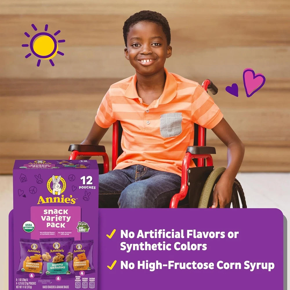 Annie's Organic Variety Pack - Delicious and Nutritious Snack Assortment Product Overview: Indulge in the wholesome goodness of Annie's Organic Variety Pack, featuring a delectable assortment of cheddar bunnies, bunny grahams, and cheddar squares. This pack contains 12 pouches, totaling 11 oz, of delicious and nutritious snacks that are perfect for kids and adults alike. Made with high-quality organic ingredients, these snacks offer a satisfying crunch and irresistible flavor that will leave you coming back for more. Key Features: 1. Organic Ingredients: Annie's Organic Variety Pack is made with certified organic ingredients, ensuring that you're getting snacks that are free from synthetic pesticides, artificial flavors, and preservatives. Each bite is packed with wholesome goodness and goodness. 2. Assorted Snacks: This variety pack includes three of Annie's most popular snacks: Cheddar Bunnies: Crunchy baked crackers shaped like adorable bunnies and flavored with real cheddar cheese. Bunny Grahams: Sweet and crunchy graham crackers in cute bunny shapes, perfect for snacking on-the-go. Cheddar Squares: Bite-sized crackers made with real cheddar cheese for a savory and satisfying treat. 3. Convenient Packaging: The snacks come in individual pouches, making them convenient for packing in lunchboxes, taking on road trips, or enjoying as a quick snack at home or in the office. Each pouch is perfectly portioned to satisfy your cravings without overindulging. 4. Kid-Friendly: Annie's snacks are loved by kids for their fun shapes and delicious flavors, making them a great option for school lunches or afternoon snacks. Plus, parents can feel good about serving these organic snacks to their little ones. 5. Versatile Use: Whether you're craving something savory or sweet, Annie's Organic Variety Pack has you covered. Enjoy them as standalone snacks, pair them with your favorite dips or cheeses, or incorporate them into recipes for added flavor and crunch. 6. Trusted Brand: Annie's is a trusted brand known for its commitment to using organic and natural ingredients in its products. With Annie's, you can trust that you're getting snacks that are not only delicious but also better for you and the planet. Package Contents: 4 pouches of Cheddar Bunnies (3 oz each) 4 pouches of Bunny Grahams (2.5 oz each) 4 pouches of Cheddar Squares (2.5 oz each) Treat yourself and your family to the delightful flavors of Annie's Organic Variety Pack, and snack guilt-free knowing that you're enjoying wholesome and delicious treats. ANNIE'S SNACKS VARIETY PACK: Three snackable, tasty options - Cheddar Bunnies, Bunny Grahams and Cheddar Squares WHOLESOME INGREDIENTS: They're made with no artificial flavors or synthetic colors CERTIFIED ORGANIC: Certified organic ingredients for the goodness you'd expect from Annie's Organic snacks QUICK AND EASY SNACK: Take these snacks to soccer games, field trips and more to satisfy sweet or cheesy cravings CONTAINS: One 11 oz Variety Pack of Annie's Organic Variety Pack, Cheddar Bunnies, Bunny Grahams and Cheddar Squares; 12 pouches Your favorite Annie's Organic Snack Packs come together in one hoppy variety pack. With Cheddar Bunnies, Cheddar Squares and Friends Bunny Grahams, there's a tasty kids' snack for everybunny. Whether you want something sweet or cheesy, this pack has your cravings covered. These are the yummy bunnies that are enjoyed by kids, adults and all ages. Each organic snack comes in a perfectly portable pouch for lunchboxes, soccer games and more. Plus, parents will love that these snacks are made with non-GMO ingredients and have no artificial flavors or synthetic colors. Annie's makes products in over 20 family-friendly categories, from fruit-flavored snacks and cereal to mac and cheese. For busy bunnies and families on the go, we help make life a little easier and more delicious by spreading goodness through tasty foods and kindness to the planet.